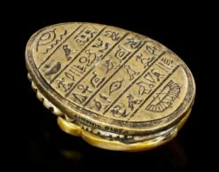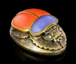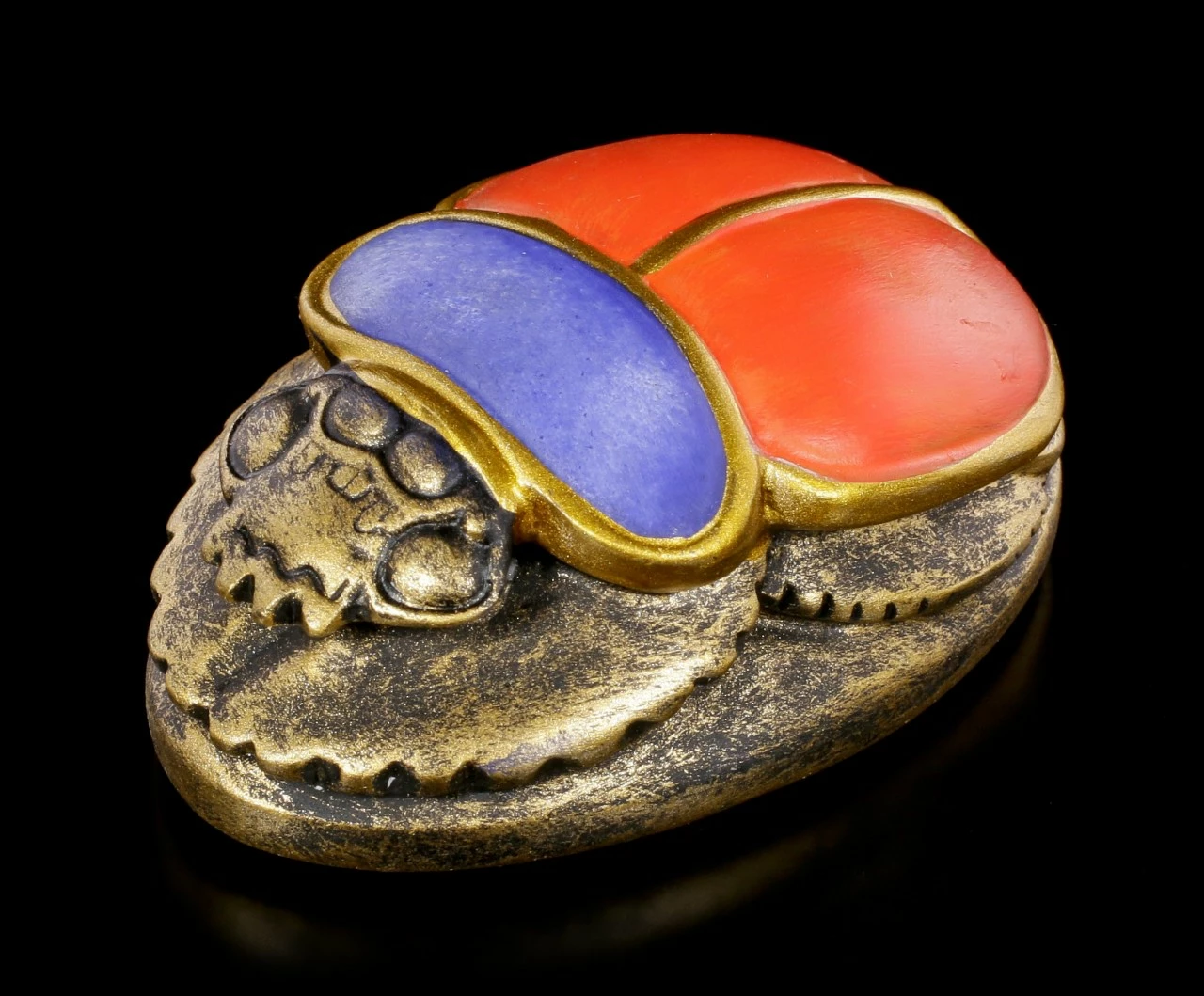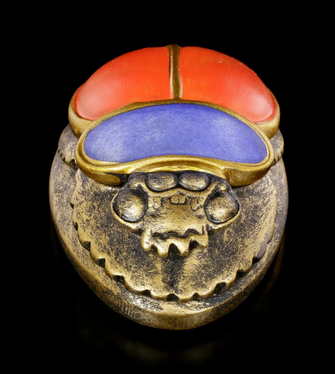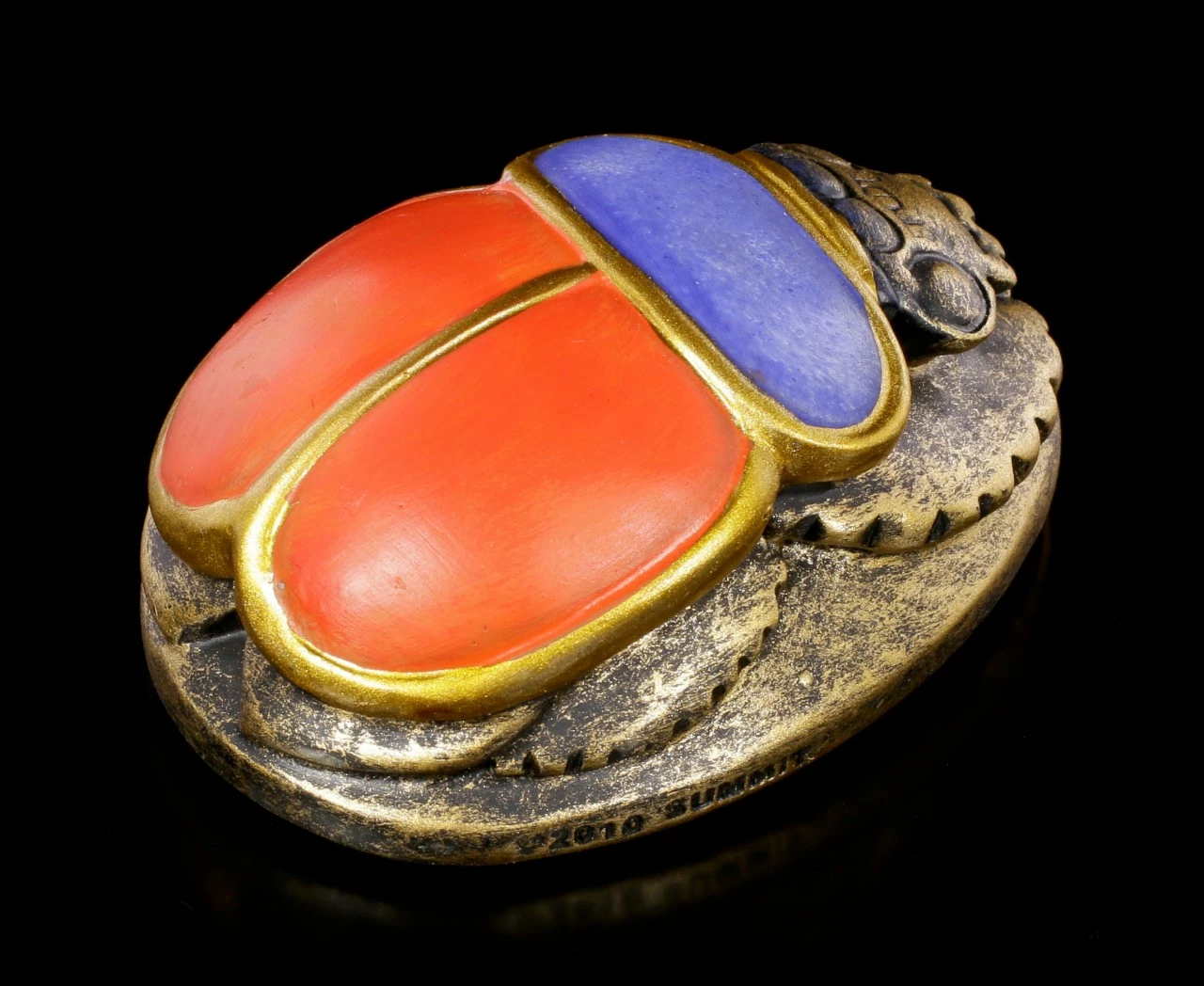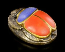 Der kleine bunte Skarabäus in Rot und Blau ist eine wunderbare Ergänzung zu jeder ägyptischen Sammlung. Auf der Unterseite verborgen befinden sich reliefartig gravierte Hieroglyphen. Der Skarabäus aus sorgfältig handbemaltem Kunststein (Polyresin) ist aus der Serie Ancient Egypt.
