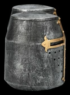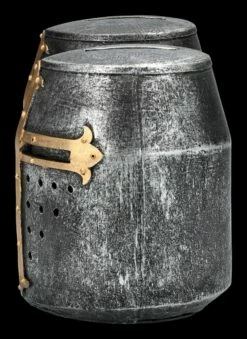 Auch kleine Ritter brauchen für das eine oder andere mal einen Notgroschen. Mit diesem Kreuzritterhelm lässt es sich auch gleich mit dem besten Freund gemeinsam sparen, denn die tolle Spardose gibt es gleich im Doppelpack. Die silberfarbenen und mit goldenen Akzenten handbemalten Kreuzritterhelme im 2er Set sind je 10 cm hoch, je 7,5 cm breit und je 8,5 cm tief. Sie sind aus Kunststein (Polyresin) gefertigt und haben auf der Unterseite eine Entnahmeöffnung. Schon etwas aufgefüllt, sind diese beiden Kreuzritterhelme als Spardose auch ein perfektes Geschenk für kleine und große Ritter.