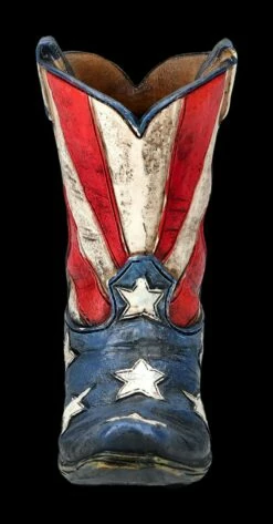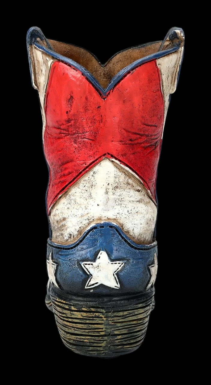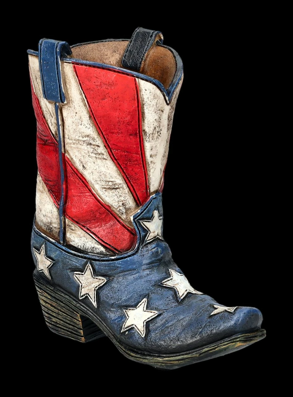 Ein tolles Geschenk für Cowboys und Western-Fans ist dieser 12 cm hohe, 11 cm breite und 6 cm tiefe Stiftebecher in Form eines Cowboy-Stiefels aus den USA. Wer diesen Stiefel aus handbemaltem Kunststein (Polyresin) auf einem Schreibtisch entdeckt, weiß sofort, dass er einen Western-Fan vor sich hat. Innen hat er mit H 10 cm x B: 4 cm x T: 3 cm Platz für die wichtigsten Stifte. Die Lieferung erfolgt ohne Dekoration.
