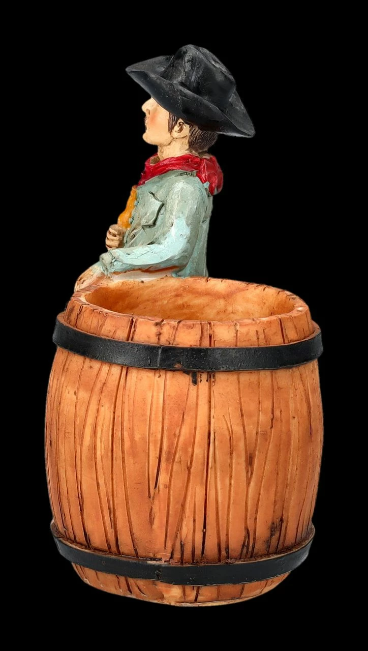 Gerade hat sich der durstige Cowboy ein Bier aus der Bar geholt. Nun steht er lässig an ein Fass gelehnt da und scheint die Umgebung aufmerksam zu beobachten. Western-Fans werden begeistert sein, wenn sie diesen 11,5 cm hohen, 13,5 cm breiten und 6 cm tiefen Stiftebecher mit der Cowboy-Figur als Geschenk bekommen. Der Stiftebecher wurde aus handbemaltem Kunststein (Polyresin) gefertigt und wer ihn auf einem Schreibtisch entdeckt, weiß sofort, dass er einen Western-Fan vor sich hat. Innen hat er mit H 5 cm x B: 4,5 cm x T: 4,5 cm Platz für die wichtigsten Stifte. Die Lieferung erfolgt ohne Dekoration.