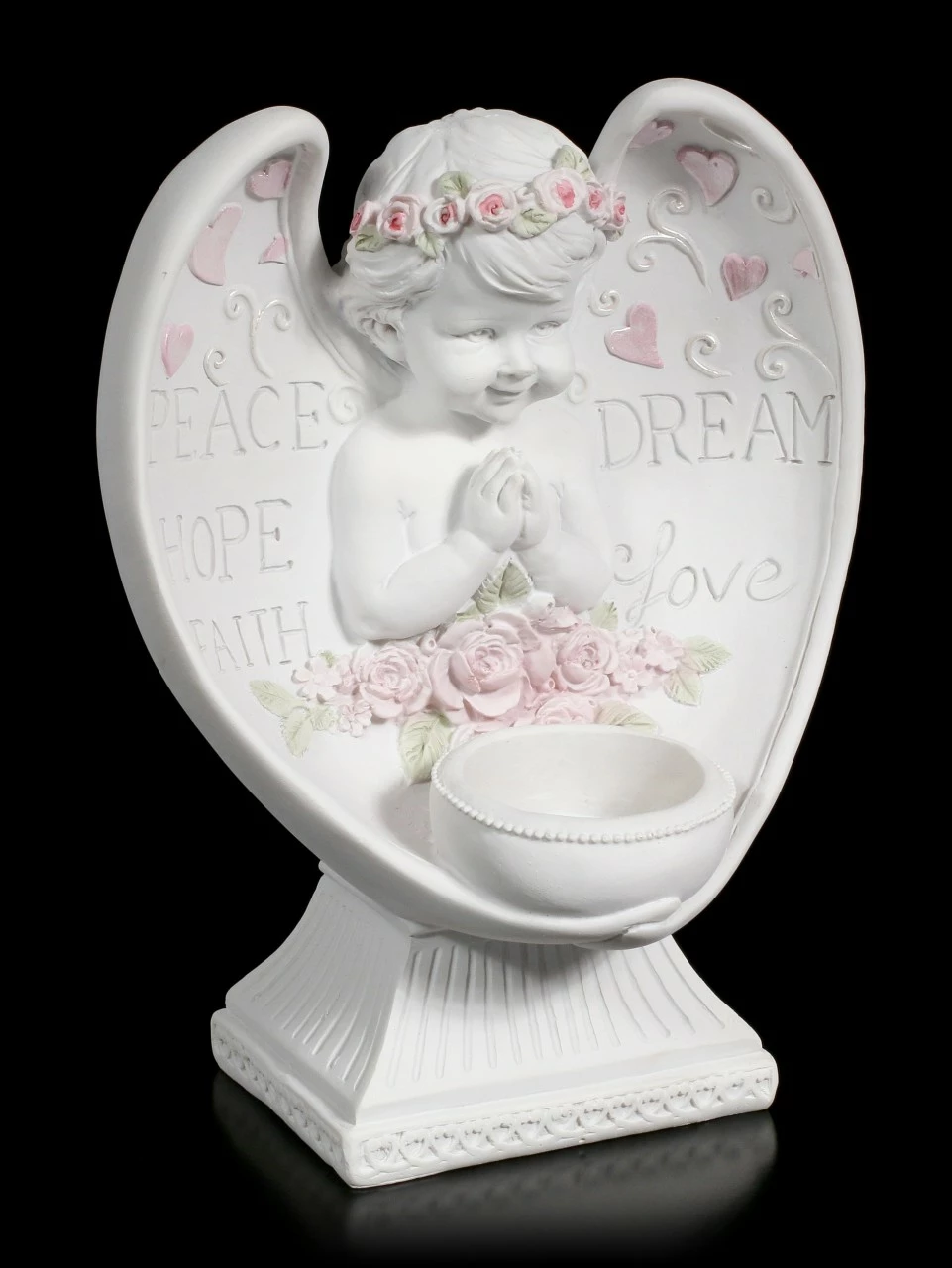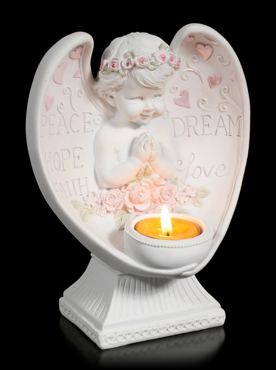 Dieser Teelichthalter schenkt Ihrer Wohnung eine friedvolle Atmosphäre. Der liebevoll lächelnde Cherub Engel betet für Sie und Ihre Lieben.