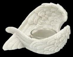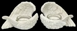 ‚Denkst du an Engel, so bewegen sie ihre Flügel‘, sagt der Volksmund. Nun, bewegen werden sich diese detailreichen Engelsflügel aus liebevoll handbemaltem Kunststein (Polyresin) zwar nicht, aber sie behüten die Flammen der Teelichter, die von den Flügeln gehalten werden. Die wunderbaren je 7,5 cm hohen, je 12 cm breiten und je 8,5 cm tiefen weißen Engelsflügel kommen im 2er Set. Sie sind ein schönes Geschenk, das man sich mit lieben Freunden teilen kann, sie sind aber auch für jeden Hochzeitstisch eine fantastische Deko. Die Lieferung erfolgt ohne Teelichter.