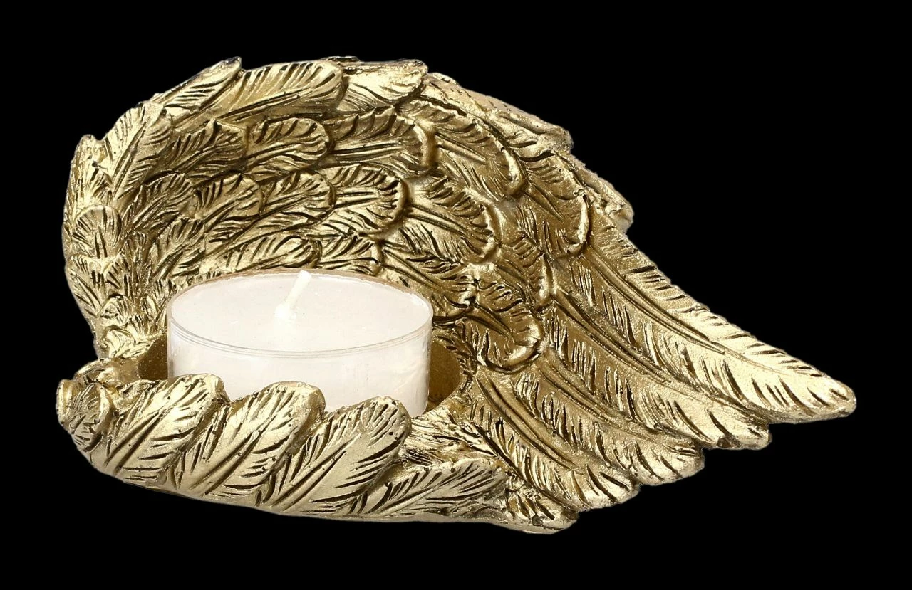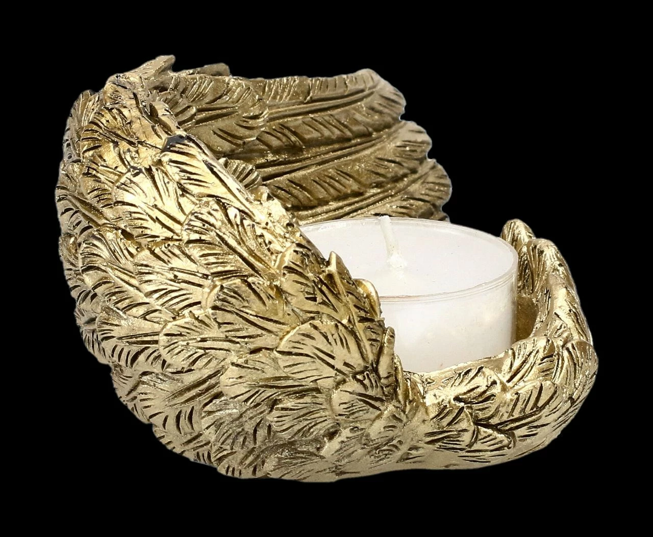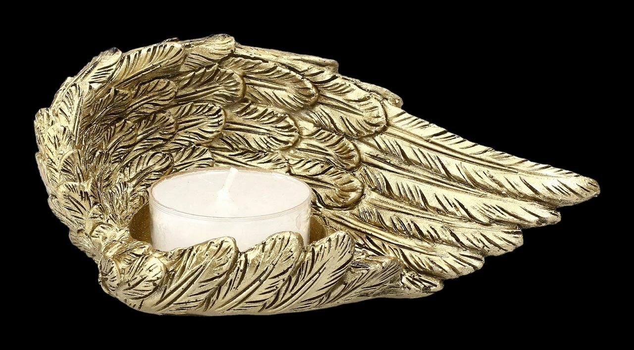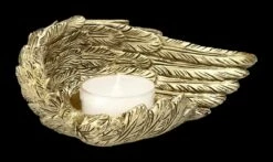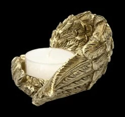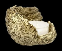 Der liegende goldene Engelsflügel als Teelichthalter wurde sehr detailreich aus handbemaltem Kunststein (Polyresin) gefertigt. Mit der Höhe von 5 cm, der Breite von 13,5 cm und der Tiefe von 8 cm wird er – vielleicht auch gemeinsam mit dem schönen stehenden Engelsflügel aus unserem Shop – garantiert zum Mittelpunkt in Ihrer Dekoration. Die Lieferung erfolgt ohne Teelicht.