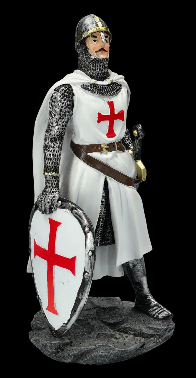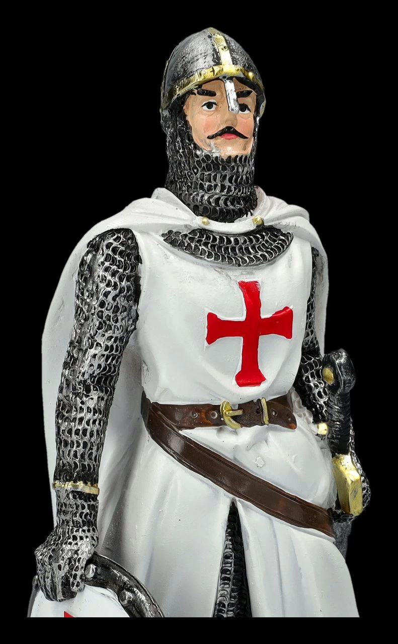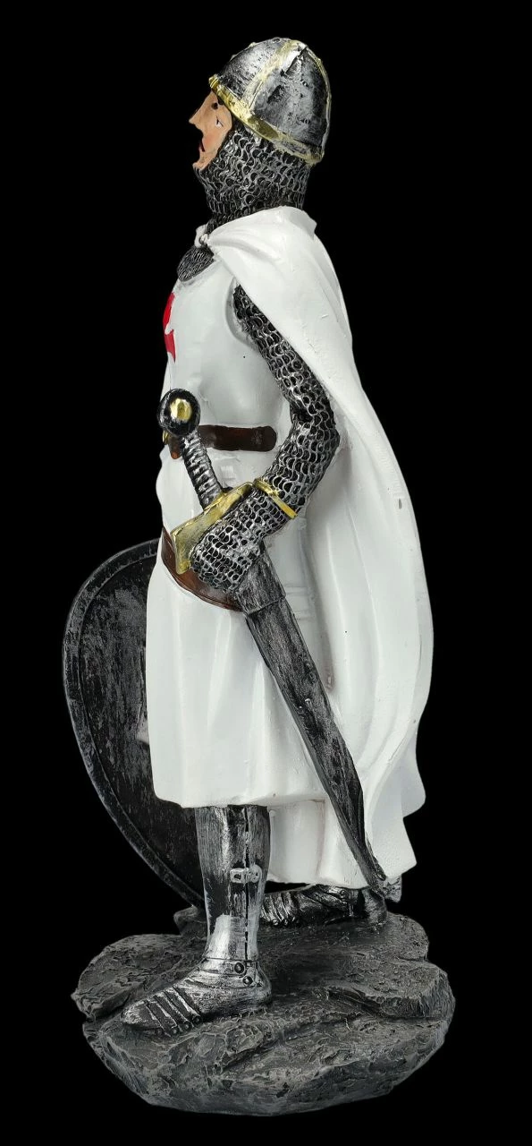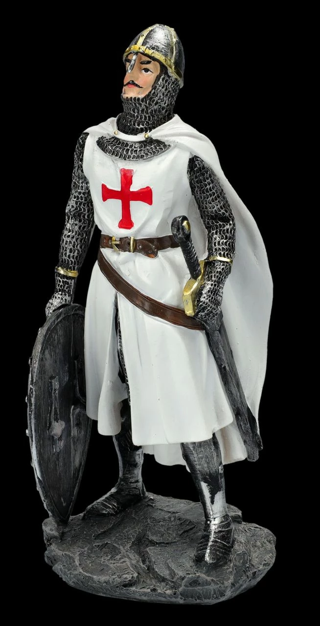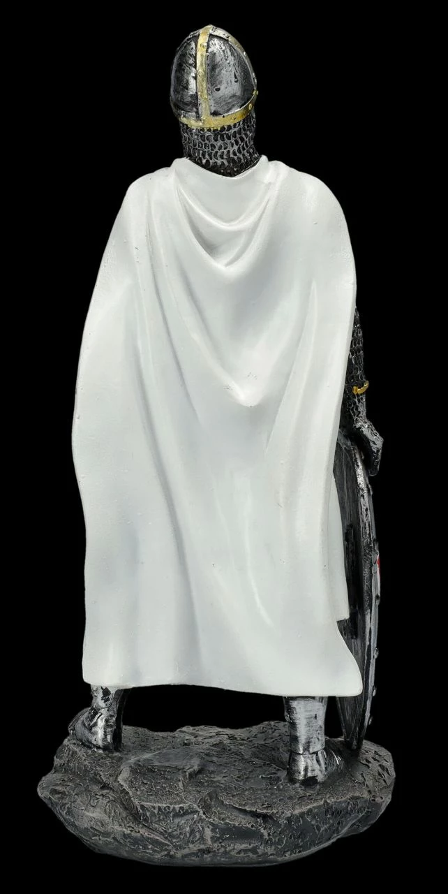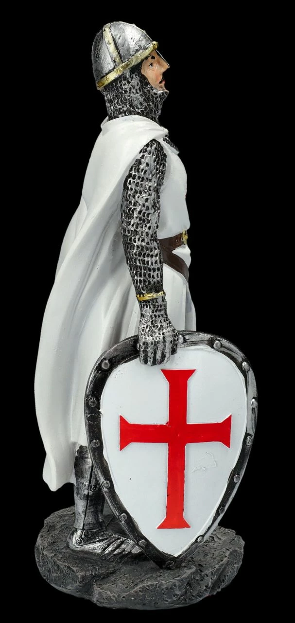 Die imposante Tempelritter Figur stützt sich auf Schild und versprüht Stärke