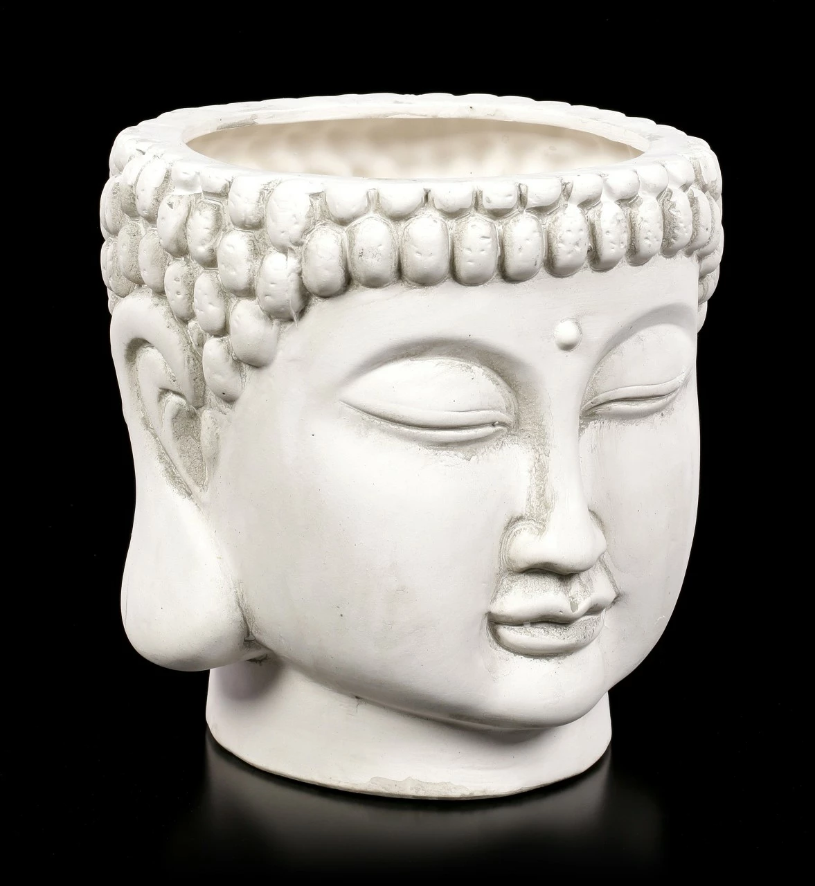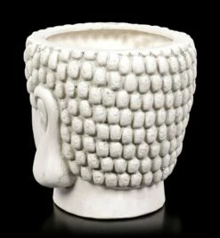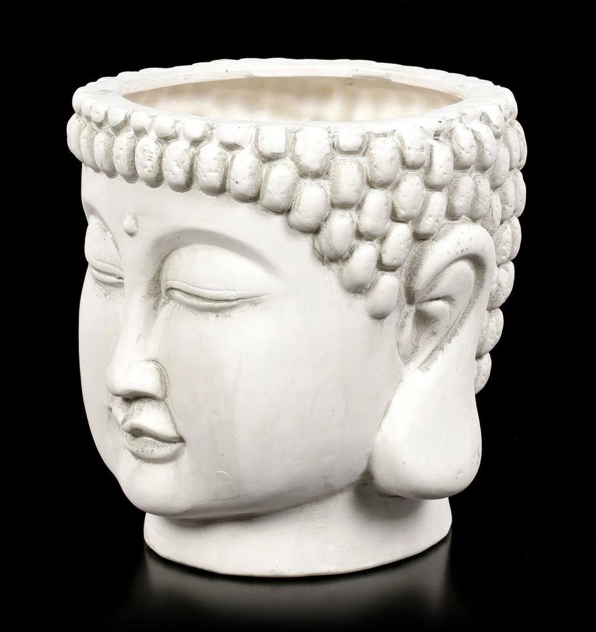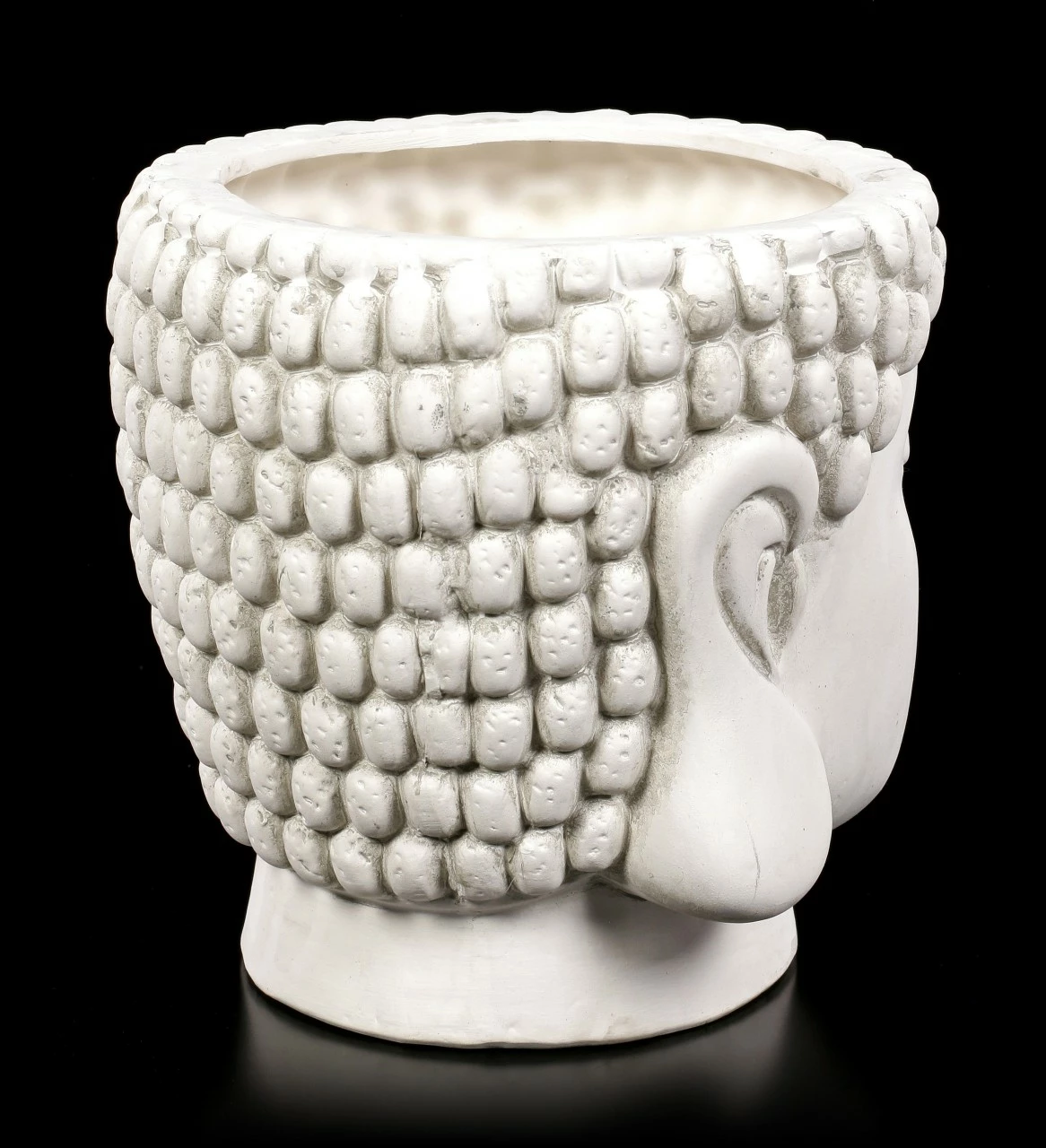 Dieses weiße Terrakotta Pflanzgefäß in Form eines Thai Buddha Kopfs verleiht Gärten oder Wohnungen einen Hauch von Zen – Ruhe und Gelassenheit. Der Übertopf lässt sich vielseitig bepflanzen und gestalten.