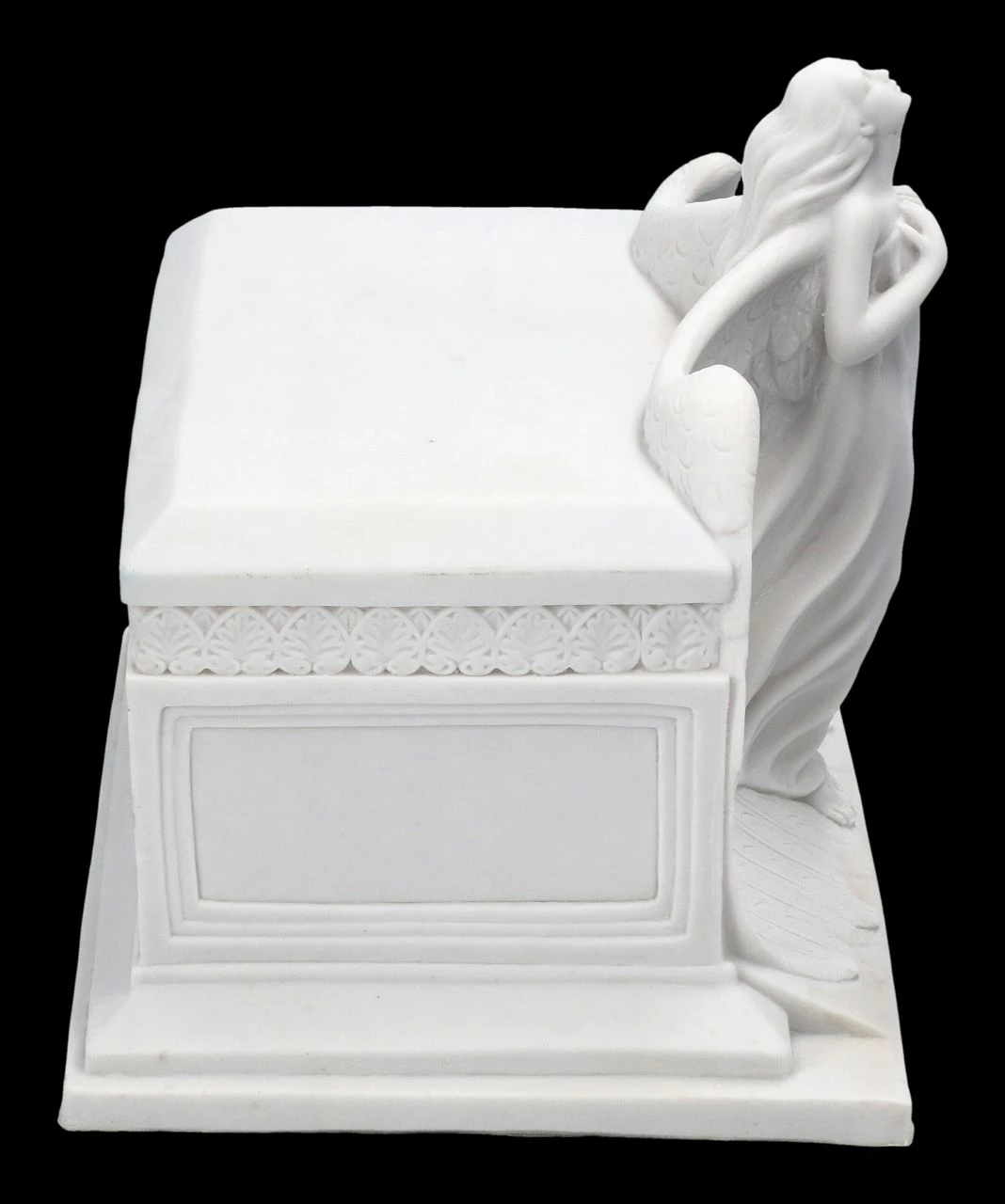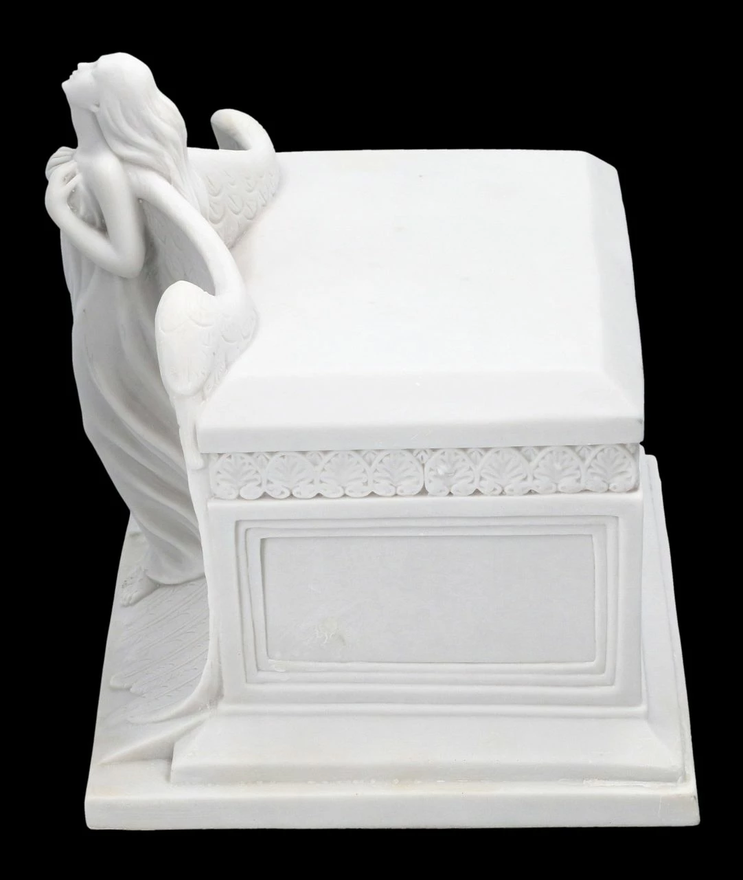 Mit weit ausgebreiteten Flügeln steigt der wunderschöne Engel empor, um die Seele Ihres treuen tierischen Freundes auf der Straße in die Ewigkeit zu begleiten. Die wunderschöne Urne in Form eines Grabmals für Ihren treuen Begleiter spendet Ihnen mit dem zauberhaften Engel sicher Trost, denn Sie spüren, dass auch Sie in Ihrer Trauer nicht allein gelassen werden. Der hinreißende Engel als himmlisches Wesen wird Ihnen zeigen, dass sich Ihr Liebling in guten Händen befindet! Die detailreich und sorgfältig aus handbemaltem Kunststein (Polyresin) gefertigte Tier Urne wirkt durch ihre schlichte weiße Farbe sehr edel. Mit der Höhe von 24 cm (Höhe Urne: 15 cm), der Breite von 27 cm und der Tiefe von 20,5 cm kann die beeindruckende Urne mit dem Engel wunderbar stilvoll die Asche Ihres Lieblingstieres aufzunehmen. Die Urne hat ein Volumen von ca. 3 Liter und Sie können mit ihr immer Ihren Schutzengel und die Erinnerung an Ihr Lieblingstier vor sich sehen.