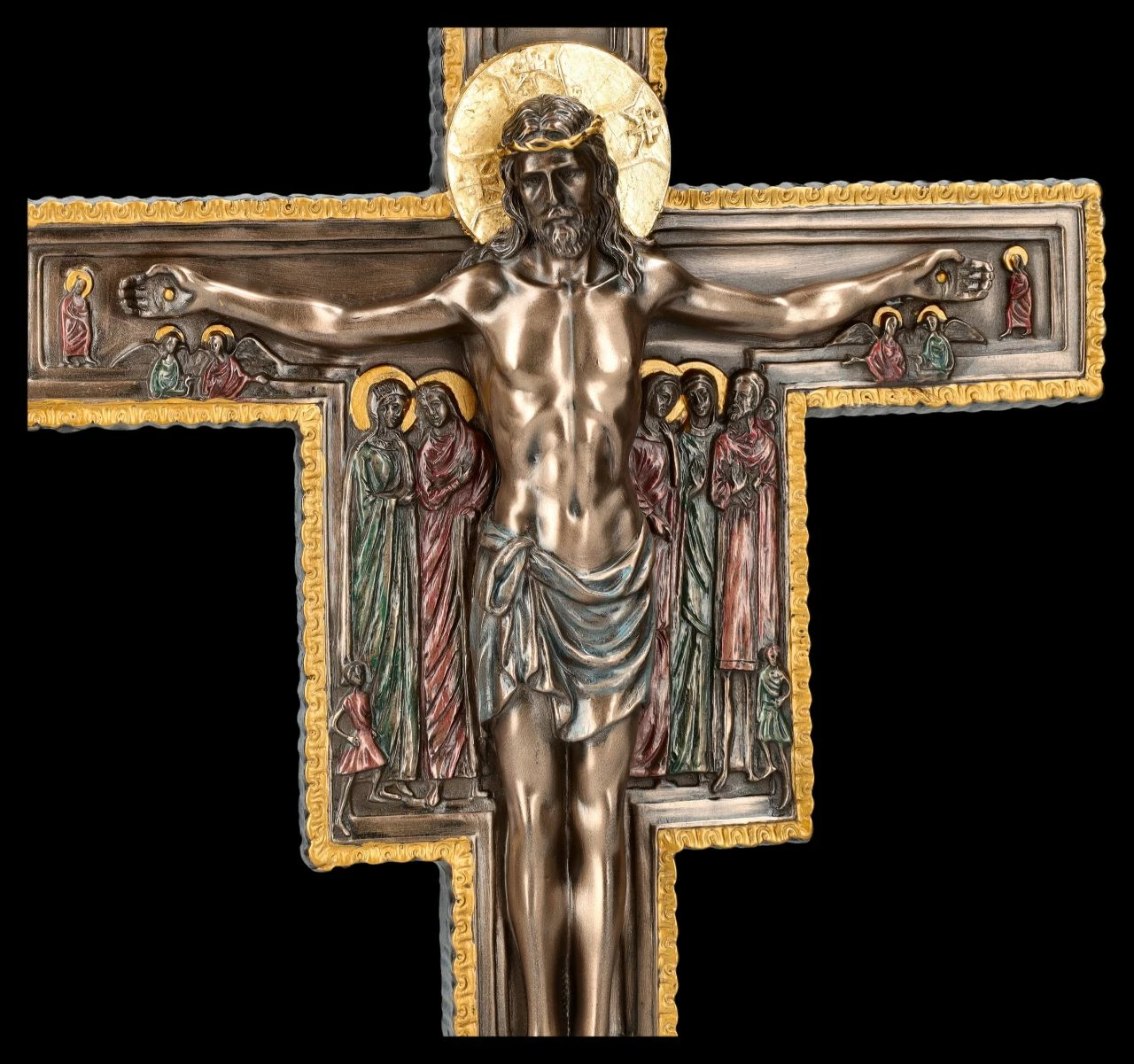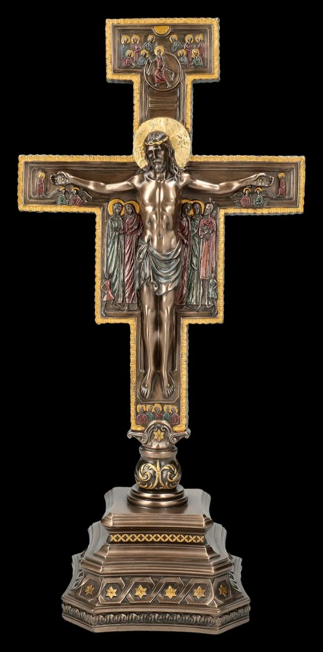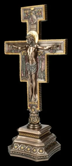 Das kunstvolle Tischkreuz ist dem Kreuz von San Damiano, oder auch Franziskuskreuz genannt, nachempfunden. Von dieser im 12. Jhdt. von einem syrischen Mönch gemalten Ikone hatte der Heilige Franz von Assisi einst den Auftrag vernommen, die Kirche von San Damiano vor dem Verfall zu bewahren und sie wieder aufzubauen. Umgeben von seiner Mutter Maria, Aposteln und Maria Magdalena hängt Jesus aufrecht an dem Kreuz und gemahnt an den Trost des auferstandenen Christus. Am oberen Ende des Kreuzes sieht man, wie Jesus in den Himmel kommt und von den Engeln empfangen wird. Das schön und sorgfältig bronzierte und fein colorierte Kruzifix steht auf einem Sockel. Das ‚Kreuz von San Damiano‘ aus der Studio Collection von Veronese ist sorgfältig aus hochwertigem Kunststein (Polyresin) gefertigt und 36 cm hoch, 14 cm breit und 11,5 cm tief. Es ist ein edles Tischkreuz auch für einen privaten Altar.