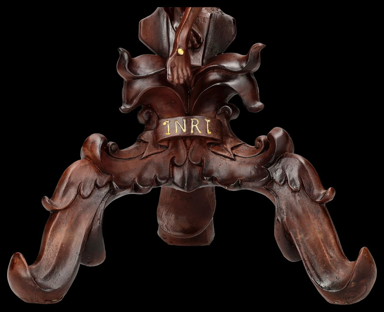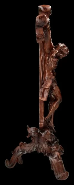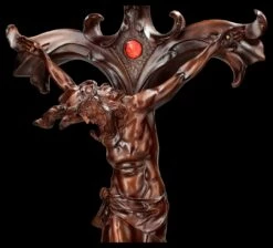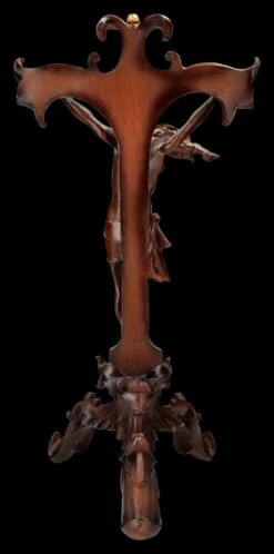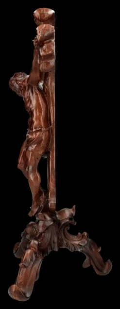 In wunderschöner und edler Holzoptik ist dieses Tischkreuz mit Jesus am Kreuz aus hochwertigem Kunststein (Polyresin) gefertigt. Es wurde, um den Holzcharakter perfekt darzustellen, sehr sorgfältig von Hand bemalt. Ein roter Schmuckstein leuchtet über der detailreichen Jesus-Figur und am Standfuß ist die Inschrift ‚INRI‘ – das sind die Initialen des lateinischen Satzes ‚Iesus Nazarenus Rex ludaeorum‘, also ‚Jesus von Nazaret, König der Juden‘ – angebracht. Dieses beeindruckende, 57 cm hohe, 28 cm breite und 24 cm tiefe Kruzifix in Holzoptik strahlt eine große spirituelle Eleganz aus, ohne pompös zu wirken. Die Silhouette ist so effektvoll inszeniert, dass es schade wäre, dieses wunderbare Tischkreuz nur an hohen kirchlichen Feiertagen hervorzuholen. Ob auf einem Altar, oder in der Heiligenecke im privaten Umfeld, dieses schöne Tischkreuz wird garantiert nicht übersehen und ist auch ein symbolhaftes Geschenk .