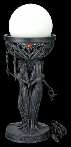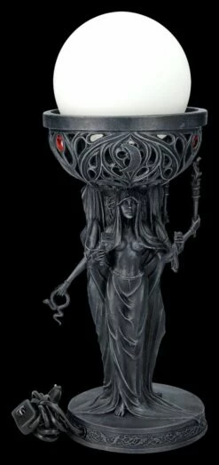 Diese außergewöhnliche Tischlampe wird als Stilelement garantiert ein magisches Highlight. Hekate, die Dreifaltige Göttin der Magie aus der griechischen Mythologie galt auch als Hüterin der Tore zwischen den Welten, durch die sie die Seelen geleitete. Sie beherrsche auch die Künste der Verwandlungen und Zauberei. Außerdem schrieb man ihr zu, dass sie nicht nur mit den Göttern, sondern auch mit den Verstorbenen in Kontakt treten konnte, was sie zu einer Wahrsagerin machte. Daher ist diese wunderbare Tischlampe mit der von der Göttin getragenen Glaskugel auch besonders geeignet, magische Räume sanft zu beleuchten. Die Dreifaltige Göttin Hekate wird bei dieser fantasievollen Tischlampe in ihrer Gestalt als wunderschöne junge Frauen dargestellt. Eine der Figuren trägt als Führerin durch die dunklen Reiche Fackeln in beiden Händen, die zweite Figur trägt in einer Hand ein Seil und in der anderen einen Hammer und die dritte Figur hält in einer Hand eine Schlange und in der anderen ein Messer. Der schwarze Fuß der Stehlampe mit Hekate ist aus handbemaltem hochwertigem Kunststein (Polyresin) gefertigt. Die Lampe ist 47 cm hoch, 19 cm breit und 19 cm tief. Die Glaskugel hat einen Durchmesser von ca. 15 cm und wird von zwei Metallspangen gehalten, die auch als Ersatzteil bestellt werden kann. Für die Lampe wird ein Leuchtmittel: mit max. 40 Watt / E27 benötigt, das nicht in der Lieferung enthalten ist. Die Kabellänge der Tischlampe ist ca. 1,3 m. Für alle, die in privaten Zeremonien Hekates Kult pflegen, ist diese Lampe ein wundervolles Geschenk. Denn als Zauberin wusste Hekate, wie die Tore zur Anderswelt geöffnet werden können.