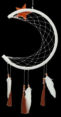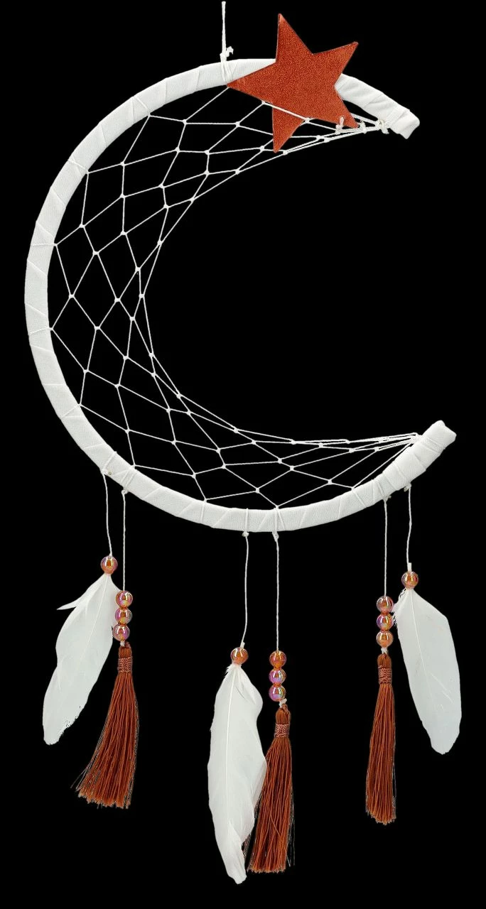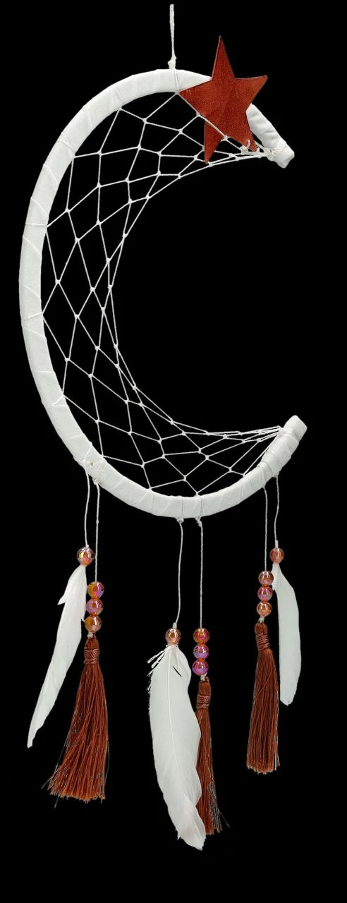 ‚Der Mond ist aufgegangen, die goldenen Sternlein prangen…..‘ Das Abendlied von Matthias Claudius ist sicherlich allen bekannt. Aus Holz, Stsoff, Federn und Perlen ist dieser fantastische, 44 cm hohe, 19 cm breite und 0,5 cm tiefe Traumfänger mit dem Halbmond und dem Stern an der Spitze natürlich bestens dazu geeignet, schöne Träume zu einzufangen. Er ist in seiner zurückhaltenden Ausführung sehr dekorativ und damit auch ein wunderbares Geschenk.