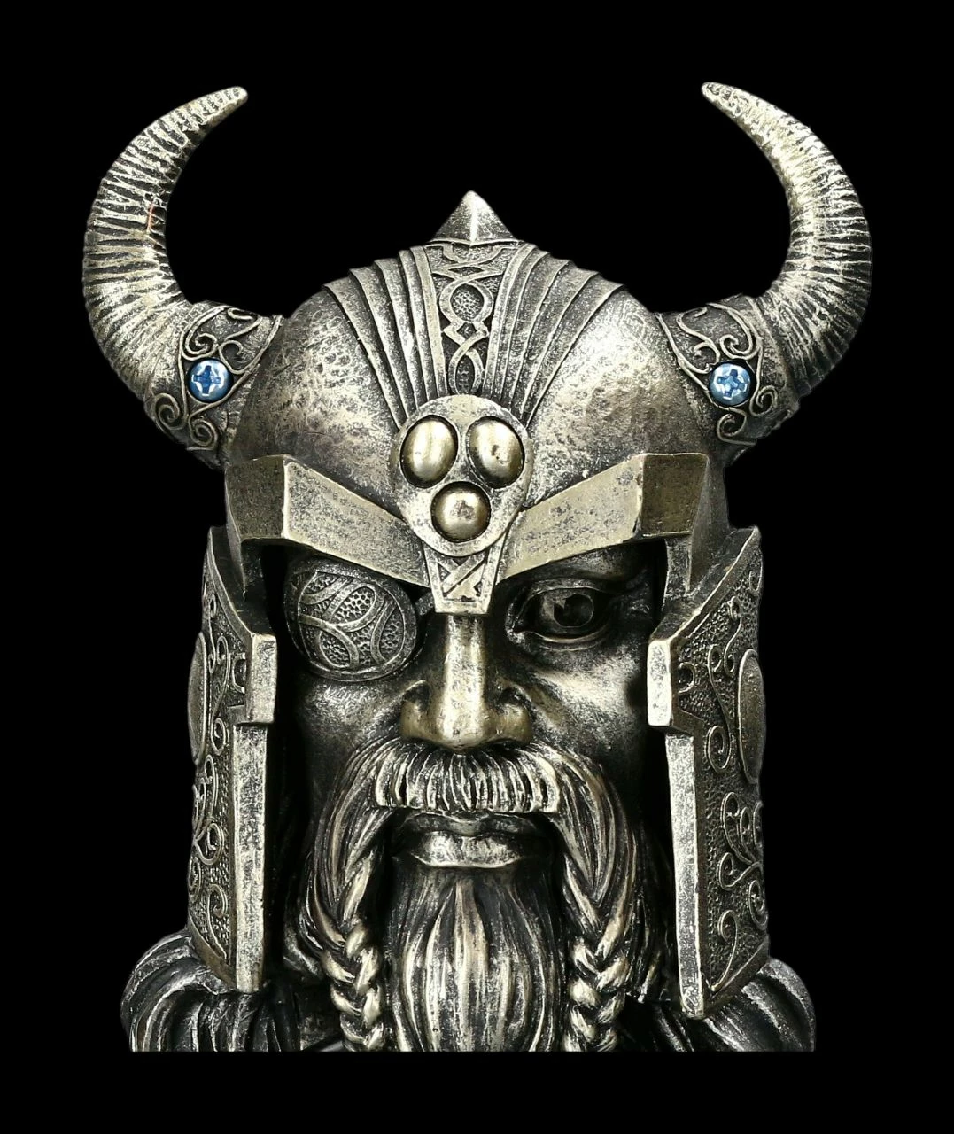 Etwas Mut und Selbstvertrauen gehört schon dazu, wenn man es wagt, unter dem beobachtenden Blick des Gottes Odin den Türklopfer zu bewegen. Der fantastische Türklopfer mit dem germanischen Gott ist beeindruckend detailreich aus handbemaltem Kunststein (Polyresin) und Metall gefertigt. Falls Sie ihn nicht an Ihrer Haustür anbringen können, so bewacht er mit seiner Höhe von 23 cm, der Breite von 11,5 cm und der Tiefe von 4 cm auch perfekt eine Tür zu Ihrem sehr persönlichen Bereich in Ihrem Zuhause.