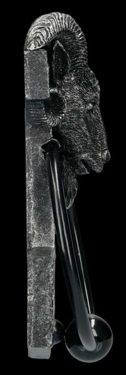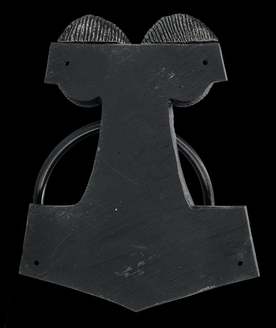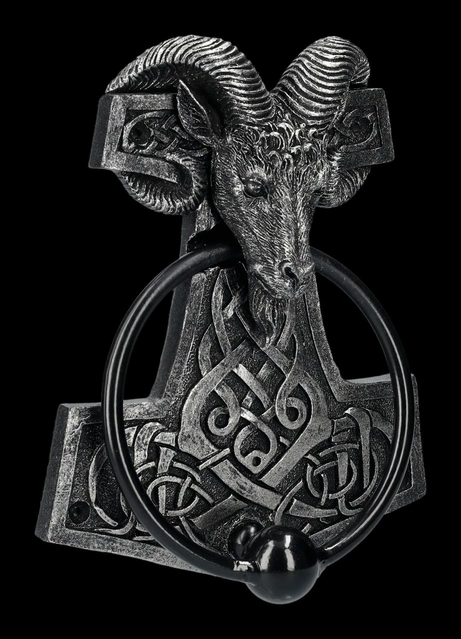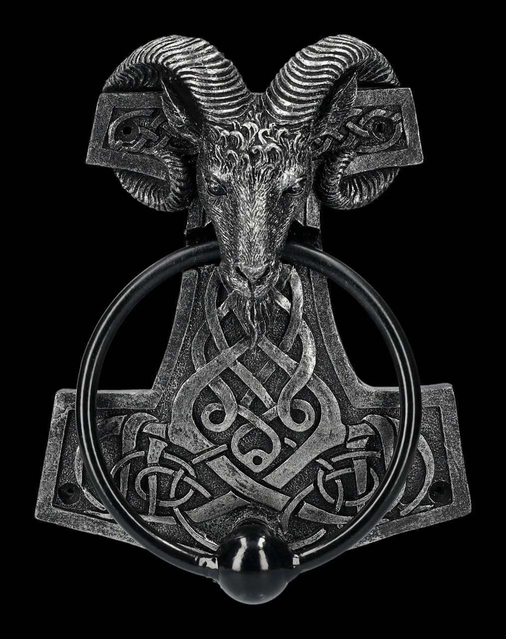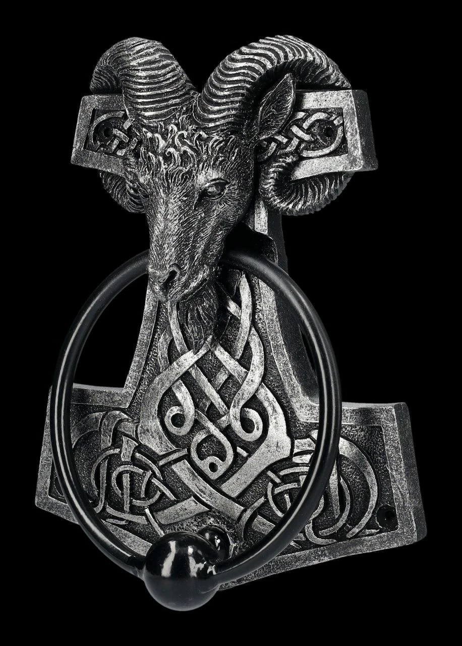 Wer an eine Tür kommt und dann diesen Türklopfer bedient, der weiß genau, dass er vor einem Wikinger Tor steht und um Einlass bittet. Thors Hammer mit dem fantastischen Widderkopf weist jedem Freund der Wikinger sofort den Weg. Detailreich aus Kunststein (Polyresin) gefertigt und mit einem Klopfer aus Metall ausgestattet, ist dieser 18,5 cm hohe, 12,5 cm breite und 4 cm tiefe Türklopfer ein absdolutes Must-Have für jeden Wikinger.