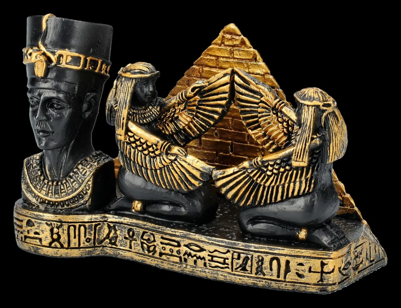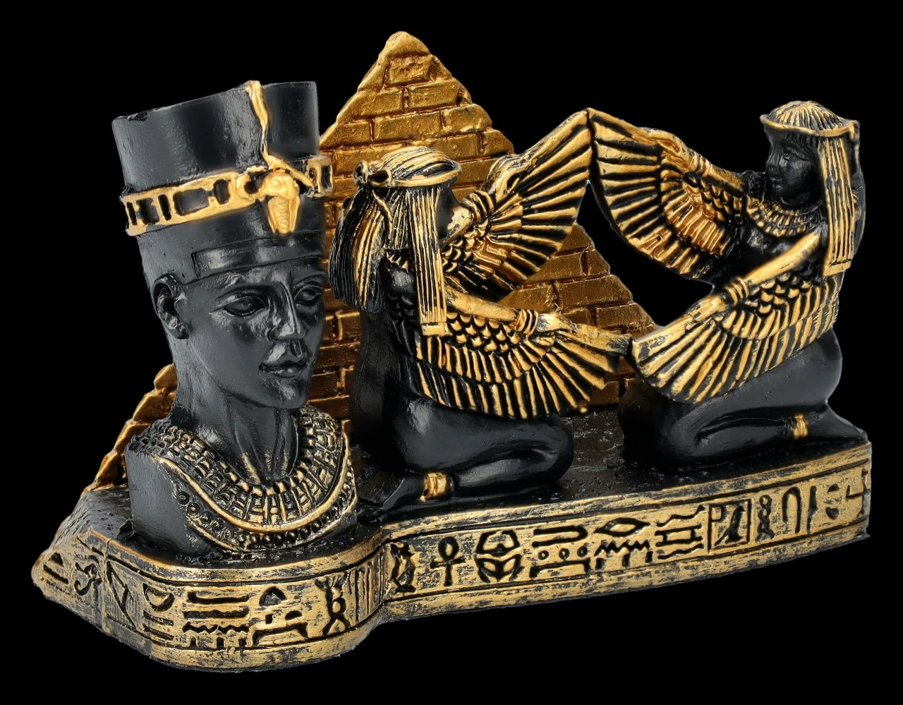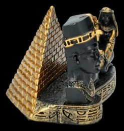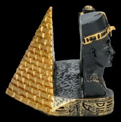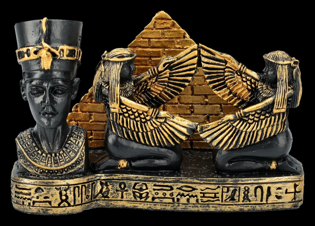 Jeder kennt ihn, denn er zählt zu den bekanntesten Kunstschätzen des Alten Ägypten – der Kopf der sagenumwobenen Königin Nofretete. Bei diesem wunderschön mit goldenen Akzenten handbemalten schwarzen Visitenkartenhalter steht der Kopf der Nofretete links im Vordergrund. Dahinter nehmen vor einer goldenen Pyramide zwei weibliche Figuren mit Adlergefieder an den Armen die Visitenkarten auf. Jeder, der von der Mythologie und Geschichte des Alten Ägyptens fasziniert ist, wird sich über diesen herrlichen, 6 cm hohen, 9 cm breiten und 6,5 cm tiefen Visitenkartenhalter aus handbemaltem Kunststein (Polyresin) als Geschenk sehr freuen.