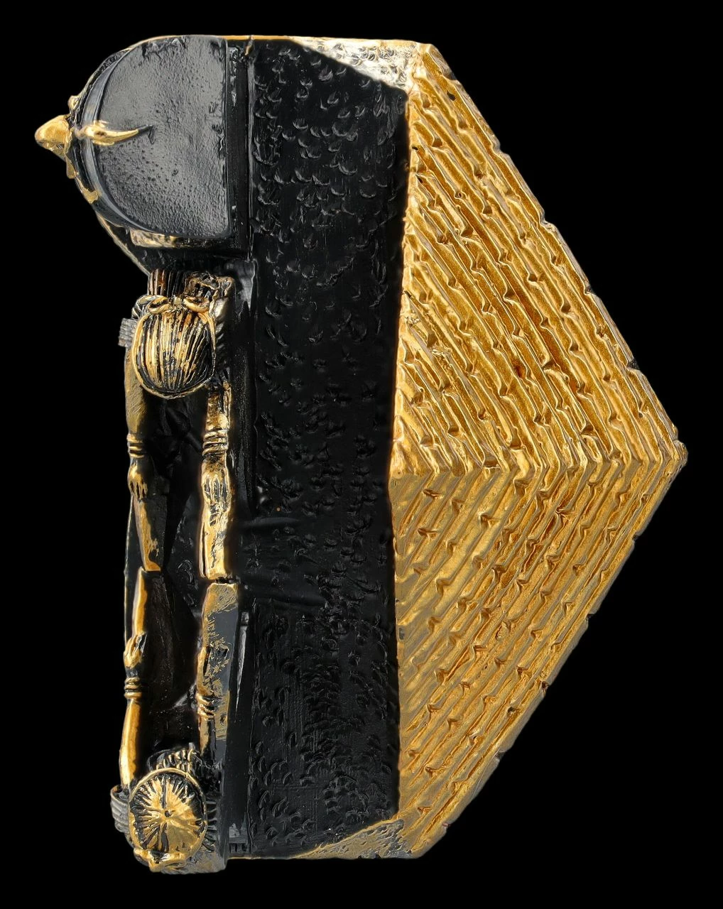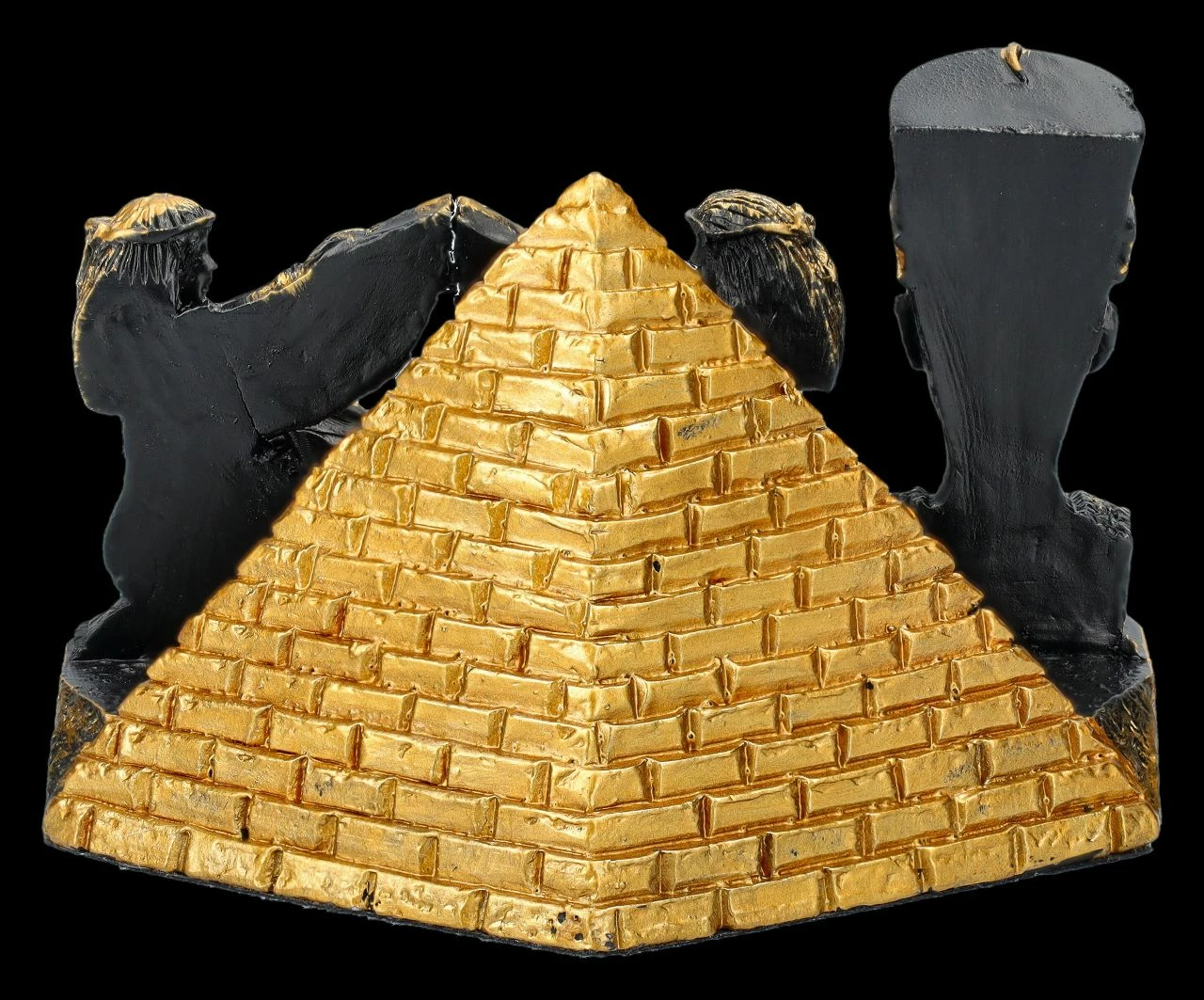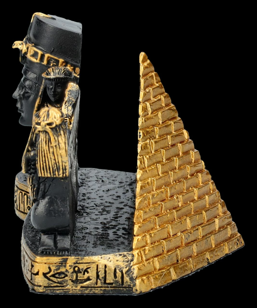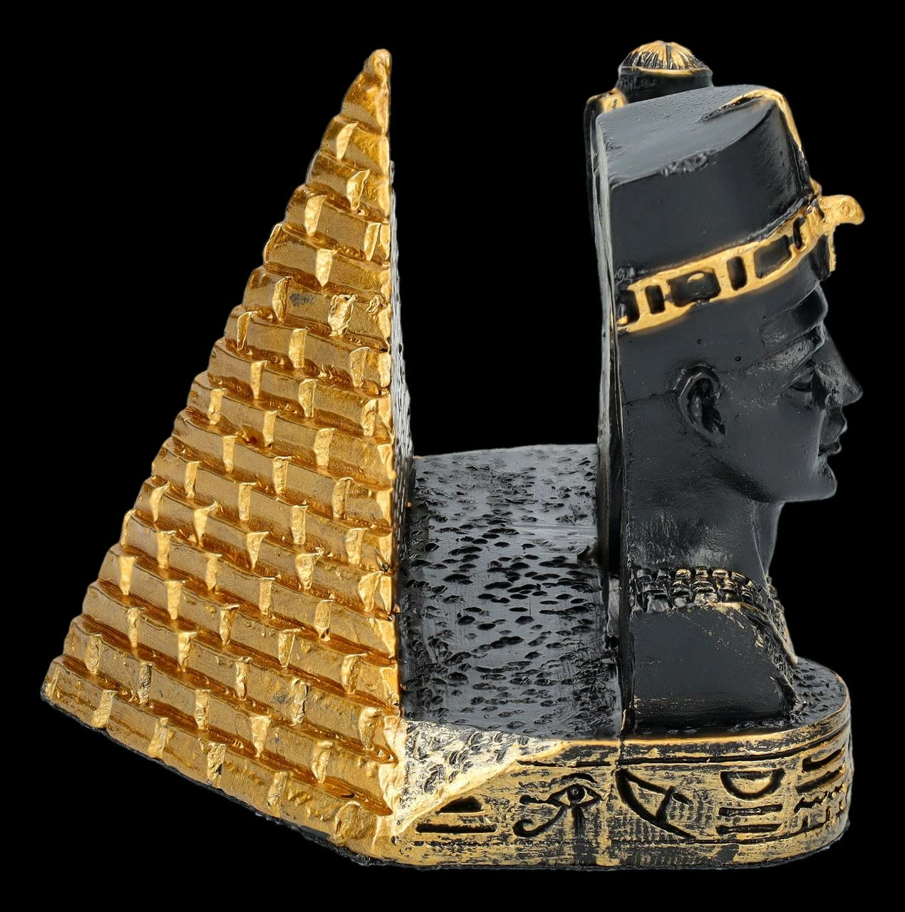 Jeder kennt ihn, denn er zählt zu den bekanntesten Kunstschätzen des Alten Ägypten – der Kopf der sagenumwobenen Königin Nofretete. Bei diesem wunderschön mit goldenen Akzenten handbemalten schwarzen Visitenkartenhalter steht der Kopf der Nofretete links im Vordergrund. Dahinter nehmen vor einer goldenen Pyramide zwei weibliche Figuren mit Adlergefieder an den Armen die Visitenkarten auf. Jeder, der von der Mythologie und Geschichte des Alten Ägyptens fasziniert ist, wird sich über diesen herrlichen, 6 cm hohen, 9 cm breiten und 6,5 cm tiefen Visitenkartenhalter aus handbemaltem Kunststein (Polyresin) als Geschenk sehr freuen.
