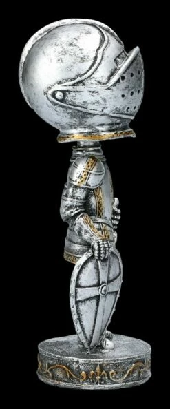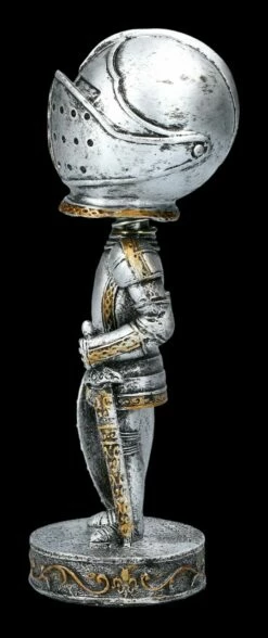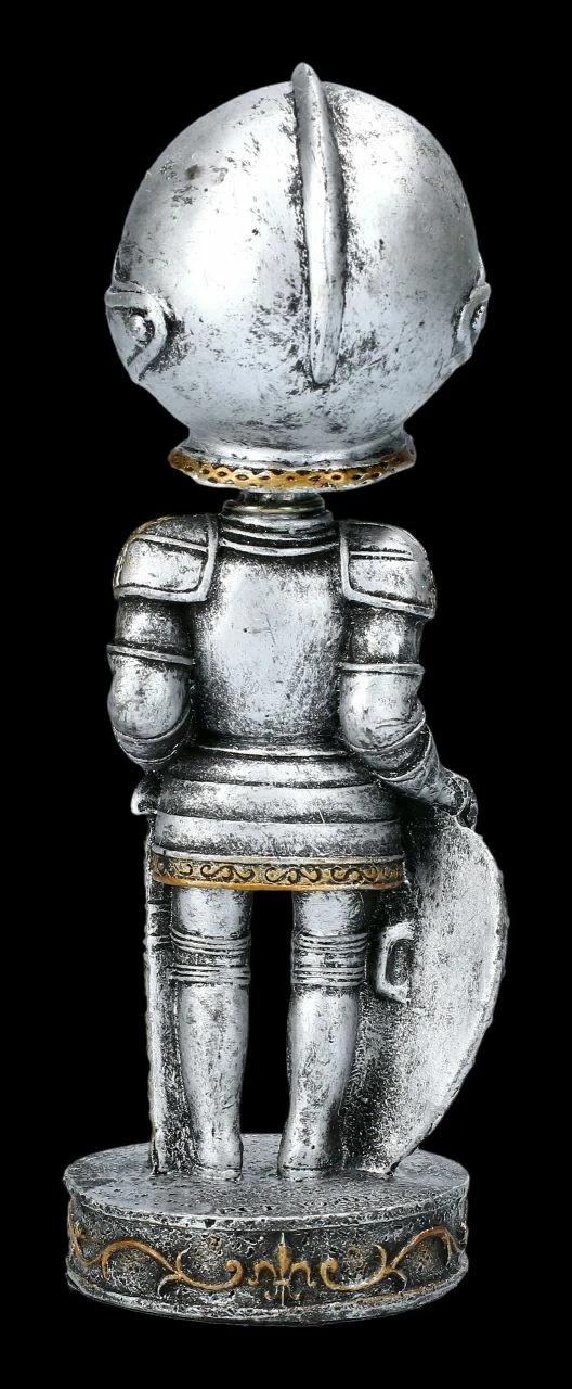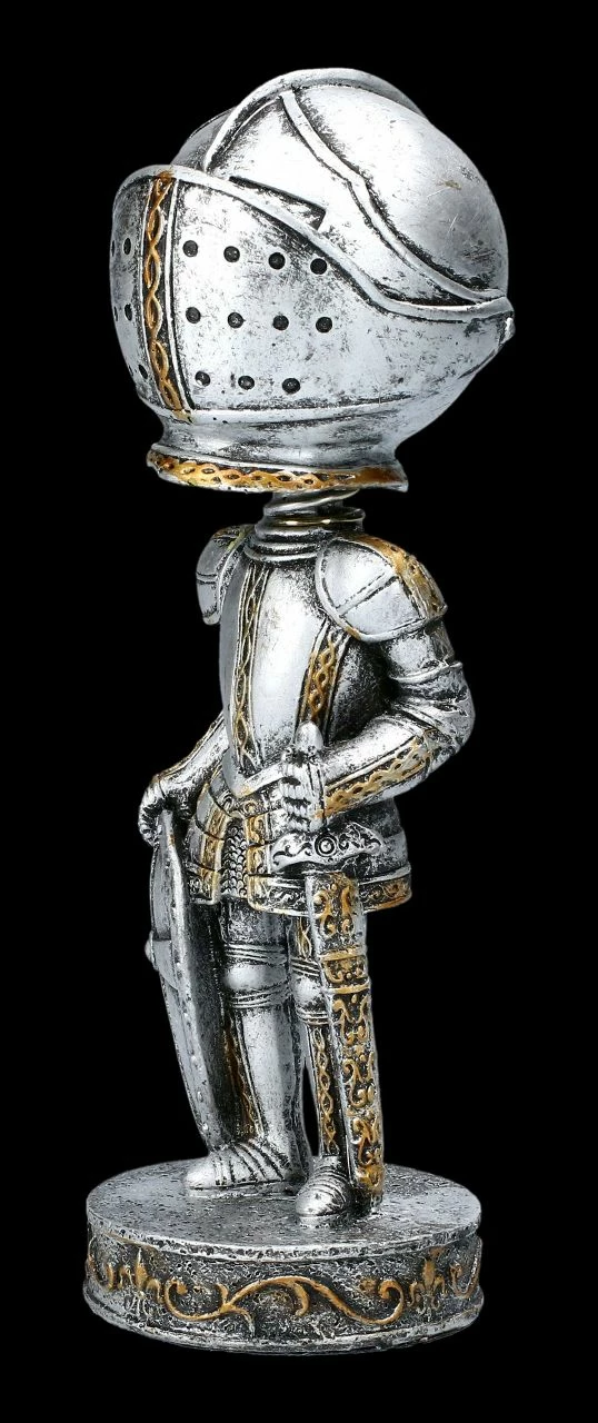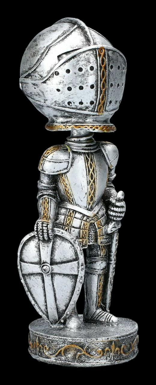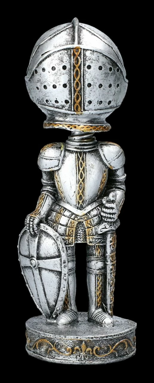 Wenn der Ritter mit dem Schwert und in voller Rüstung wie eine Statue auf dem Podest steht und mit seinem großen Kopf wackelt, bringt er sicher jeden zum Lachen. Der witzige Ritter mit Schwert ist detailreich aus Kunststein (Polyresin) gefertigt und stahlfarben mit goldenen Akzenten handbemalt. Er ist 15 cm hoch, 5,5 cm breit und 5 cm tief. Für jeden Ritterfreund ist diese lustige Ritterfigur mit dem Schwert und dem Wackelkopf ein tolles Geschenk.