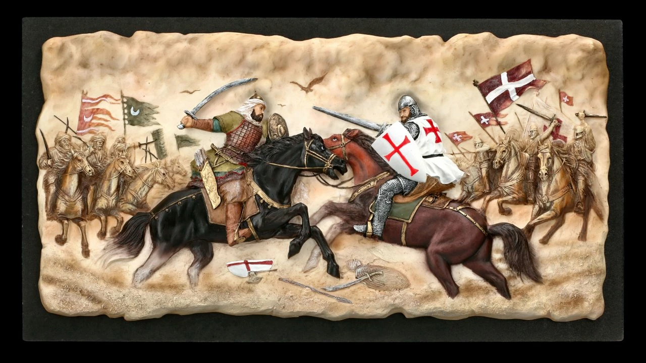 Bereits seit dem Hochmitelalter gibt es Darstellungen von Kämpfen der Kreuzritter mit den Sarazenen. Dieses sehr sorgfältig colorierte Relief aus Kunststein (Polyresin) ist aus der Studio Collection von Veronese. Es zeigt die Kämpfer mit ihren Fahnen und Waffen auf sehr detailliert dargestellten Pferden. Das beeindruckende Relief der antiken Schlacht ist 22 cm hoch, 42 cm breit und 2,5 – 10 cm tief und gibt als Wandbild oder aufgestellt Ihrem Arbeits- oder Wohnbereich einen auffälligen Blickpunkt. Das deteilreiche Relief hat neben einem Aufsteller auch die Möglichkeit zum Aufhängen.