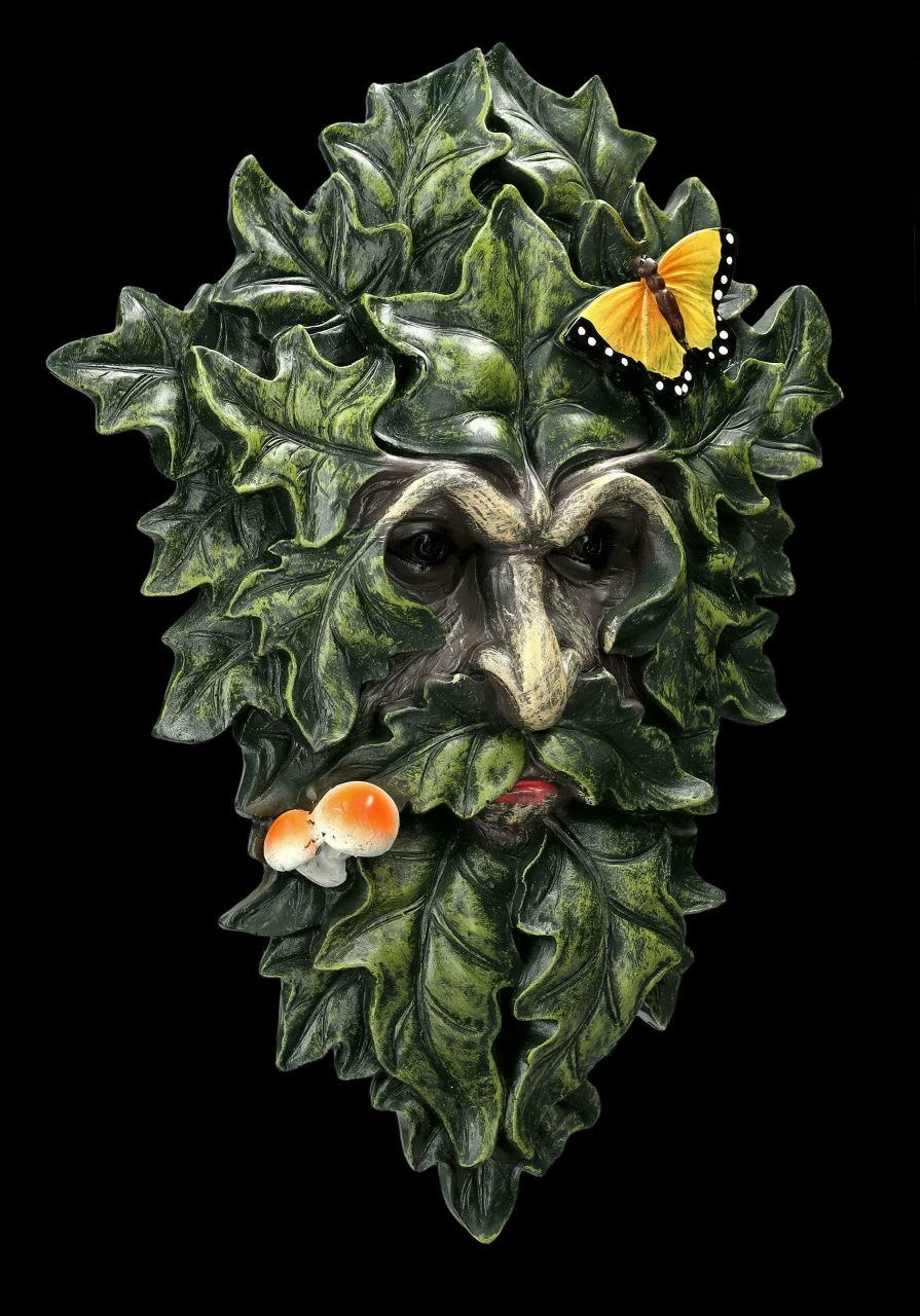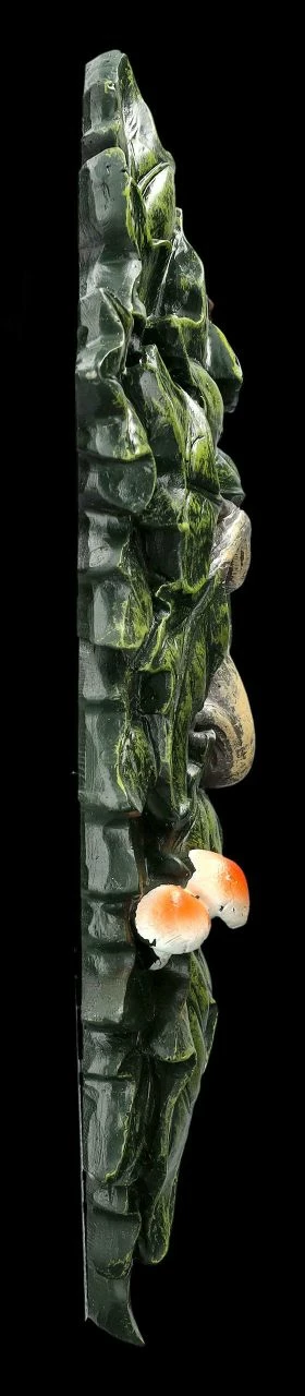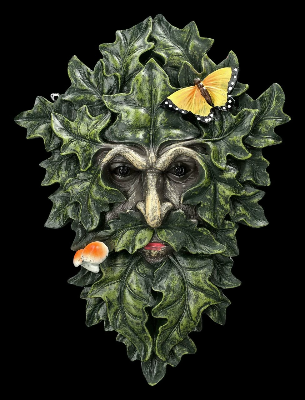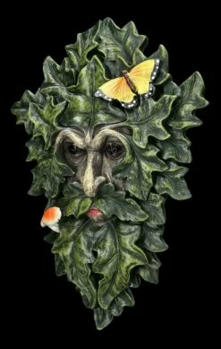 Ein Schmetterling hat sich auf den grünen Blättern des Baumgeistes niedergelassen. Die Wanddeko mit dem Baumgeist, der auch als Herr des Waldes, als Greenman oder auch als der ‚Gott mit den Blättern‘ bezeichnet wird, ist ein fantasievolles Geschenk und passt sehr gut in jede Pflanzenecke. Als Lichtwesen steht der Baumgeist für Harmonie und die wichtige Verbindung von Geist und Natur. Die 28,5 cm hohe, 21,5 cm breite und 3,5 cm tiefe Wanddeko mit dem Baumgeist ist zum Hängen und wurde sorgfältig und detailreich aus handbemaltem Kunststein (Polyresin) gefertigt.