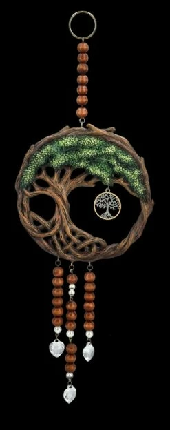 Die Wanddeko mit dem Lebensbaum im Zentrum ist ein wunderschöner Traumfänger aus der Studio Collection von Veronese. Der Lebensbaum ist in zahlreichen Kulturen und Religionen ein uraltes mythisches Symbol für Wachstum, Fruchtbarkeit, Unsterblichkeit und damit für das Wiedererwachen in der Natur. Die Wurzeln des Lebensbaums bei diesem herrlichen Traumfänger bilden einen Kreis, der sich über der Baumkrone schließt. In den Zweigen des Baums hängt ein Medaillon, das wiederum den Lebensbaum zeigt. Der 35 cm hohe, 13 cm breite und 2 cm tiefe Traumfänger mit dem Lebensbaum aus bronzierten und schön coloriertem Kunststein (Polyresin) hängt an einer mit Holzperlen verzierten Metallkette. Als Zeichen der Hoffnung für ein gutes Wachstum und damit für eine glückliche Zukunft ist dieser schöne Traumfänger mit dem Lebensbaum auch ein wunderbares Geschenk