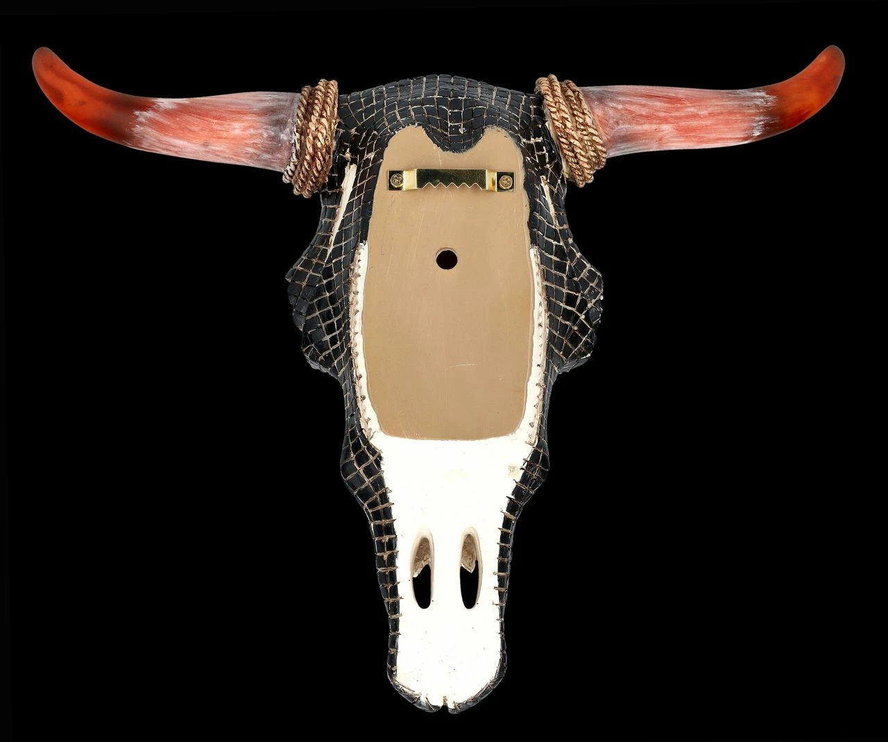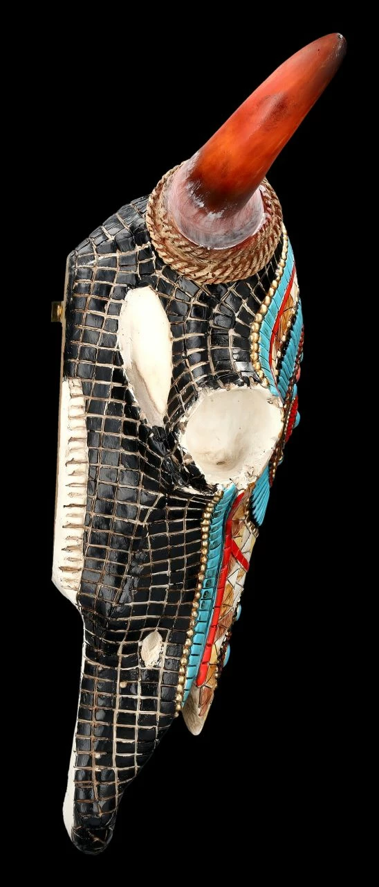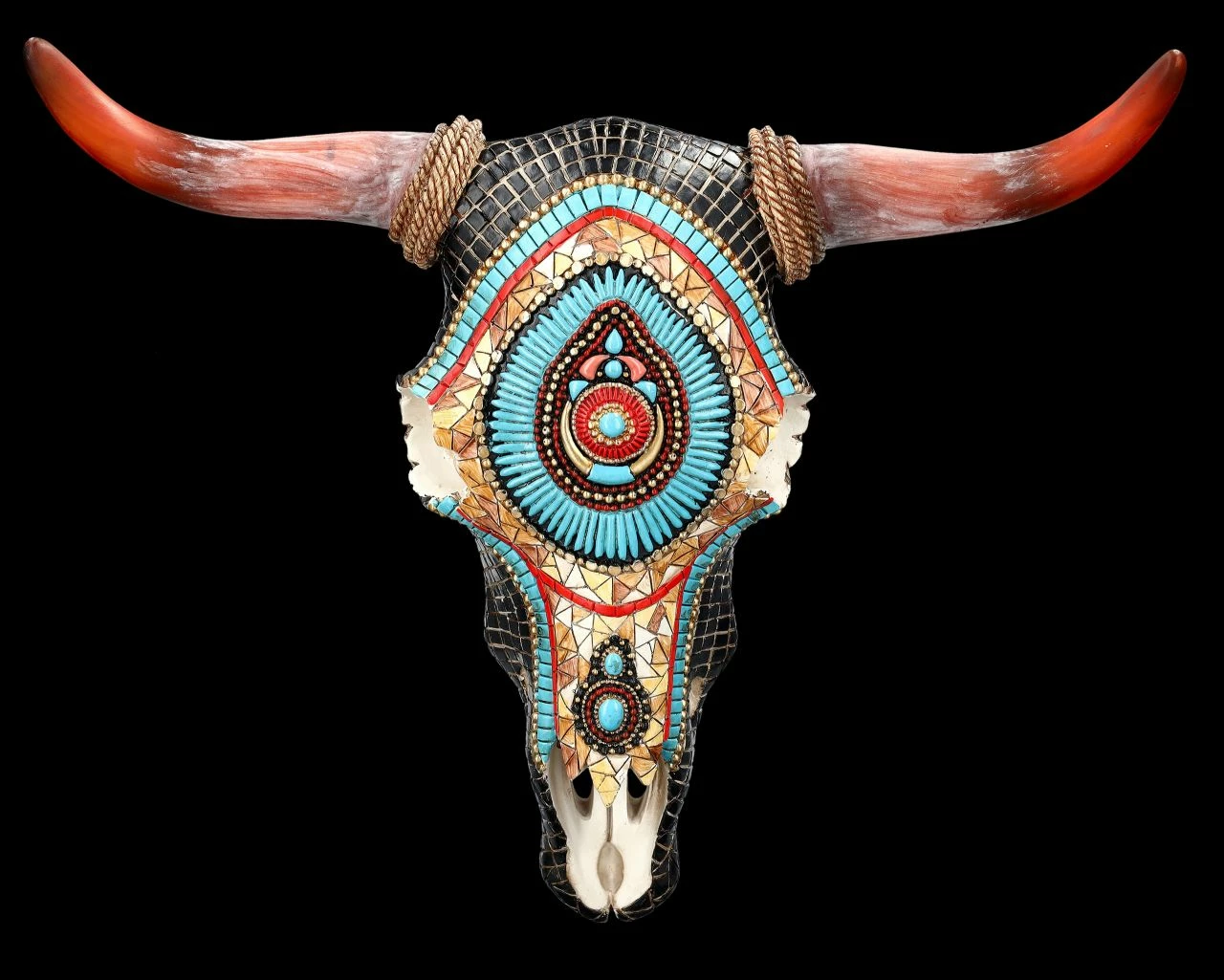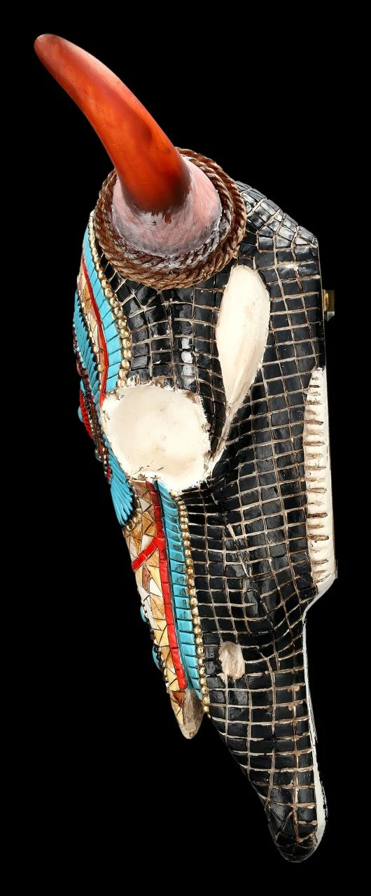 Rot geflammte Hörner und ein wunderbar buntes Western Mosaik in indianischem Muster und Farben zieren diesen prächtigen Bison-Schädel. Der mit dem Western-Mosaik handbemalte Totenkopf Bison wurde sorgfältig aus Kunststein (Polyresin) gefertigt. Er ist 27 cm hoch, 33 cm breit und 9 cm tief und ist zum Hängen. Er ist eine imposante Wanddeko, die sofort alle Blicke auf sich ziehen wird und ein fantastisches Geschenk für alle Western-Fans.