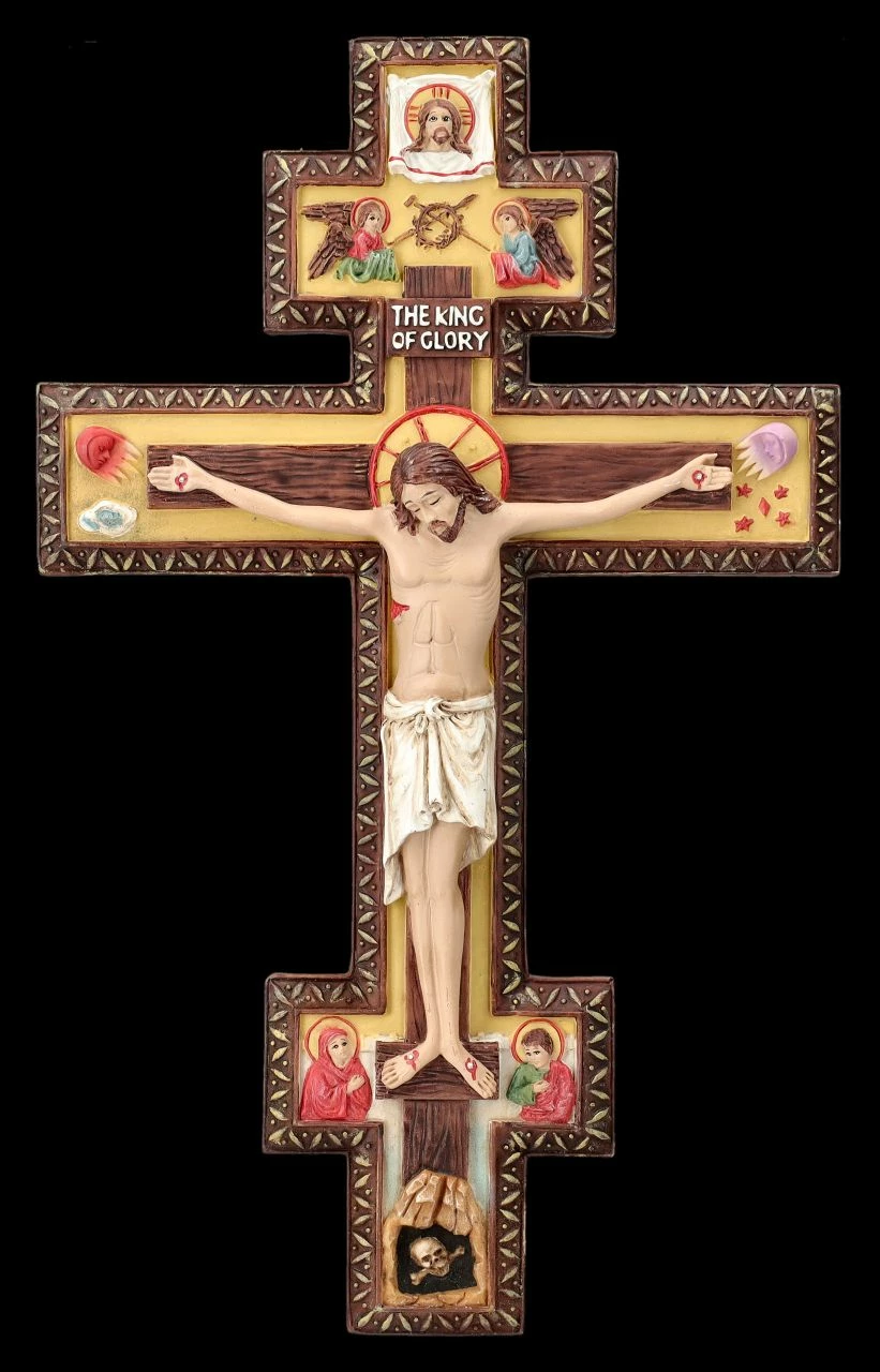 Das von Hand bemalte Wandkreuz aus Kunststein (Polyresin) ist im Stil eines ‚Byzantinischen Kruzifix‘ gearbeitet und zeigt den leidenden Jesus am Kreuz, umgeben von verschiedenen Szenen. Über der Jesus Figur steht ‚The King of Glory‘ (Der König der Herrlichkeit) und darüber sieht man Jesus auf dem Grabtuch und darunter zwei betende Engel. Zu Füßen Jesus sind rechts und links Maria und ein Heiliger abgebildet, während unter den Füßen in einer Höhle ein Totenschädel liegt und an die Auferstehung Jesus von den Toten erinnert. Dieses Kreuz zum Hängen wirkt wie ein altes historisches Kruzifix. Es ist 30 cm hoch, 18,5 cm breit und 3,5 cm tief und ein effektvoller Blickfang an jeder Wand.