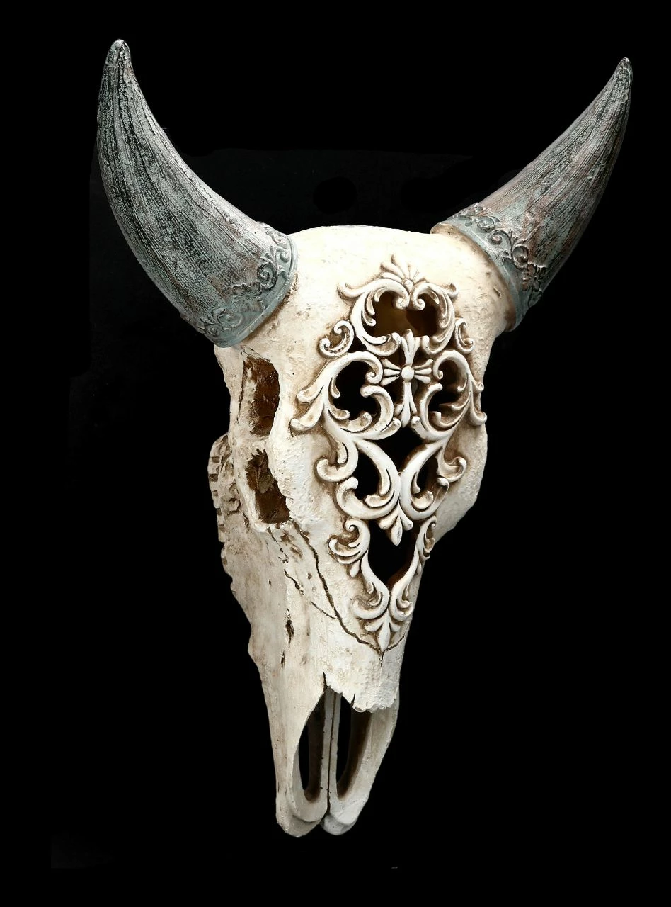 Bemerkenswert realistisch handbemalt und sehr detailreich aus Kunststein (Polyresin) gefertigt ist dieser dekorative Bison Kopf. Das schöne, barock anmutende Muster auf dem Bison Totenkopf wirkt wie aus dem Knochen ausgesägt. Dieses Wandrelief ist mit seiner Höhe von 45 cm, der Breite von 30 cm und der Tiefe von 13 cm ein absoluter Hingucker. Es hat auf der Rückseite eine Aufhängemöglichkeit. Ob in der Küche oder auch in einem Lokal, dieser Bison Totenkopf mit Verzierung ist überall eine tolle Deko.