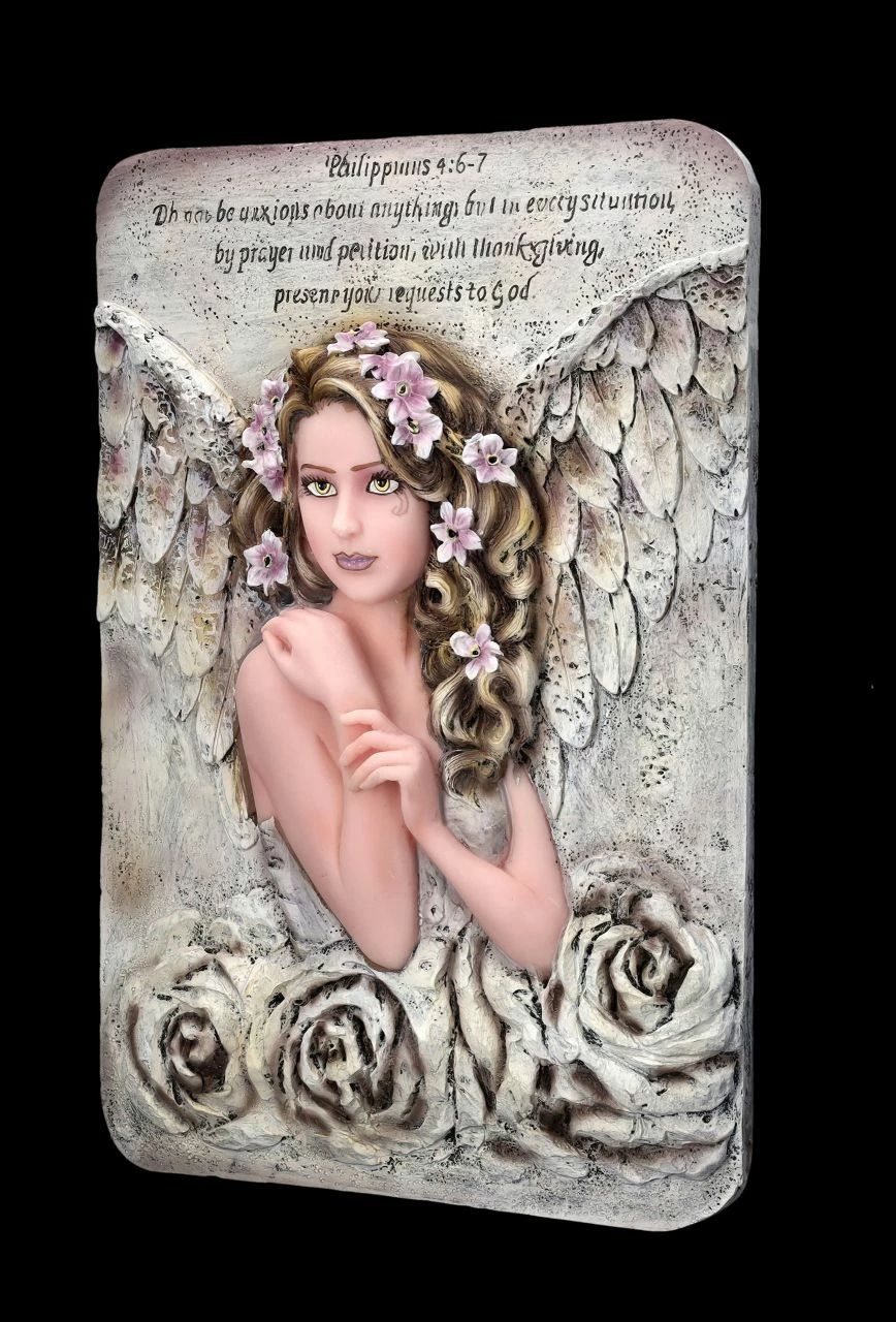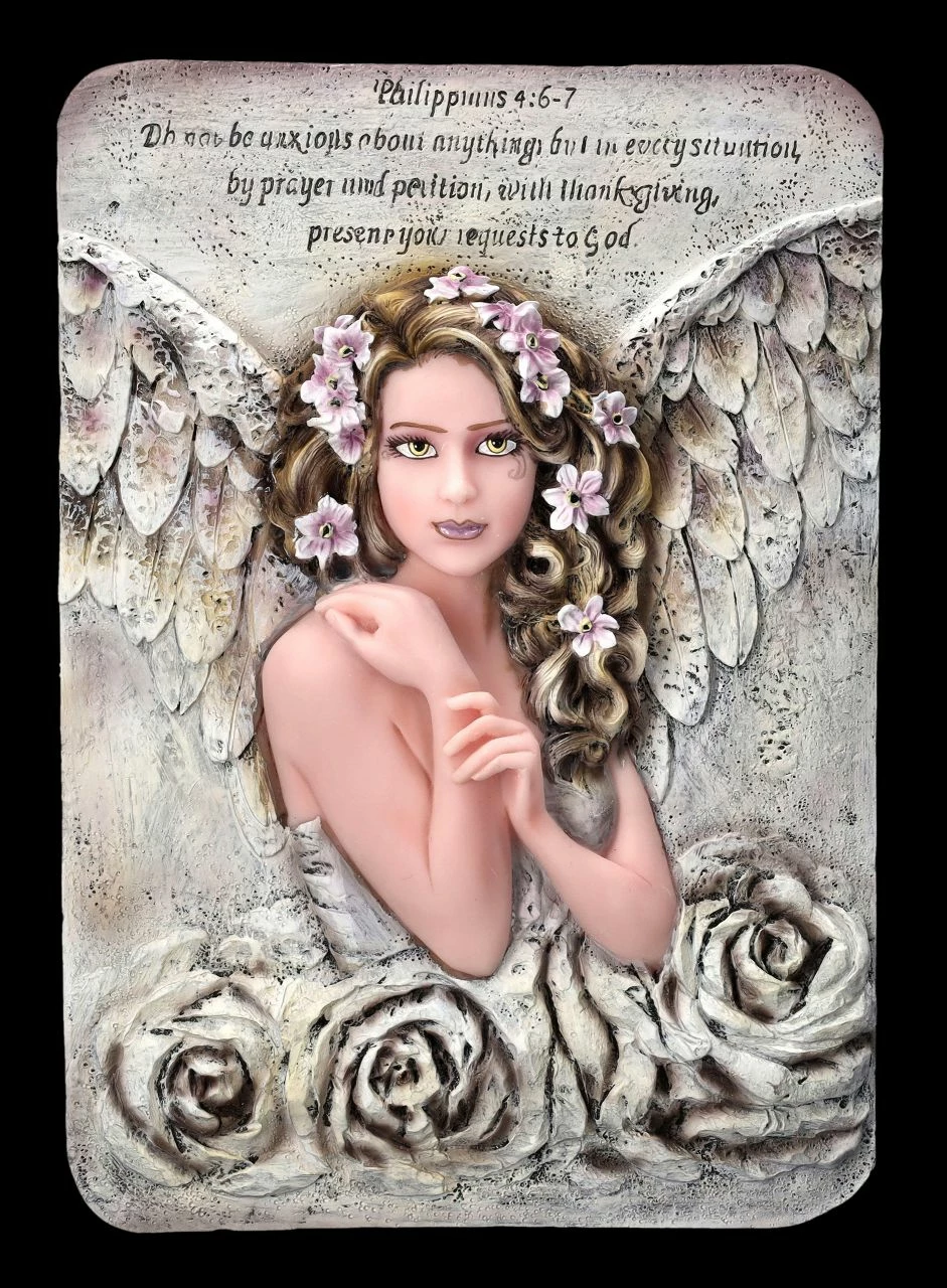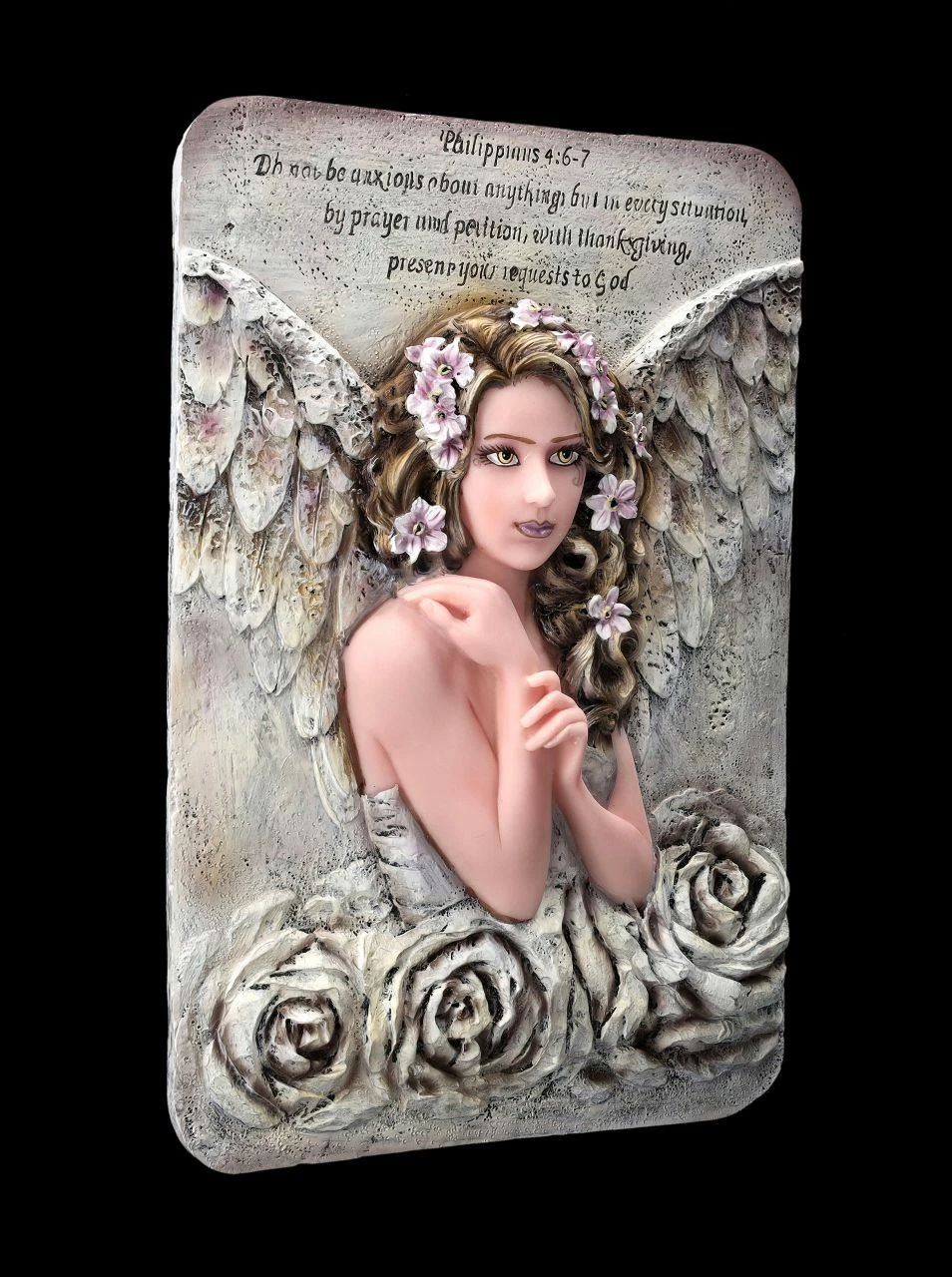 Das wunderbare Wandrelief mit einem zauberhaften Engel als Braut stammt aus dem Atelier der Künstlerin Jessica Galbreth. Der Spruch aus den Philippern 4:6-7, der über dem Engel angebracht ist, lautet übersetzt in etwa: ‚Sei um nichts besorgt, sondern richte in jeder Situation durch Gebet und Bitte als Danksagung deine Bitten an Gott‘. Der wunderschöne Engel auf diesem fantastischen Wandrelief aus zart und liebevoll handbemaltem Kunststein (Polyresin) wird jeden bezaubern. Das 29 cm hohe, 20 cm breite und 4,5 cm tiefe Wandrelief ist zum Hängen. Es ist nicht nur eine beeindruckende Dekoration, sondern auch ein wirklich fantastisches Geschenk für Ihren ganz persönlichen Engel.