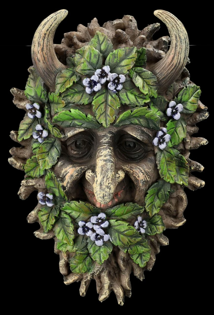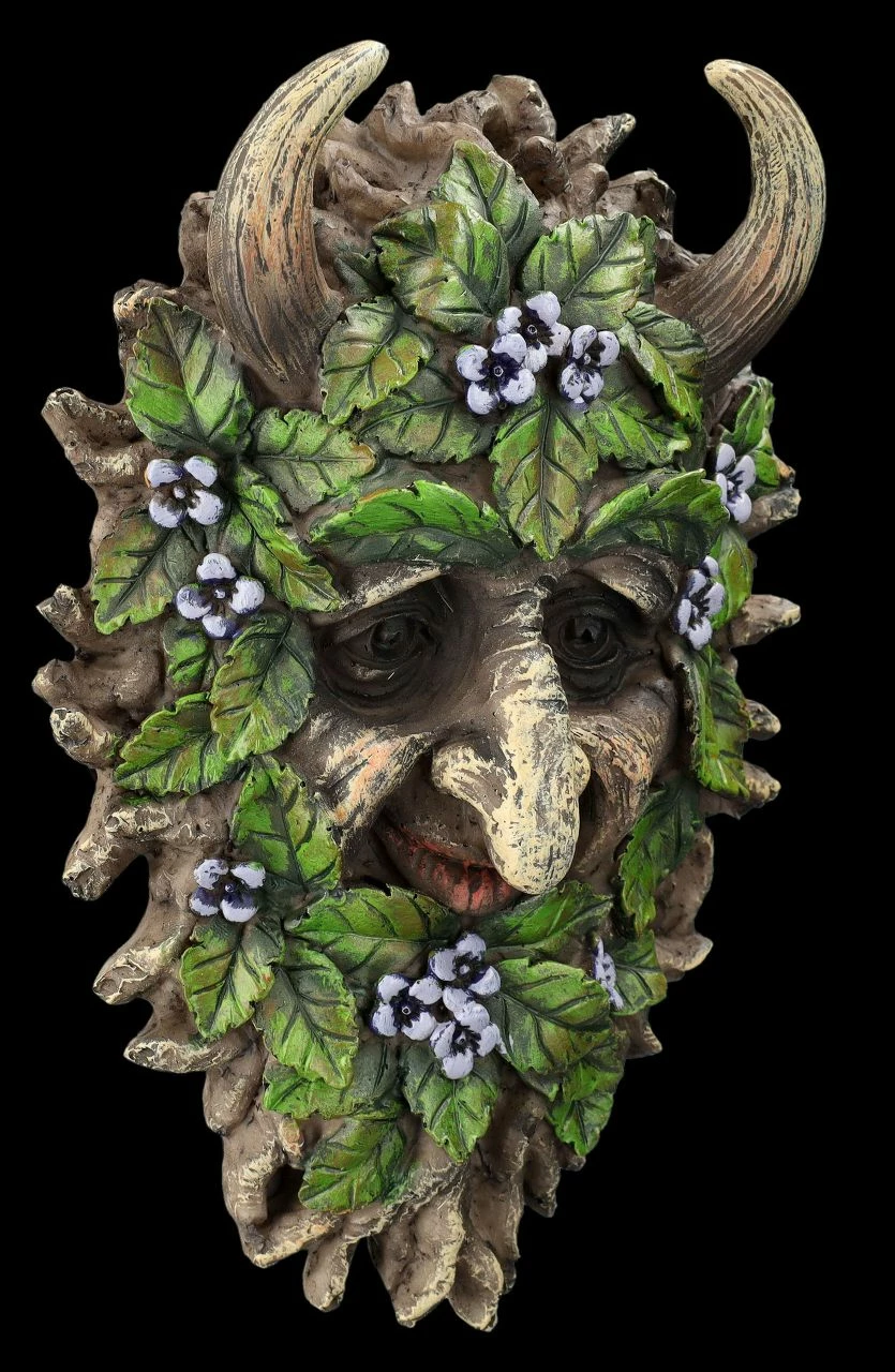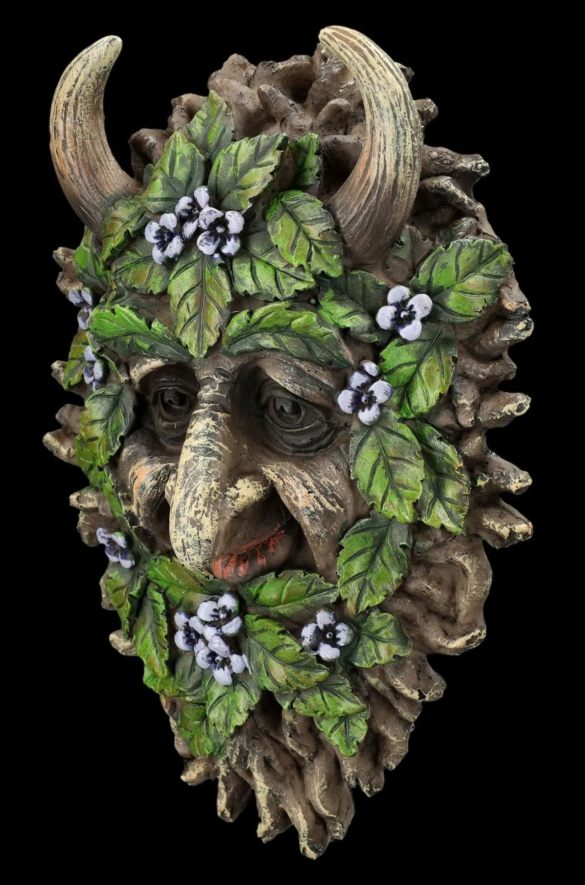 Mit Erlenblättern und mit blauen Blüten geschmückt ist der gehörnte Kopf des Greenman Alder. Das spirituelle Wandrelief zum Hängen mit dem faszinierenden Kopf des auch als Vegetationsgott verehrten Greenman ist 20 cm hoch, 14 cm breit und 5 cm tief. Der vergnügt lächelnde Greenman Alder ist detailreich aus Kunststein (Polyresin) gefertigt und sorgsam von Hand bemalt. Es wirkt so, als wäre der Kopf des Greenman Alder aus einem Erlenstamm geschnitzt. Das Wandrelief mit dem Greenman Alder ist eine fantastische Dekoration für den ‚grünen Teil‘ des Wohnbereiches und damit auch ein perfektes Geschenk.