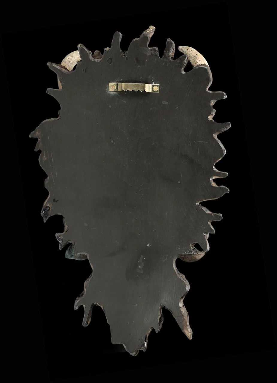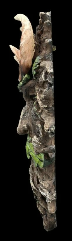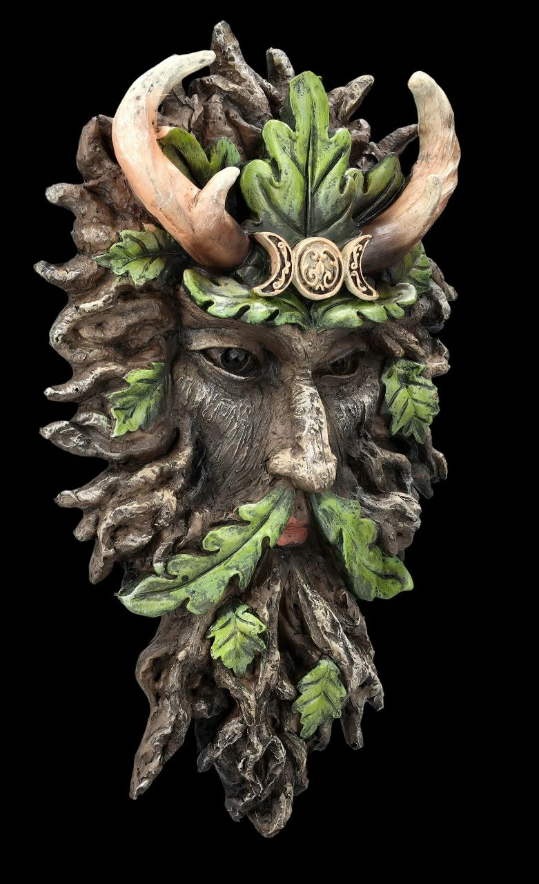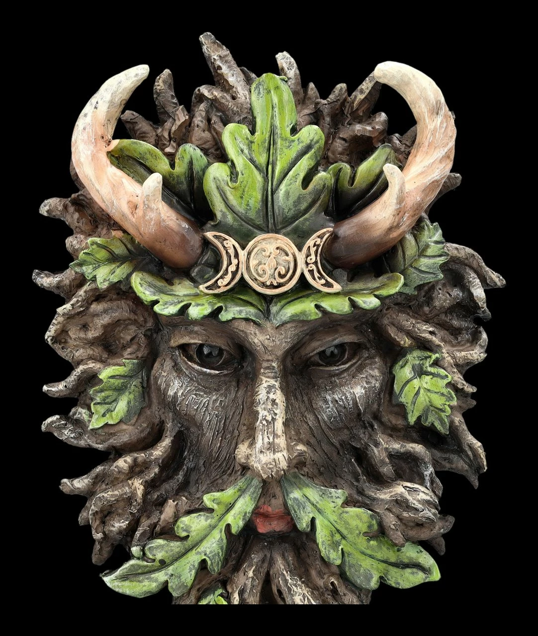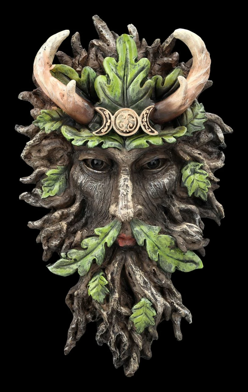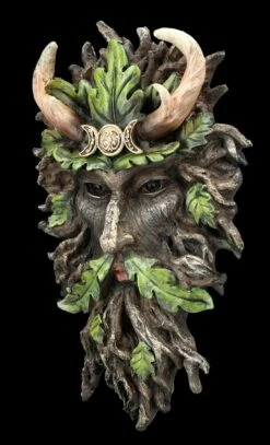 Der Bart aus den Wurzeln eines alten Baumes und der Oberlippenbart aus Eichenblättern frisch getrimmt, die Haar gestylt – ein schönes und wahrlich faszinierendes Gesicht eines Baumgeistes zeigt dieses Wandrelief zum Hängen. Tief scheint dieser schöne Baumgeist jedem Betrachter in die Augen zu blicken. Der ‚Grüne Mann‘, den man auch aus der mittelalterlichen Kunst und.von alten Kirchen kennt, wird oft auch als ‚gehörnter Naturgott‘ dargestellt. Aber bereits in vorchristlicher Zeit galt der Baumgeist als spirituelles Symbol für das Werden und Vergehen in der Natur. Das mit Ästen und Blättern umrandete attraktive Gesicht dieses Greenman wurde aus sorgsam handbemaltem Kunststein (Polyresin) gefertigt und zeigt das rätselhafte und symbolhafte Wesen mit Hörnern und mit dem Symbol der Dreifachen Mondgöttin als Schmuck auf der Stirn. Das 28 cm hohe, 17 cm breite und 5 cm tiefe Wandrelief zum Hängen ist auch ein perfektes Geschenk für alle die von der Wicca-Spiritualität der dreifachen Mondgöttin überzeugt sind und natürlich für alle Freunde des Naturgottes.
