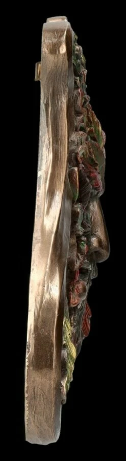 Als ‚Gott mit den Blättern‘ wird der Greenman auch bezeichnet. Als Vegetationsgott drückt der Greenman die Verbundenheit mit der Natur aus. Veronese stellt mit diesem einzigartigen Greenman Wandrelief den Herbst dar. Dazu passt auch der Rahmen im Stil der Jugendstilzeit, der das ernste Gesicht des Vegetationsgottes inmitten von herbstlich gefärbten Blättern umrahmt. Das 14,5 cm hohe, 24,5 cm breite und 3 cm tiefe Wandrelief zum Hängen aus hochwertigem Kunststein (Polyresin) ist sehr edel bronziert und detailreich und fein coloriert. Das spirituelle Wandrelief aus der Studio Collection von Veronese verkörpert perfekt die Harmonie von Geist und Natur und ist daher ein wunderbares Geschenk für alle, für die der Herbst mit seinem herrlich gefärbten Laub zu den wichtigsten Jahreszeiten zählt.