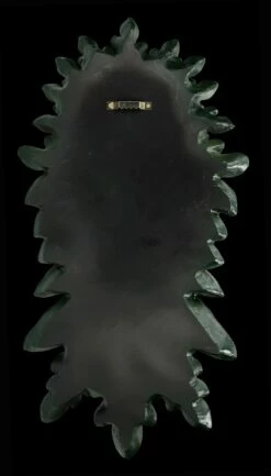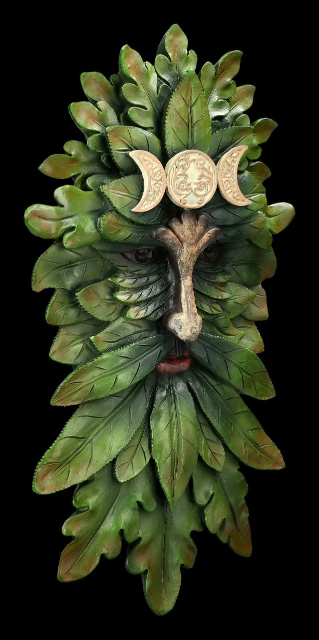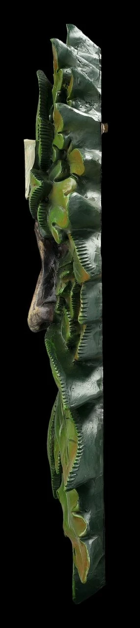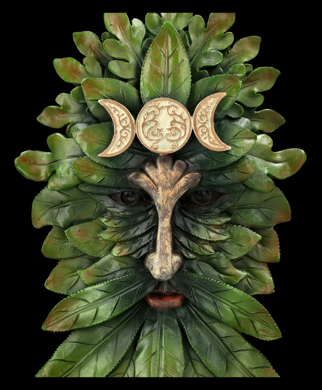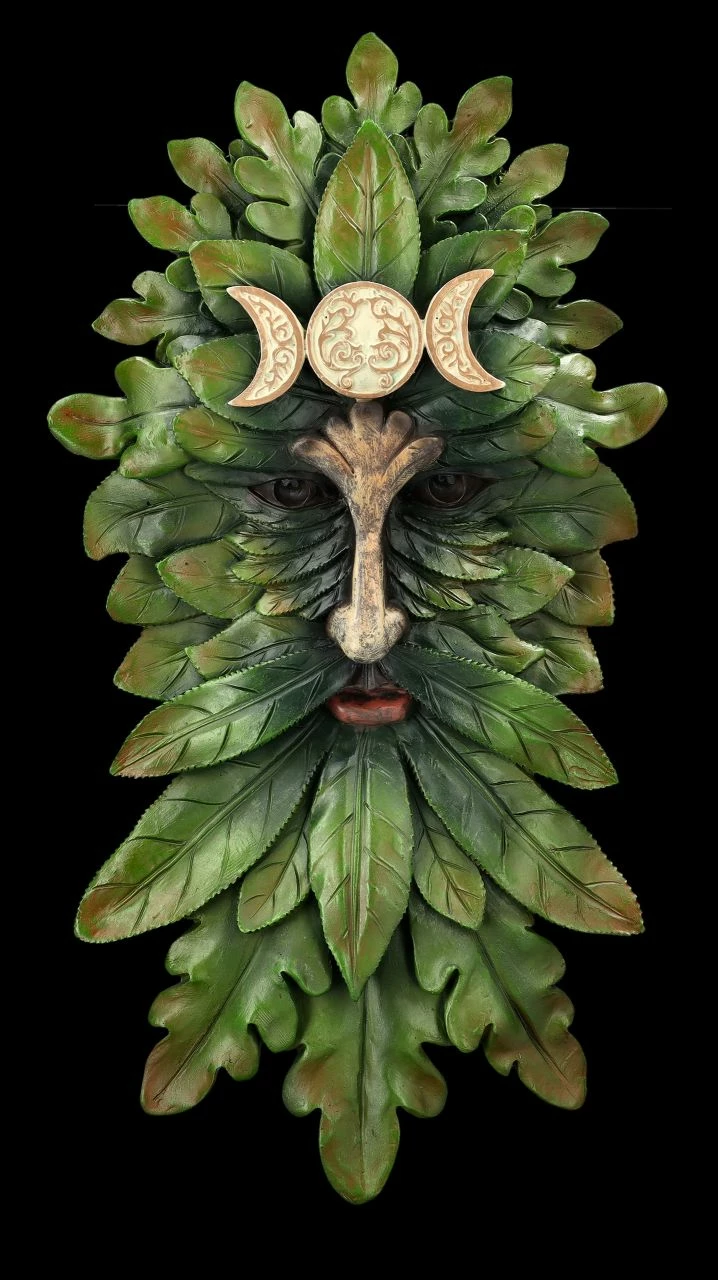 Dieses Wandrelief zeigt inmitten grüner Blätter das mystische Gesicht des Greenman als keltische Natur-Gottheit mit dem Symbol der Dreifachen Mondgöttin auf der Stirn. Dass der Greenman zu den Vegetationsgöttern gehört, ist diesem Wandrelief anzusehen. Das mit zahlreichen grünen Blättern umrandete Gesciht wurde bereits in vorchristlicher Zeit oft als spirituelles Symbol für das Werden und Vergehen in der Natur dargestellt. Das beeindruckende 42 cm hohe, 21 cm breite und 6 cm tiefe Wandrelief zum Hängen wurde aus handbemaltem Kunststein (Polyresin) gefertigt. Das rätselhafte und symbolhafte Wesen auf dem Wandrelief ist auch ein perfektes Geschenk für alle Anhänger des ‚Grünen Mannes‘, aber auch für alle, die von der Wicca-Spiritualität der dreifachen Mondgöttin überzeugt sind.