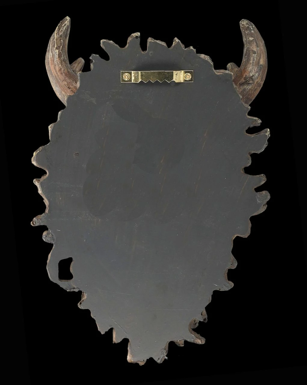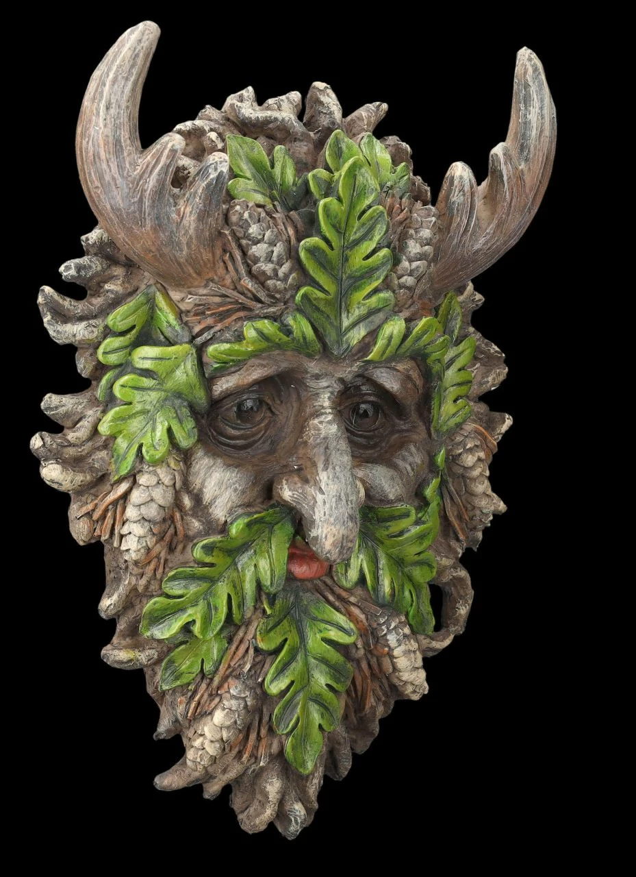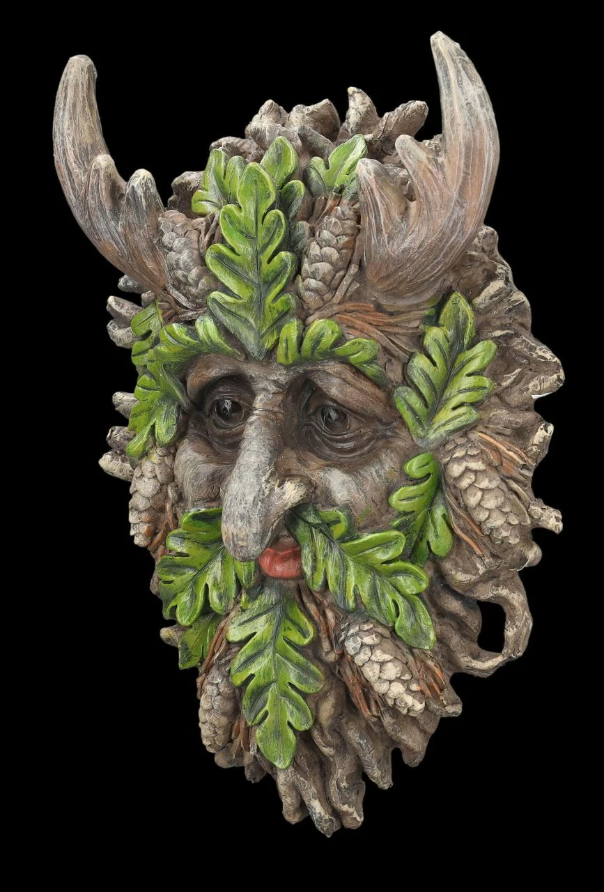 Ein wahrer Wald- oder Baumgeist mit Geweih, grünen Blättern und Zapfen ist dieser fantastische Greenman ‚Pan Bryn‘ als Wandrelief zum Hängen. Zahlreiche Details zeichnen dieses fantasievolle, 21 cm hohe, 14 cm breite und 4,5 cm tiefe Wandrelief aus sorgfältig handbemaltem Kunststein (Polyresin) aus. Es wirkt beinahe wie ein plastisches Element aus Holz, wie es vermutlich schon in frühen Zeiten als heidnisches Relikt aus dem Vegetations- oder Fruchbarkeitskult in vielen Kirchen Europas als Schmuck übernommen wurde.