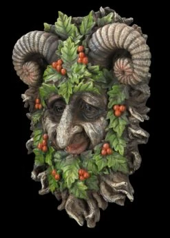 In der griechischen Mythologie wird der Hirtengott Pan als MIschwesen zwischen Mensch und Widder oder Ziegenbock dargestellt. Bei diesem fantasievollen Wandrelief ‚Pan Rawan‘ aus sorgfältig handbemaltem Kunststein (Polyresin) trägt der Greenman im Pan Look neben seinem Haar und Bart aus grünen Blättern und roten Beeren auch Widderhörner. Das 21 cm hohe, 15,5 cm breite und 4,5 cm tiefe Wandrelief wirkt wie ein plastisches Element aus Holz, wie es vermutlich als heidnisches Relikt aus dem Vegetations- oder Fruchbarkeitskult in vielen Kirchen Europas als Schmuck übernommen wurde.