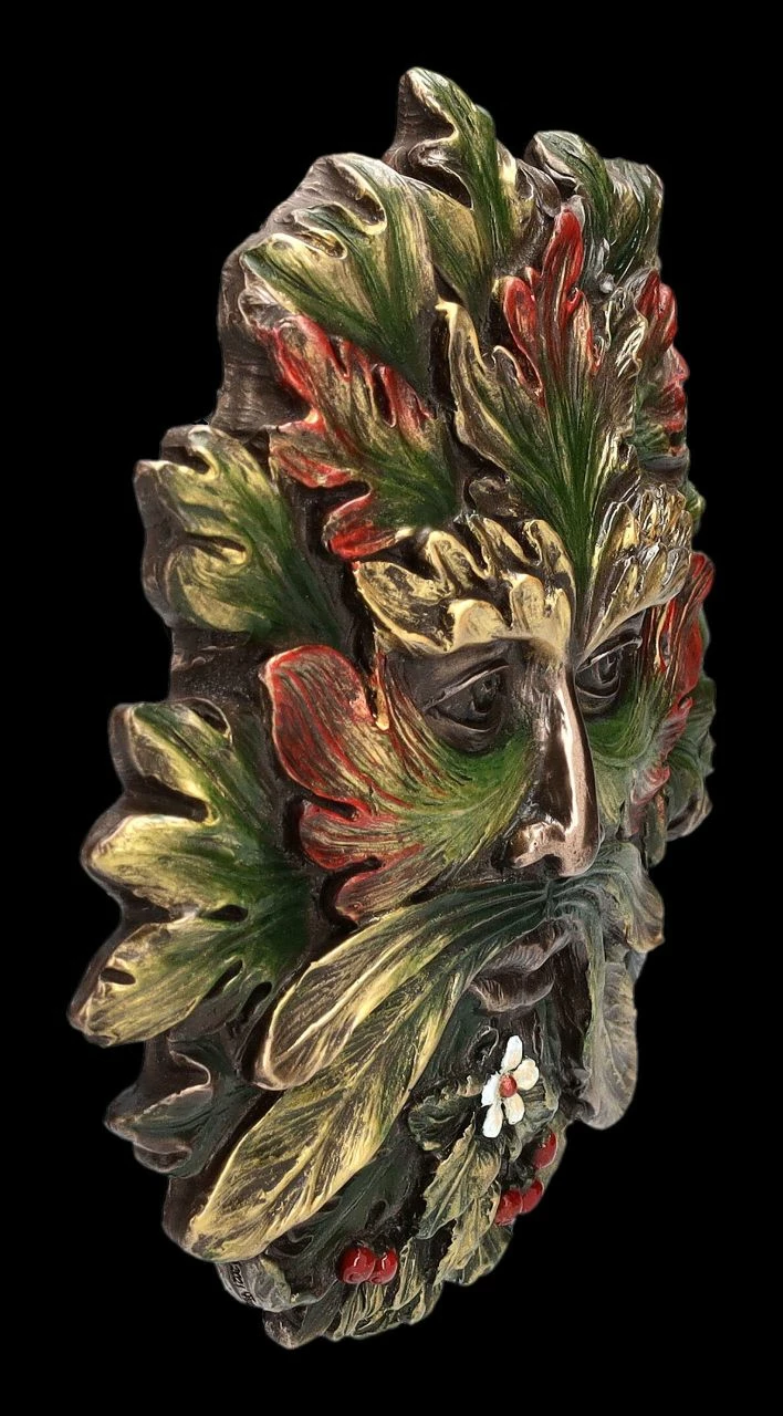 Dieses wunderbare Wandrelief aus der Studio Collection von Veronese zeigt den Greenman, umgeben von bunten Blättern, Blüten und Beeren. Als Symbol der sich immer wieder erneuernden Vegetation wurde der ‚Grüne Mann‘ schon seit Urzeiten als einer der Vegetations- oder Schöpfungsgötter so verehrt, dass er später sogar auf den Kirchen als Zierde angebracht wurde. Das 13 cm hohe, 12,5 cm breite und 2 cm tiefe Wandrelief aus edel bronziertem und schön coloriertem Kunststein (Polyresin) zeigt den Greenman als Symbol der Sommer-Sonnenwende. Gemeinsam mit den Motiven der Tag- und Nachtgleiche im Frühling, der Herbst Tagundnachtgleiche und der Winter-Sonnenwende aus unserem Shop, aber auch einzeln, ist dieses Wandrelief ein Blickfang und ein perfektes Geschenk für alle Freunde des Grünen Mannes.