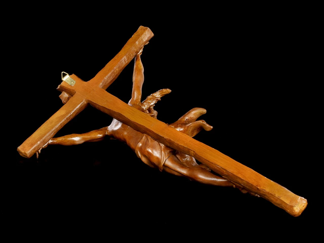 Dieses Wandrelief des Jesus am Kreuz unterstützt sanft Ihre Suche nach Ruhe und Frieden. An der Wand wird das Kreuz zu einem Element des christlichen Glaubens. Durch die handbemalte braune Holzoptik wirkt das Kruzifix aus Kunststein (Polyresin) so eindrucksvoll, als ob es aus echtem Holz geschnitzt worden ist.
