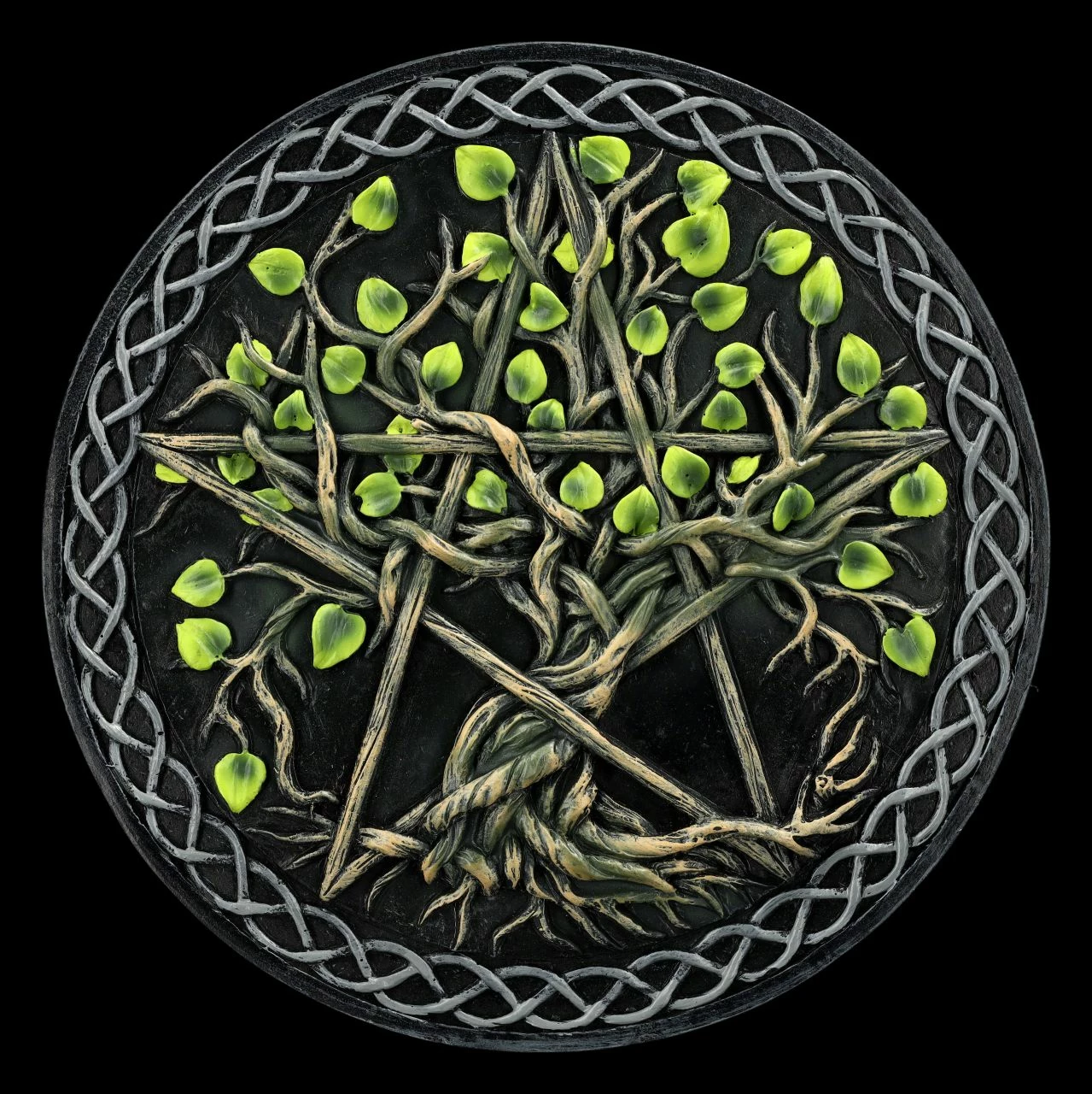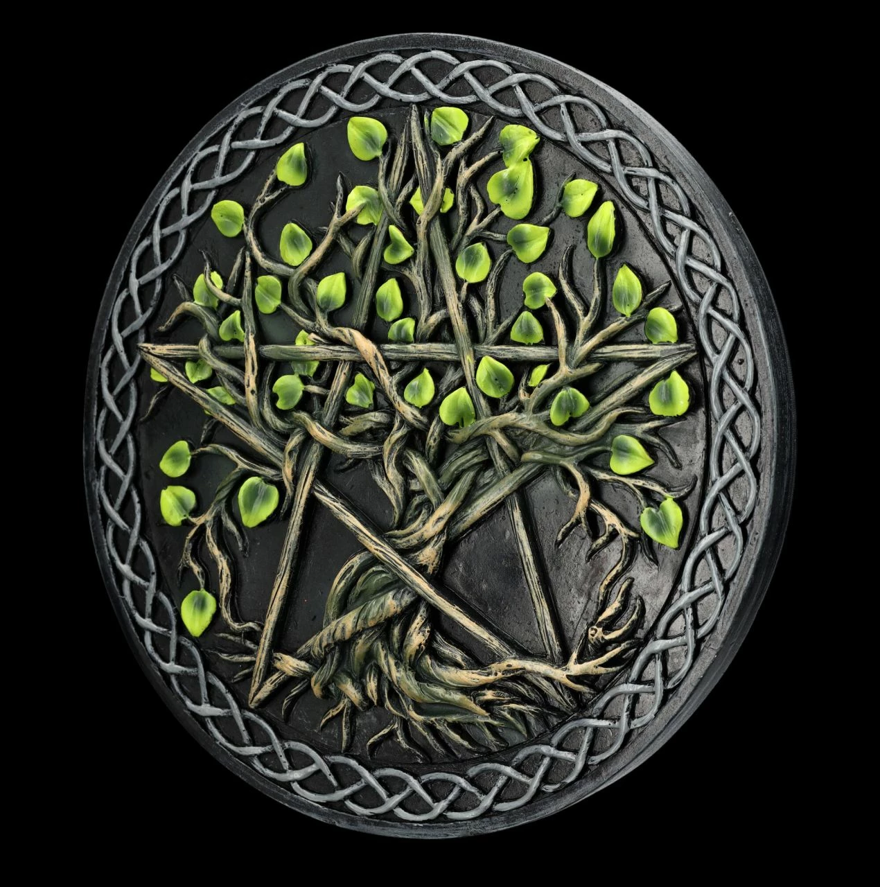 Seit uralten Zeiten scheinen dieses Pentagramm als eines der mĂ€chtigsten Schutzsymbole und der Lebensbaum, der fĂŒr Entwicklung, Wachstum, Fruchtbarkeit, Unsterblichkeit und Heilung steht, untrennbar miteinander verbunden zu sein. Die Ăste und Zweige des Lebensbaumes haben sich durch das GerĂŒst des Pentagramms gewunden und haben es integriert. Das mit einem keltischen Band umrandete Wandrelief mit dem Durchmesser von 19,5 cm und der Tiefe von 1,5 cm wurde sorgfĂ€ltig aus handbemaltem Kunststein (Polyresin) gefertigt. Das fantastische Wandrelief mit dem magischen und spirituellen Symbol zum HĂ€ngen ist nicht nur eine faszinierende Deko, sondern auch ein wunderbares Geschenk fĂŒr einen lieben Menschen..