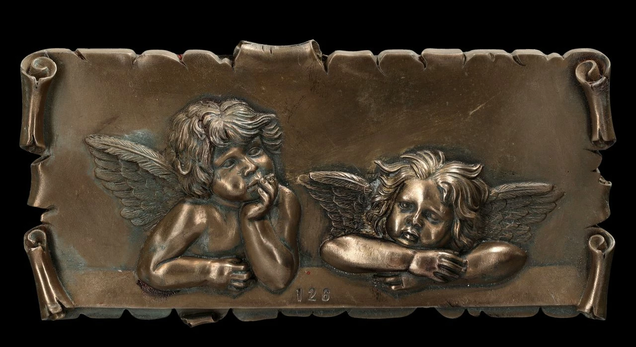 Jeder kennt dieses Motiv. Aber auf diesem Wandrelief zeigt es auch, dass Engel für jeden da sind. Das wie eine Schriftrolle geformte Wandrelief mit den nachdenklichen Putten ist 9,5 cm hoch, 19 cm breit und 2 cm tief. Es wurde aus bronziertem Kunststein (Polyresin) gefertigt und ist auch ein wunderbares und beschützendes kleines Geschenk.