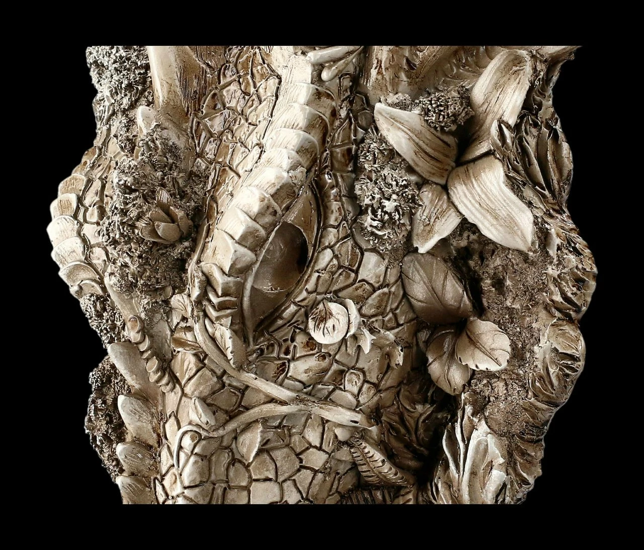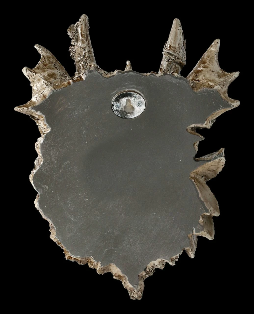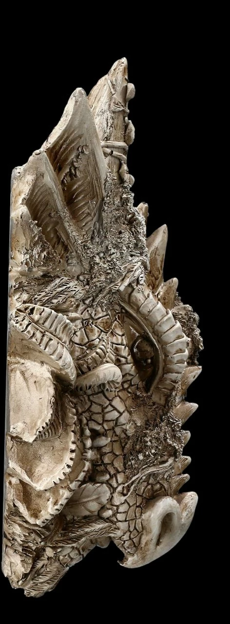Das fantastische Wandrelief zeigt den Kopf eines Drachens aus dem mystischen Waldland. Der außergewöhnliche Drachenkopf ist sehr detailreich aus Kunststein (Polyresin) gefertigt und sorgfältig handbemalt. Dieser schöne Drachenkopf mit der Höhe von 22 cm, der Breite von 17 cm und der Tiefe von 8,5 cm ist eine fantasievolle Dekoration für die Wand und sollte am besten da aufgehängt werden, wo er sofort entdeckt werden kann.