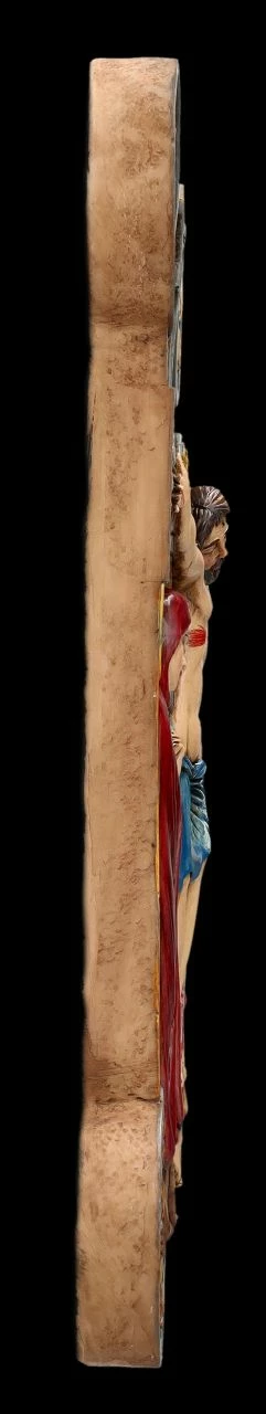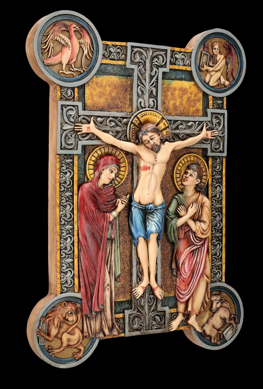 Beinahe wie eine Ikone wirkt dieses prächtige Wandrelief mit Jesus am Weingarten Kruzifix. Zu Füßen des Kreuzes stehen Maria und einer der Apostel (lt. Bibel Apostel Johannes). An den vier Ecken des schönen Wandreliefs sind in runden Medaillons vier Symbole für vier Evangelisten zu sehen: Der Adler für Johannes, der Mensch, der wegen seiner Flügel oft als Engel bezeichnet wird, steht für Matthäus, der Löwe für Markus und der Stier steht für Lukas. Das herrliche, 31 cm hohe, 22 cm breite und 2 cm tiefe Wandrelief aus sorgsam handbemaltem Kunststein (Polyresin) wird garantiert überall zu einem ganz besonderen Blickfang. Auf der Rückseite gibt es eine Möglichkeit für die Aufhängung am besten an einer Wand, an der das prachtvolle Weingarten Kruzifix mit Jesus sofort gesehen werden kann.