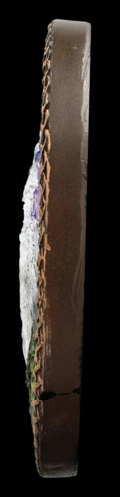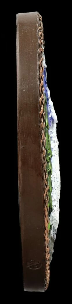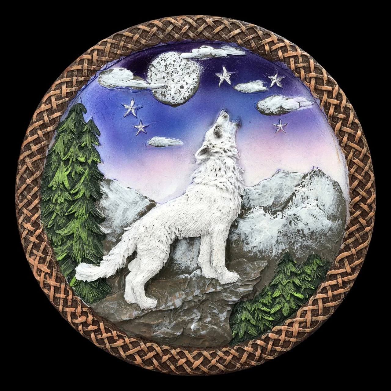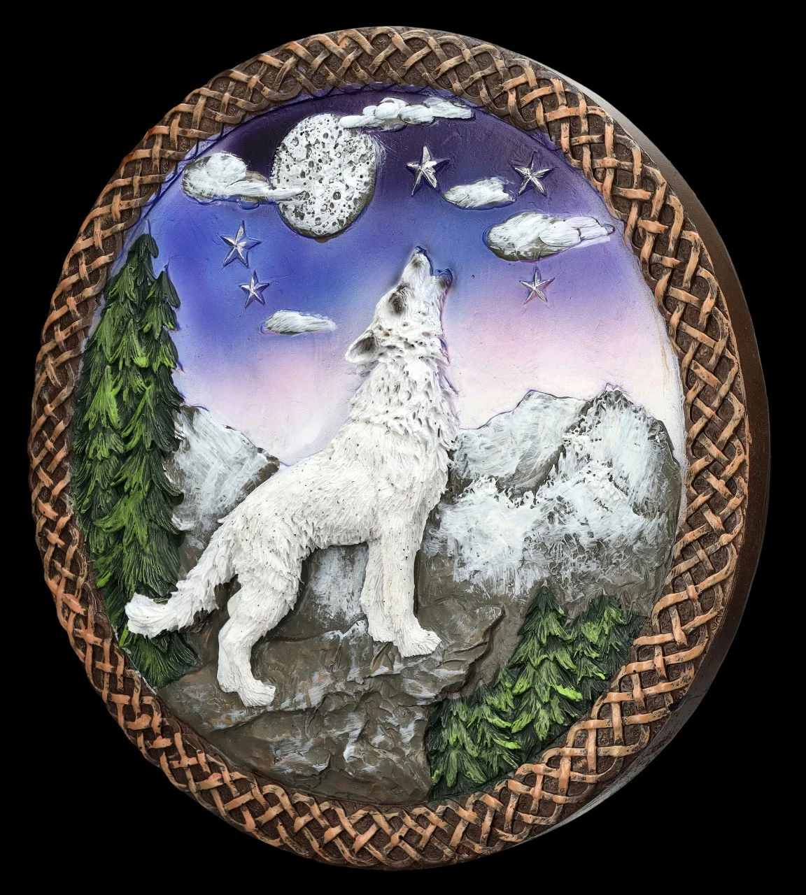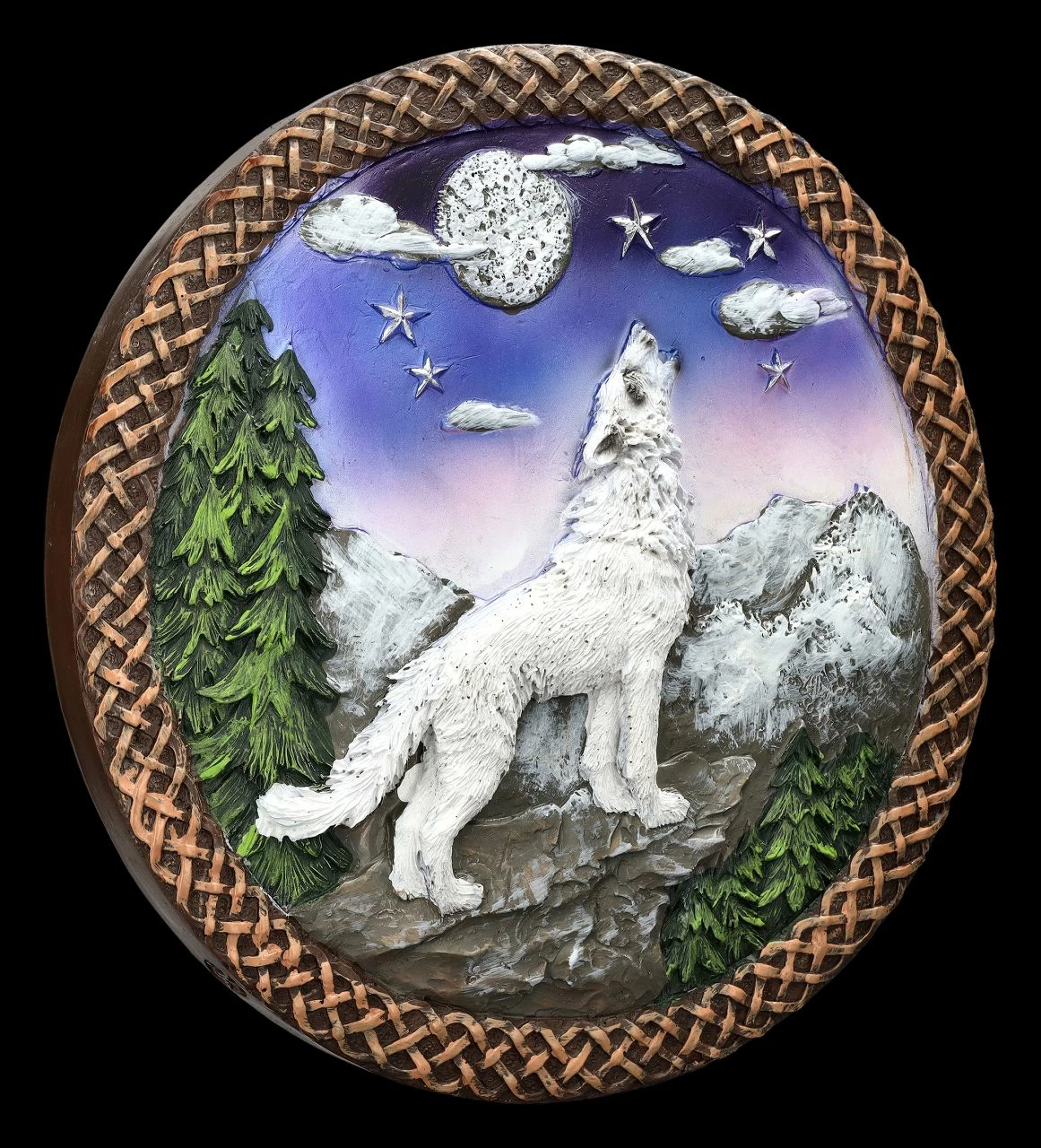 Das mit einem kupferfarbenen keltischen Band umrandete Wandrelief aus handbemaltem Kunststein (Polyresin) zeigt einen weißen Wolf, der hoch in den Bergen auf einem Felsen steht und den Mond anheult, der hinter Wolken am abendlichen Himmel zu sehen ist. Das fantastische Wandrelief mit dem Durchmesser von 19,5 cm und der Tiefe von 1,5 cm ist zum Hängen. Für jeden Wolf-Freund ist dieses Wandrelief mit dem weißen Wolf in den Bergen eine faszinierende Deko und ein tolles Geschenk.