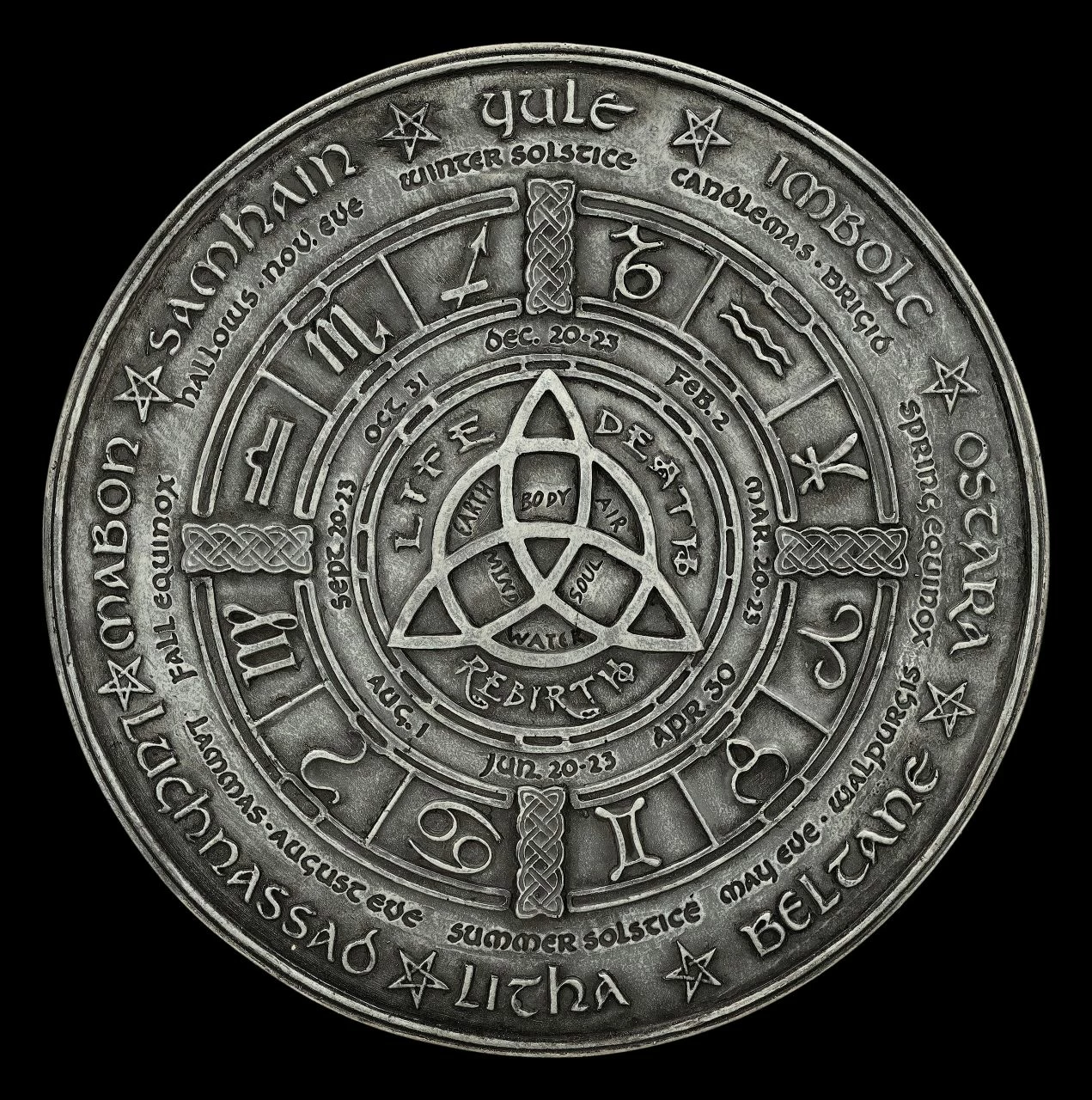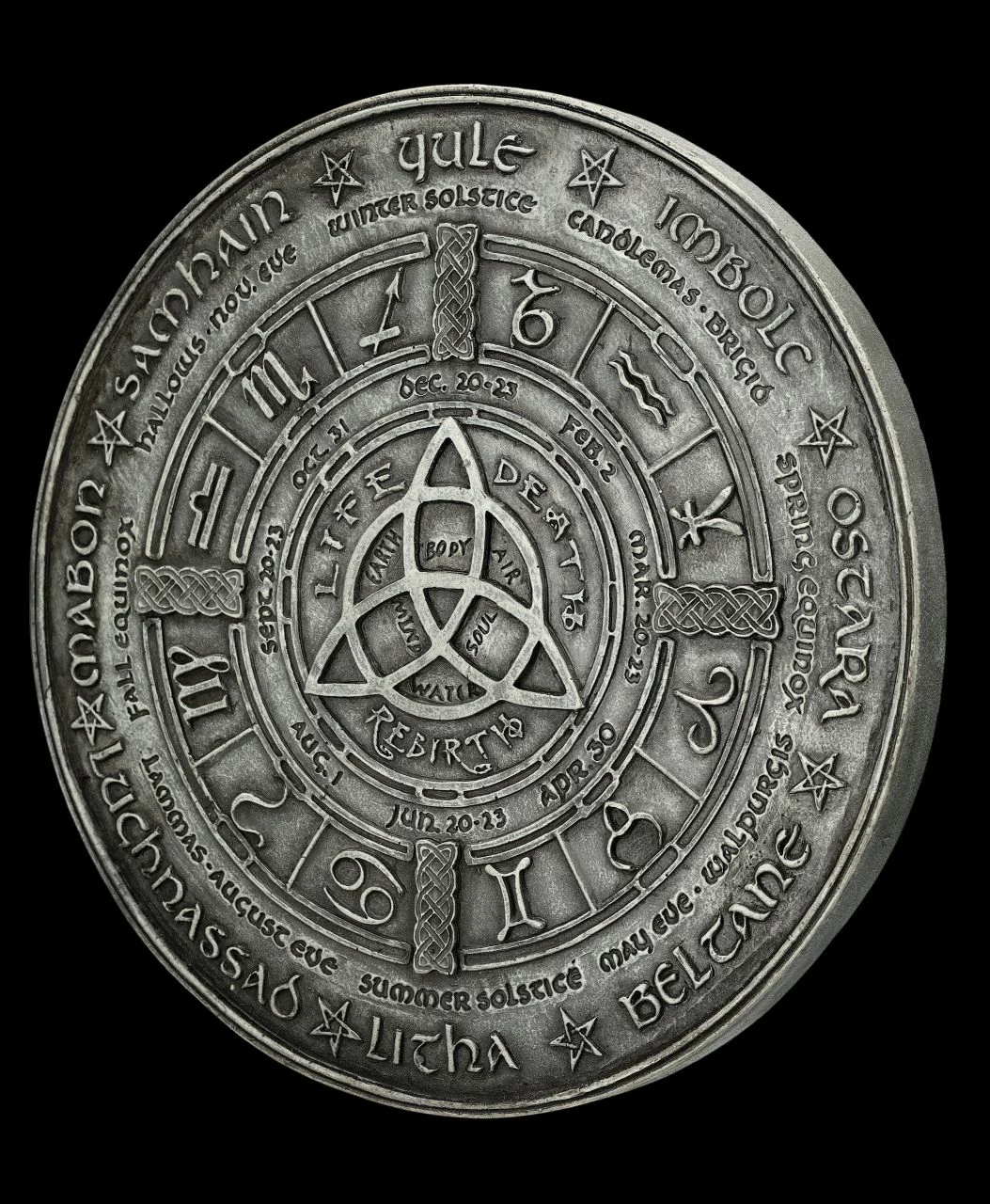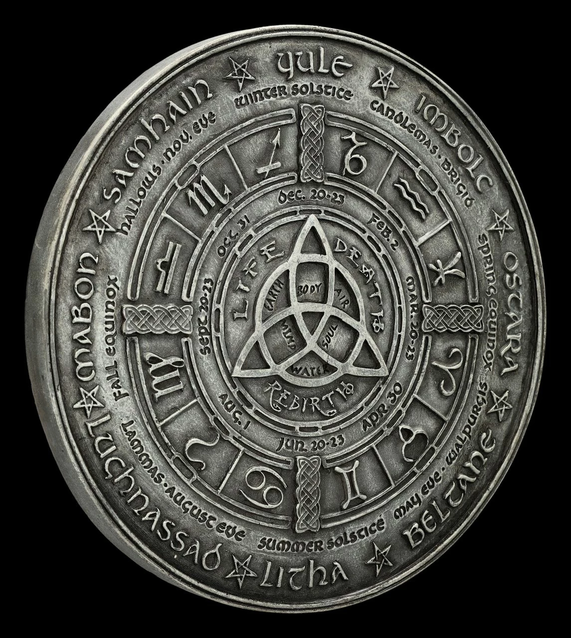 Dieses magische Wandrelief zeigt den Wicca Kalender. Am äußeren Rand sind über dem Kreis mit den Sternzeichen die acht keltischen Jahreskreisfeste eingraviert. Angefangen mit Imbolc, der Wintersonnenwende, über Ostara, Beltane, Licha, Lughnasadh bis Mabon, Samhain und Yule. Darunter in kleinerer Schrift sieht man die Feste Winter-Solstice, Brigid bis Walpurgis, Summer-Solstice, etc. Und im inneren stehen unter dem Keltischen Knoten die Worte ‚Life‘, ‚Death‘ und ‚Reburth‘ – also Leben – Tod und Wiedergefurt. Das Wandrelief mit dem magischen und spirituellen Wicca Kalender hat einen Durchmesser von 19,5 cm und der Tiefe von 1,5 cm. Es wurde sorgfältig aus handbemaltem Kunststein (Polyresin) gefertigt und ist zum Hängen.