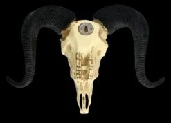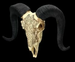 Der Widderschädel mit den prächtigen großen Hörnern zeigt am knochenfarbenen Schädel und den schwarzen Hörnern wunderbar filigrane Ornamente. Das aufwändige und kunstvolle Muster wirkt beinahe, als hätte sich ein Künstler für die Verzierung des Widderschädels viel Zeit genommen Der 19 cm hohe, 29 cm breite und 8 cm tiefe Widderschädel mit den Verzierungen wurde aus hochwertigem Kunststein (Polyresin) gefertigt und sorgfältig von Hand bemalt. Als Wandrelief zum Hängen ist er ein sofortiger Hingucker und ein absolut fantastisches Geschenk.