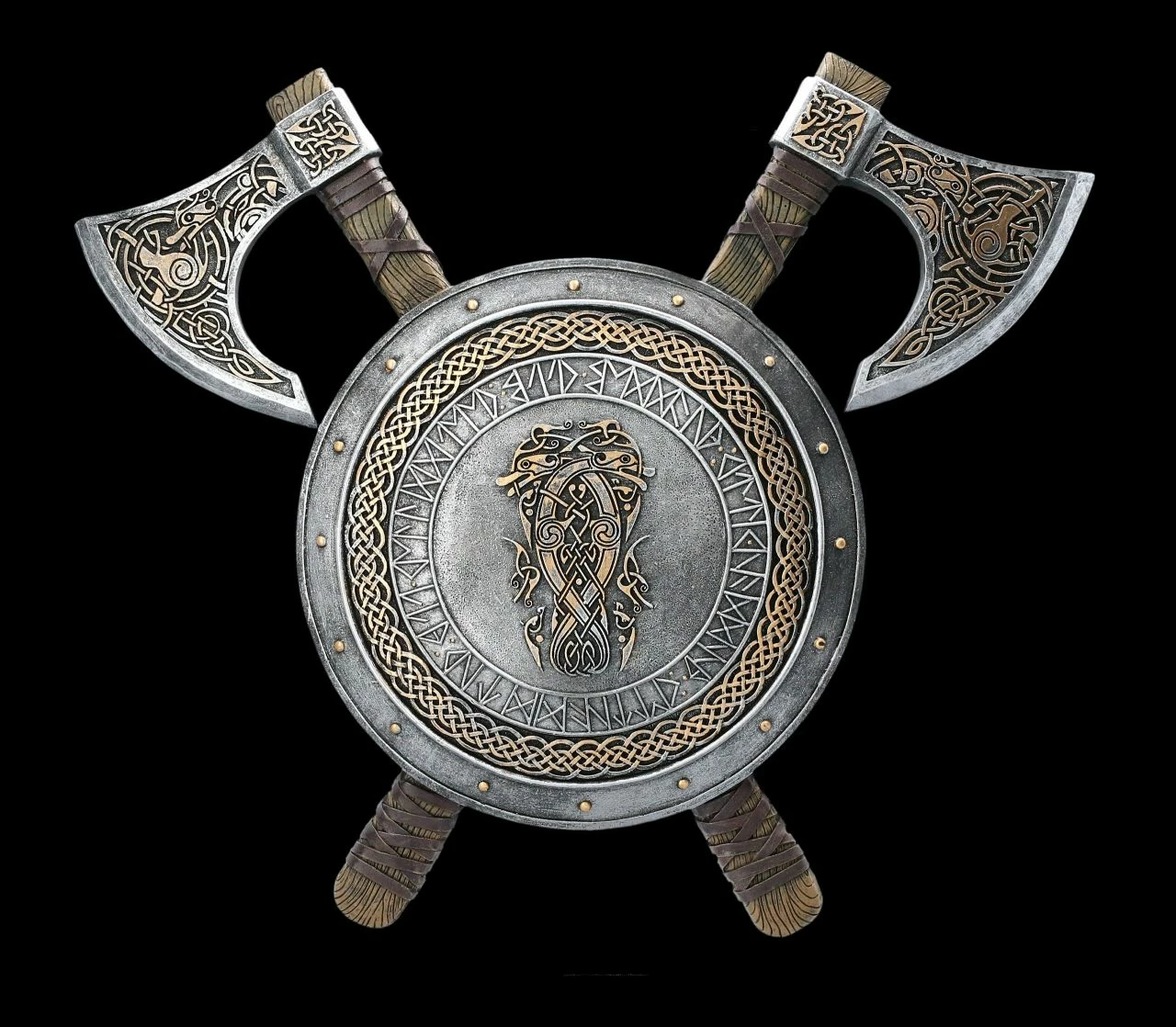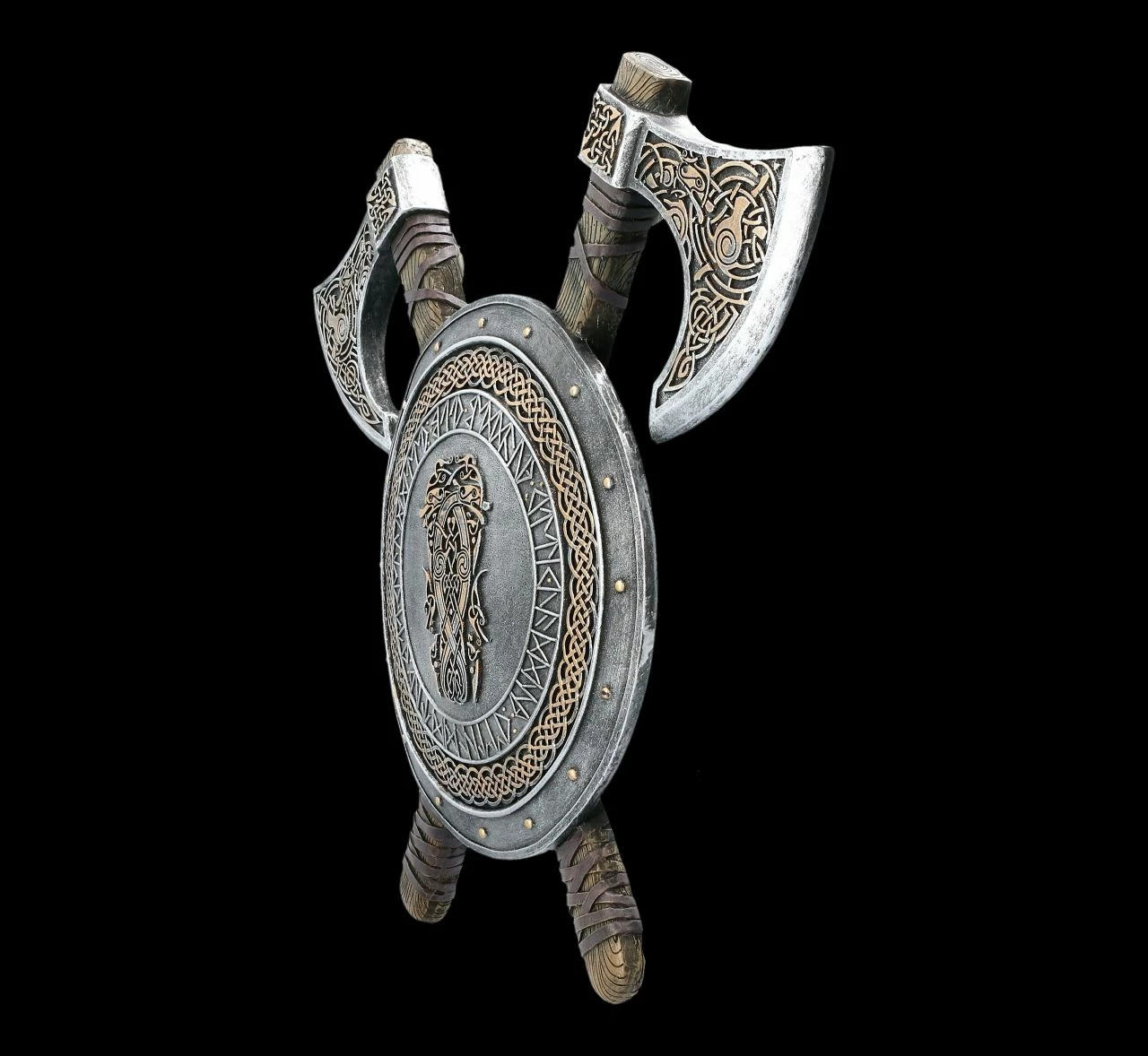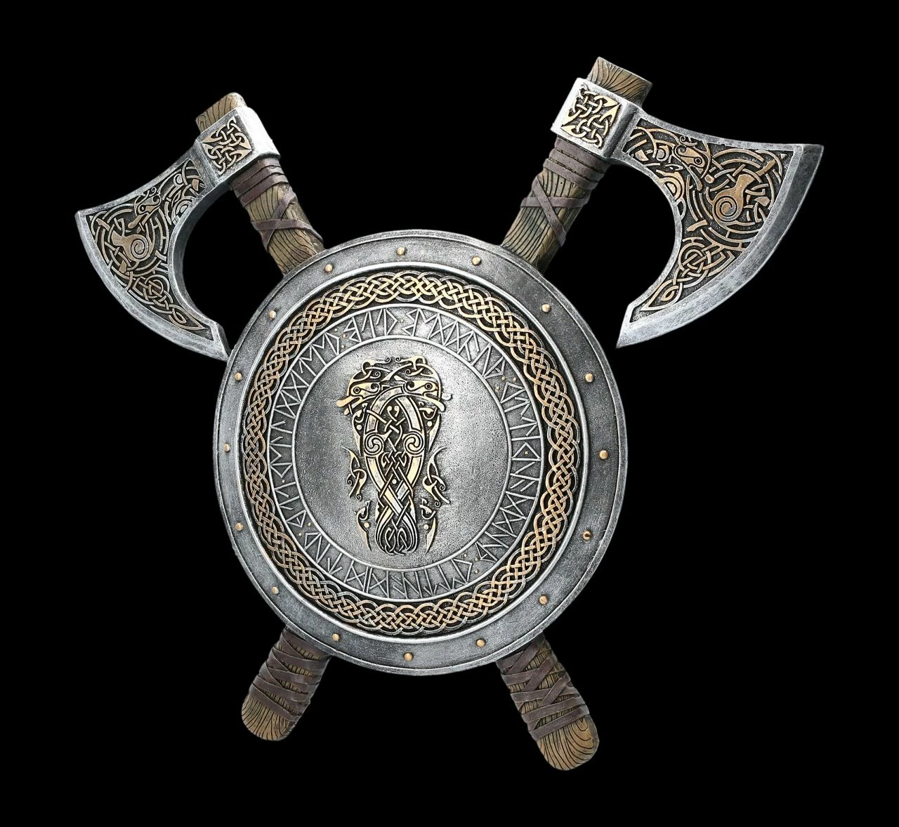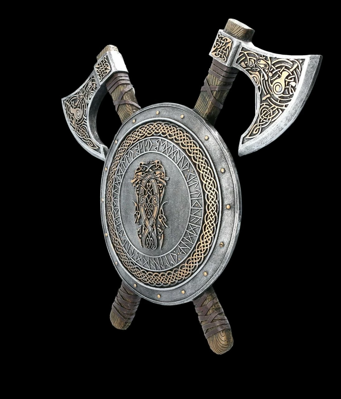Die perfekte Inszenierung für den Wohnraum eines jeden Wikingers ist dieses fantastische Wikinger Schild mit den beiden Äxten als Wandrelief. Wie aus Eisen mit Bronzebeschlägen gefertigt, hat das Wikinger Schild ein edel herausgearbeitetes Emblem mit zwei stilisierten Drachen in der Mitte und einen wunderschön verzierten Rand. Auch die beiden Äxte sind reich verziert. Das ausgefallene Wikinger Schild ist sorgsam aus handbemaltem Kunststein (Polyresin) gearbeitet. Das Wandrelief ist zum Hängen und hat eine Höhe von 44 cm, eine Breite von 52 cm und eine Tiefe von 3 cm. Das außergewöhnliche Wandrelief ist eine faszinierende Deko für jeden Wikinger.