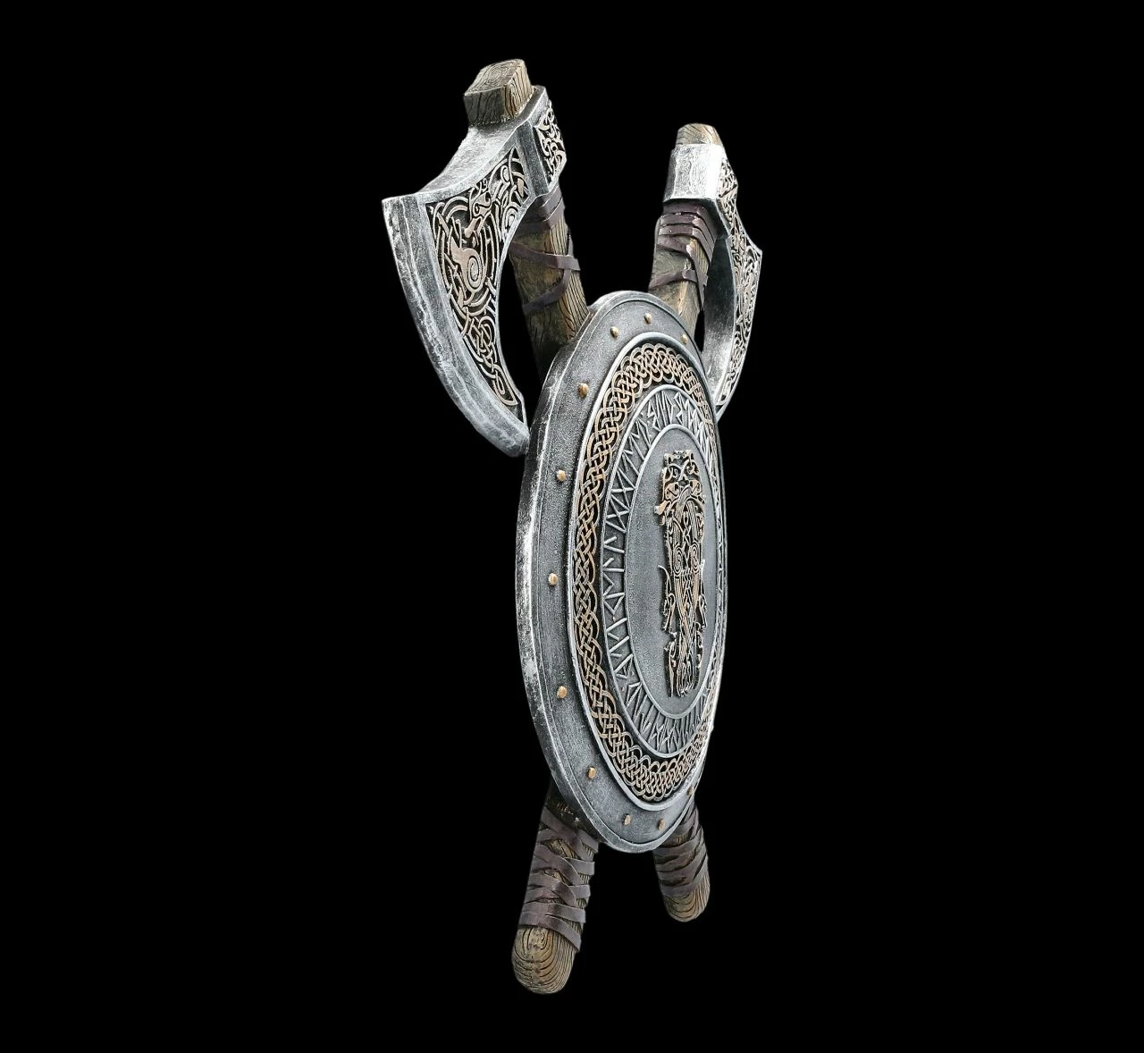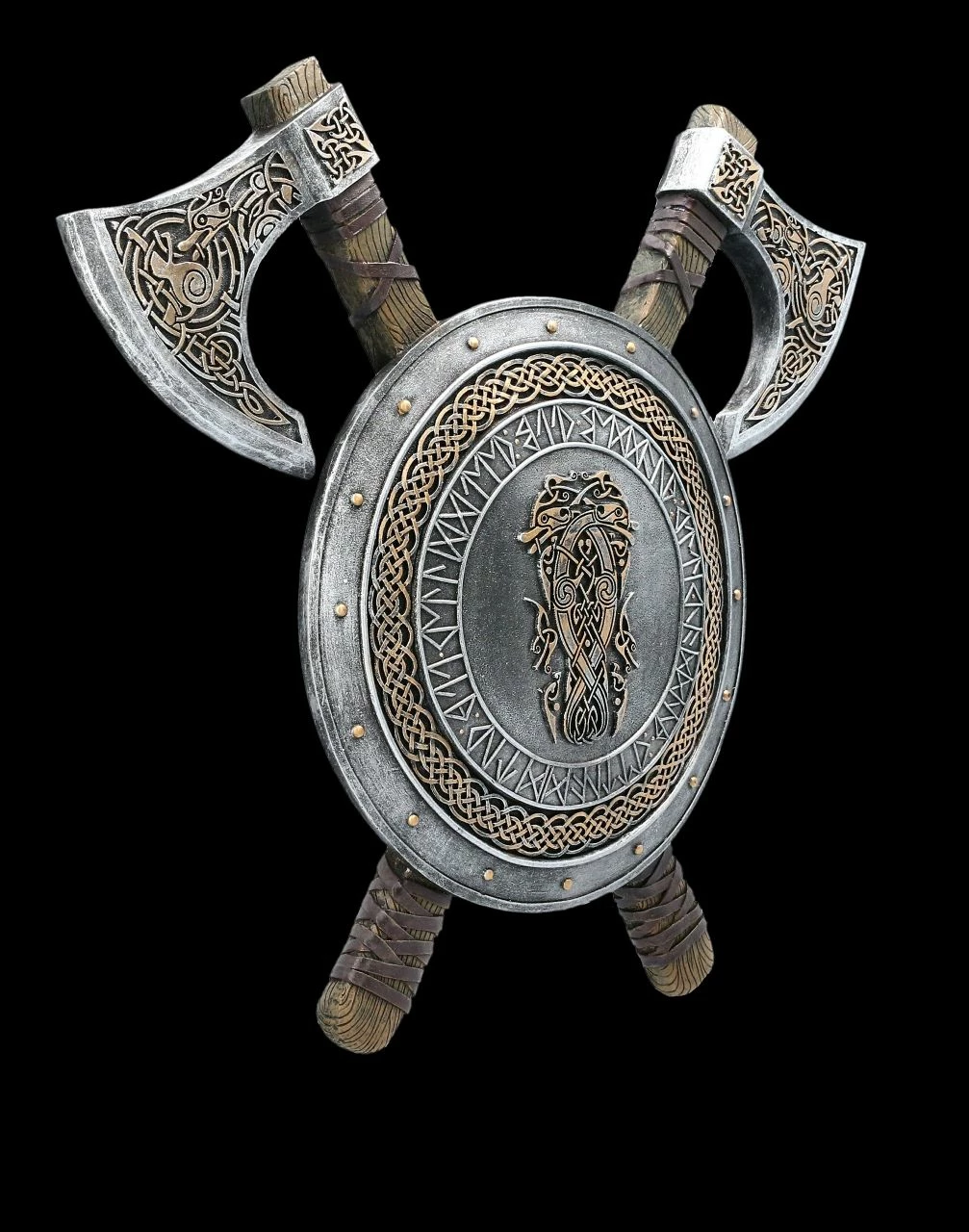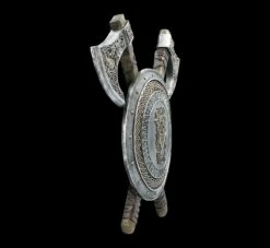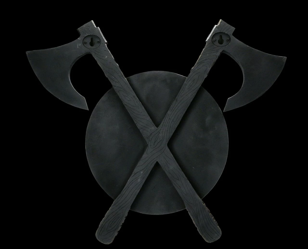 Die perfekte Inszenierung für den Wohnraum eines jeden Wikingers ist dieses fantastische Wikinger Schild mit den beiden Äxten als Wandrelief. Wie aus Eisen mit Bronzebeschlägen gefertigt, hat das Wikinger Schild ein edel herausgearbeitetes Emblem mit zwei stilisierten Drachen in der Mitte und einen wunderschön verzierten Rand. Auch die beiden Äxte sind reich verziert. Das ausgefallene Wikinger Schild ist sorgsam aus handbemaltem Kunststein (Polyresin) gearbeitet. Das Wandrelief ist zum Hängen und hat eine Höhe von 44 cm, eine Breite von 52 cm und eine Tiefe von 3 cm. Das außergewöhnliche Wandrelief ist eine faszinierende Deko für jeden Wikinger.