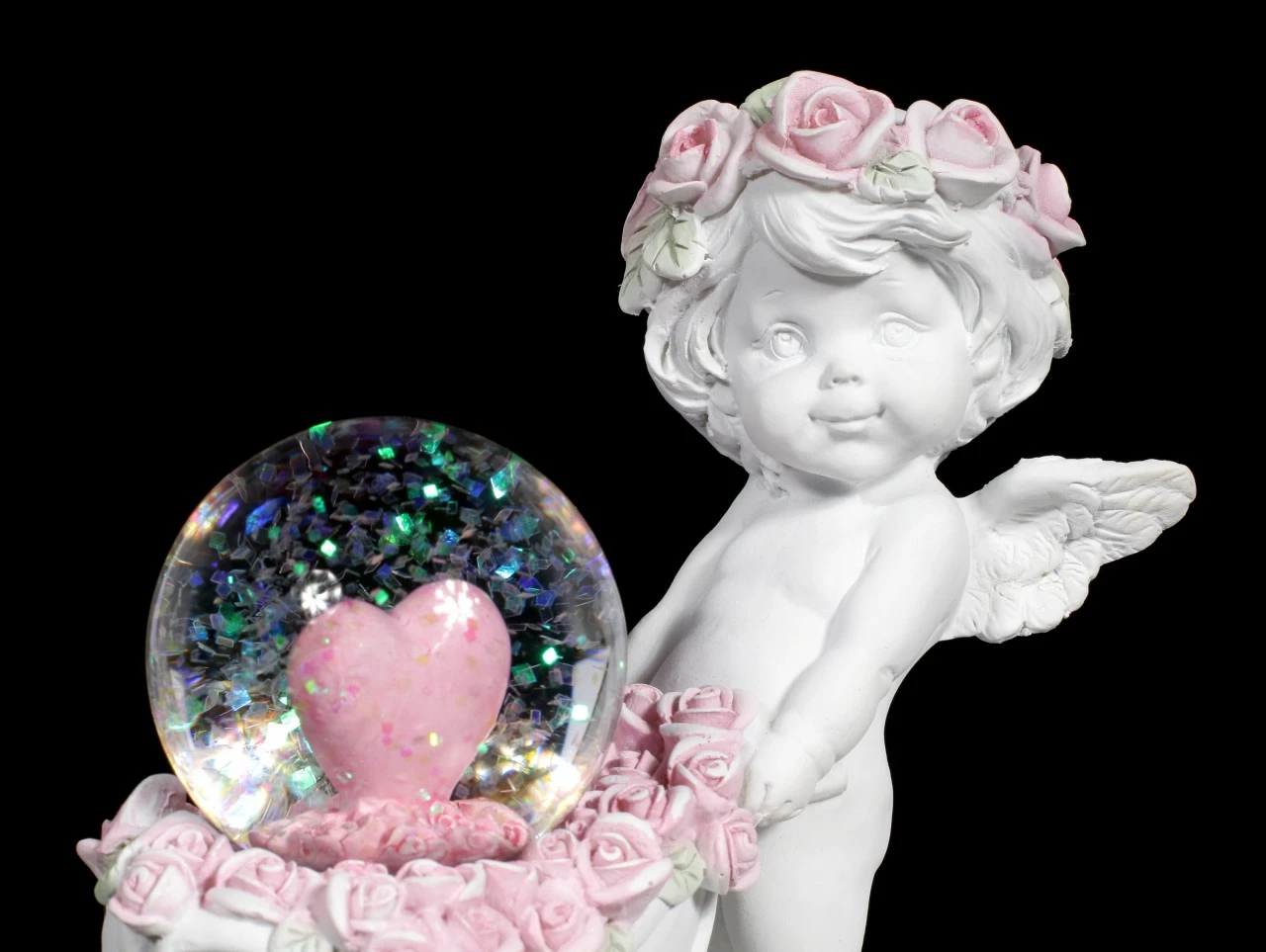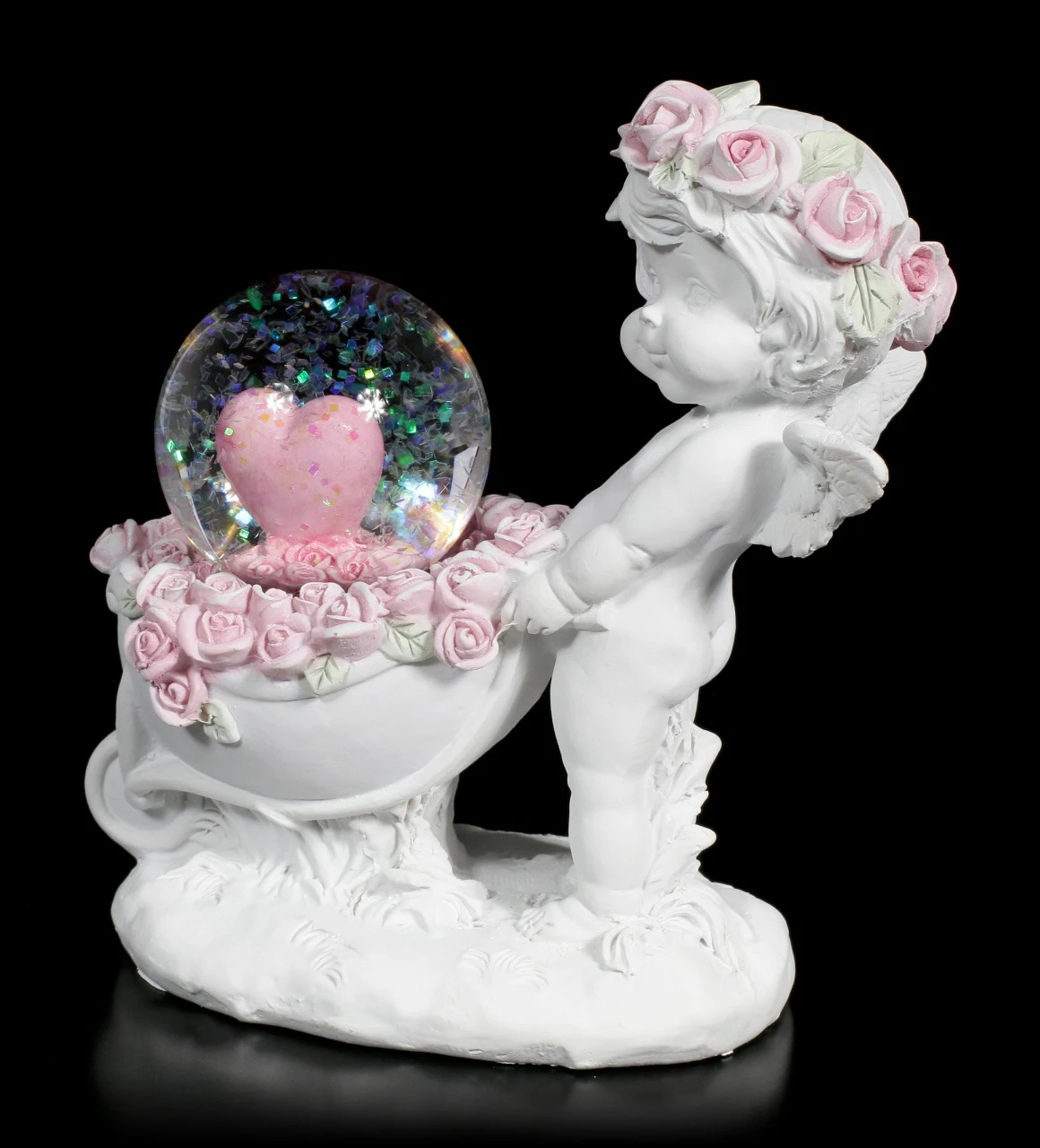 Mit einer Schubkarre bringt der niedliche Cherub Ihren besonderen Menschen viel Liebe vorbei. Die Schneekugel lässt das rote Herz glitzern.