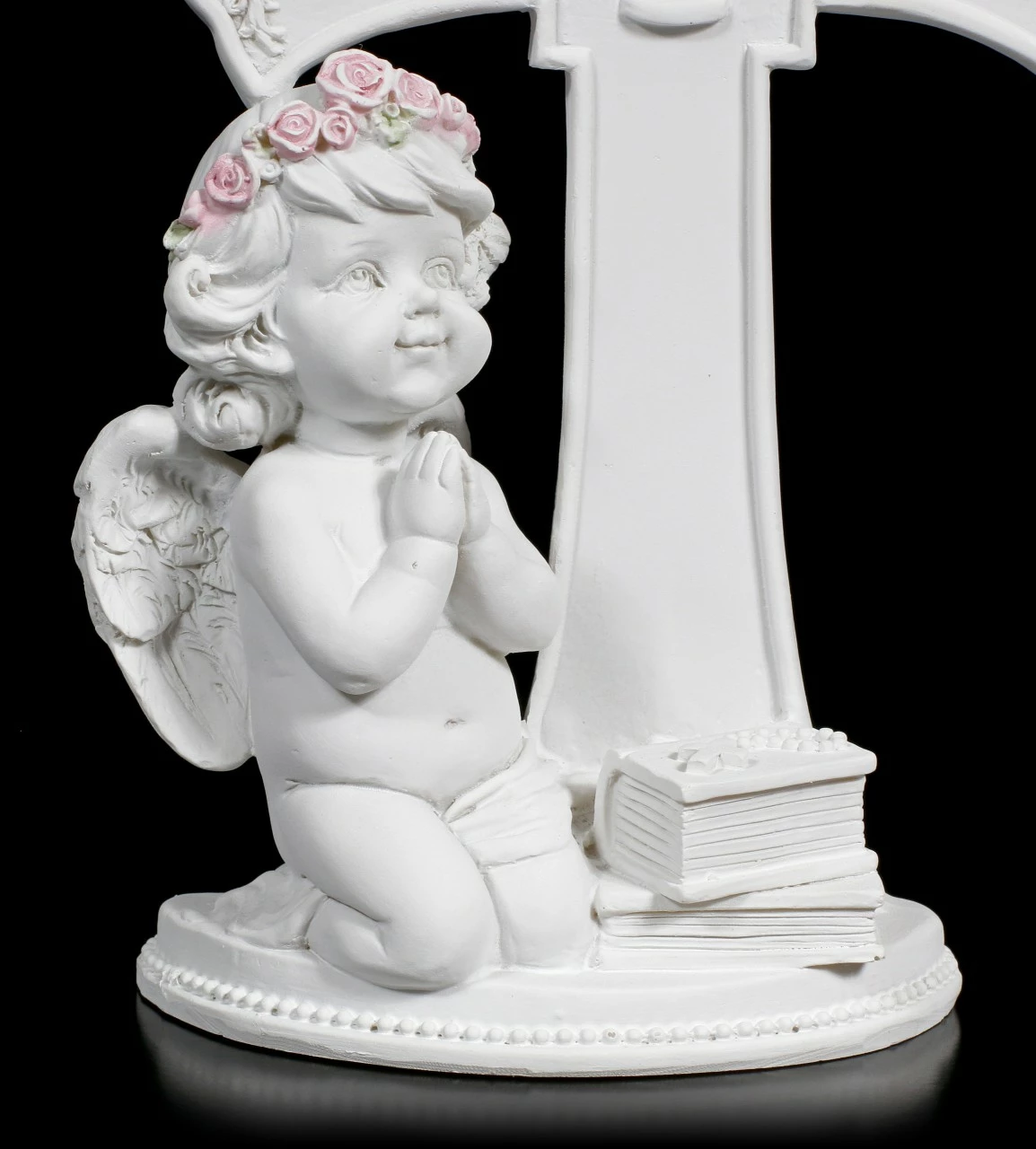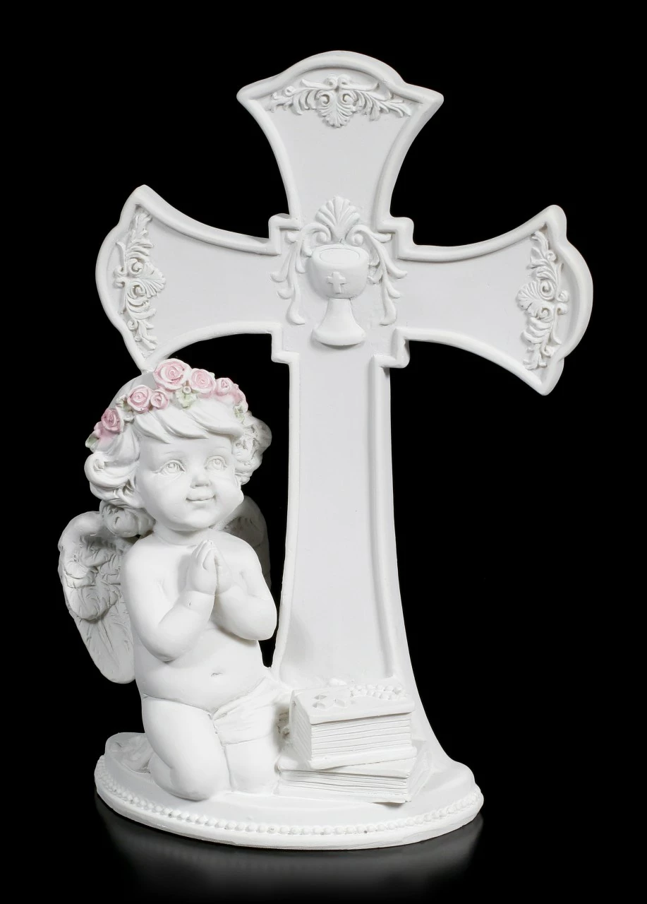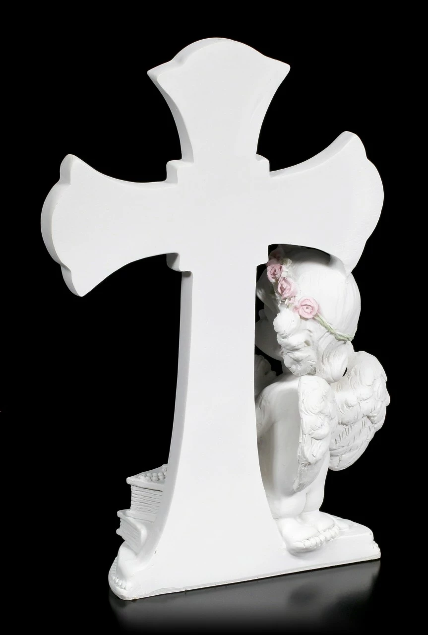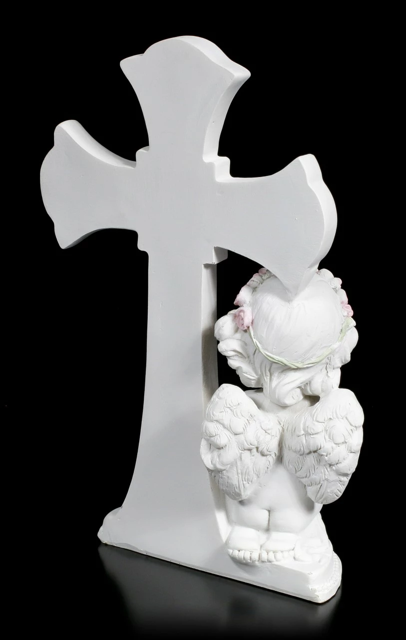 Der niedliche Cherub Engel betet vor einem schön geschmückten Kreuz und bringt Frieden in Ihre Wohnung. Der weiße Engel ist auch ein liebevolles Geschenk an einen besonderen Menschen.