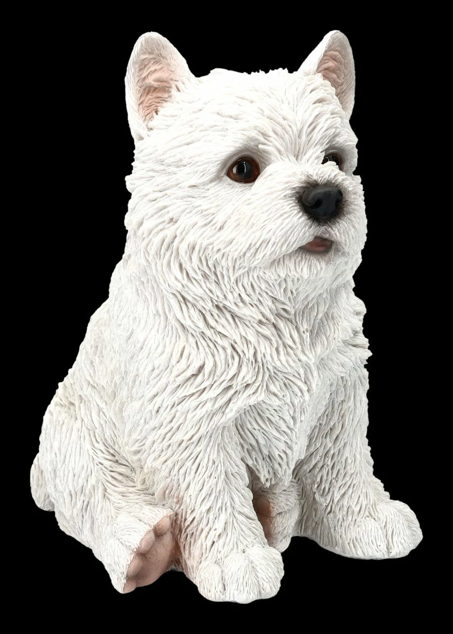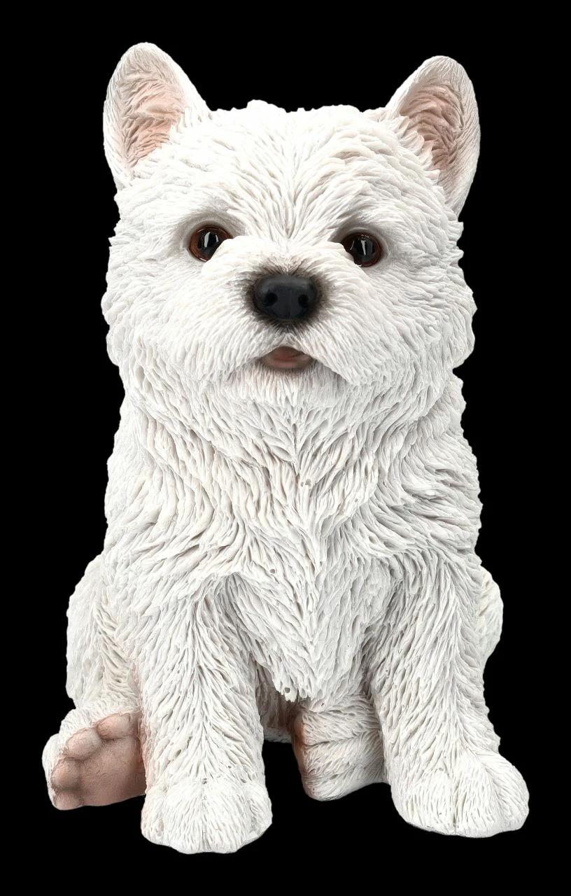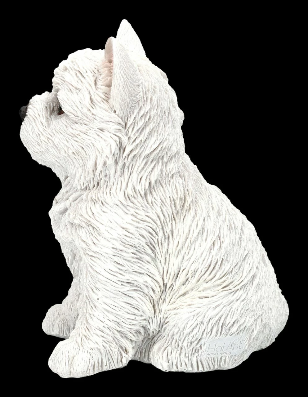 Wer kann diesem niedlichen Westie Welpen widerstehen? Der als unerschrocken und sehr aktiv bekannte West Highland Terrier zählt zu den direkten Nachfahren der alten schottischen Rasse der Jagdterrier. Die weiße Farbe wurde am Anfang als Fehler angesehen, ist aber heute das Markenzeichen der abenteuerlustigen Hunderasse. Der Westie Welpe wurde von Hotant außerordentlich realistisch und detailreich gestaltet. Die 17 cm hohe, 11,5 cm breite und 14 cm tiefe Figur eines Westie Welpen wurde aus hochwertigem Kunststein (Polyresin) gefertigt und mit viel Liebe handbemalt. Die West Highland Terrier-Figur von Hotant ist nicht nur eine tolle Deko, sie ist auch eine hochwertige und fantastische Trophäe für jeden Züchter, Verein oder Zuchtverband und natürlich auch ein perfektes Geschenk für alle Hundefreunde. Denn jagen wird dieser kleine Welpe gar nicht erst lernen….
