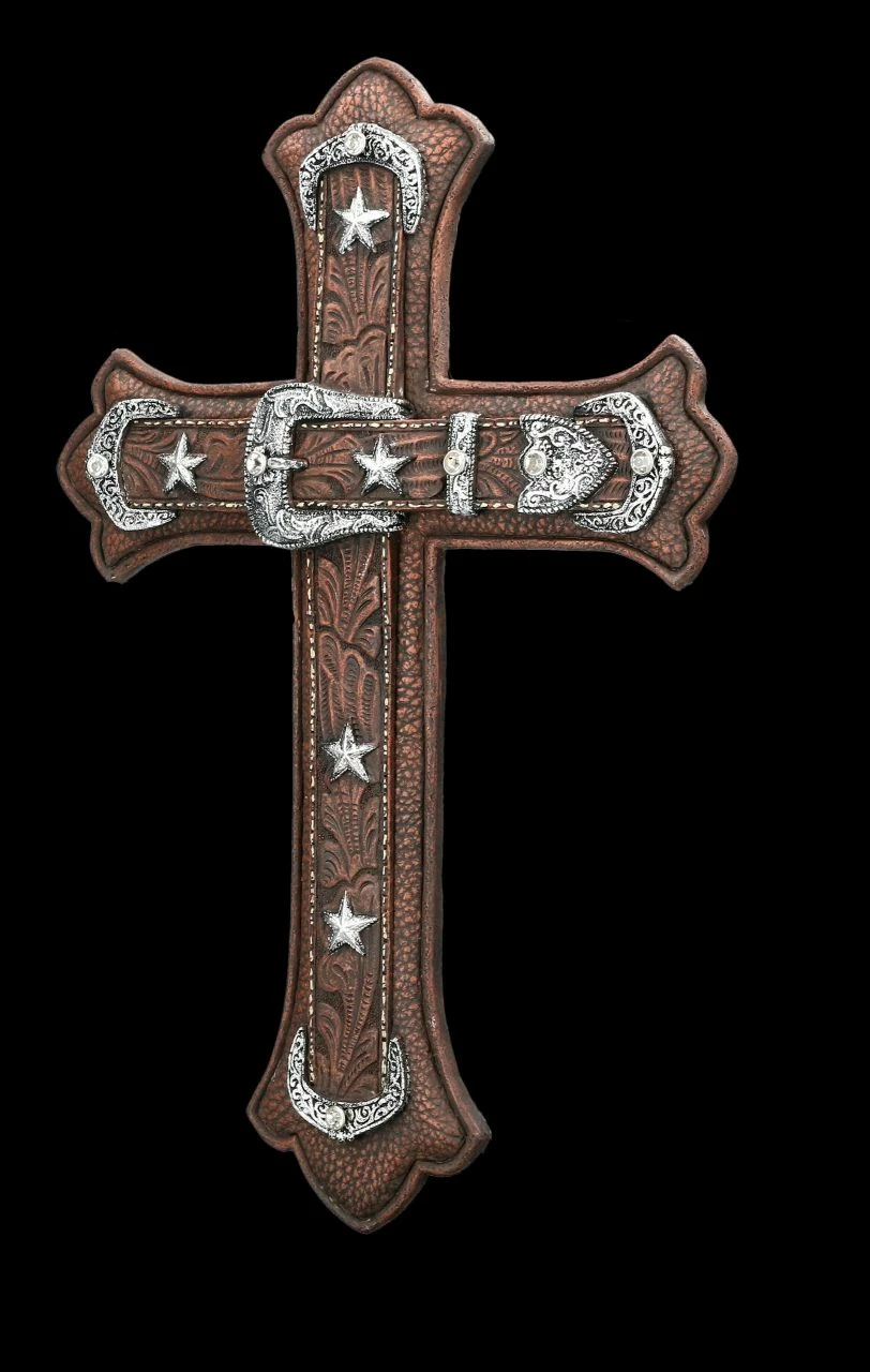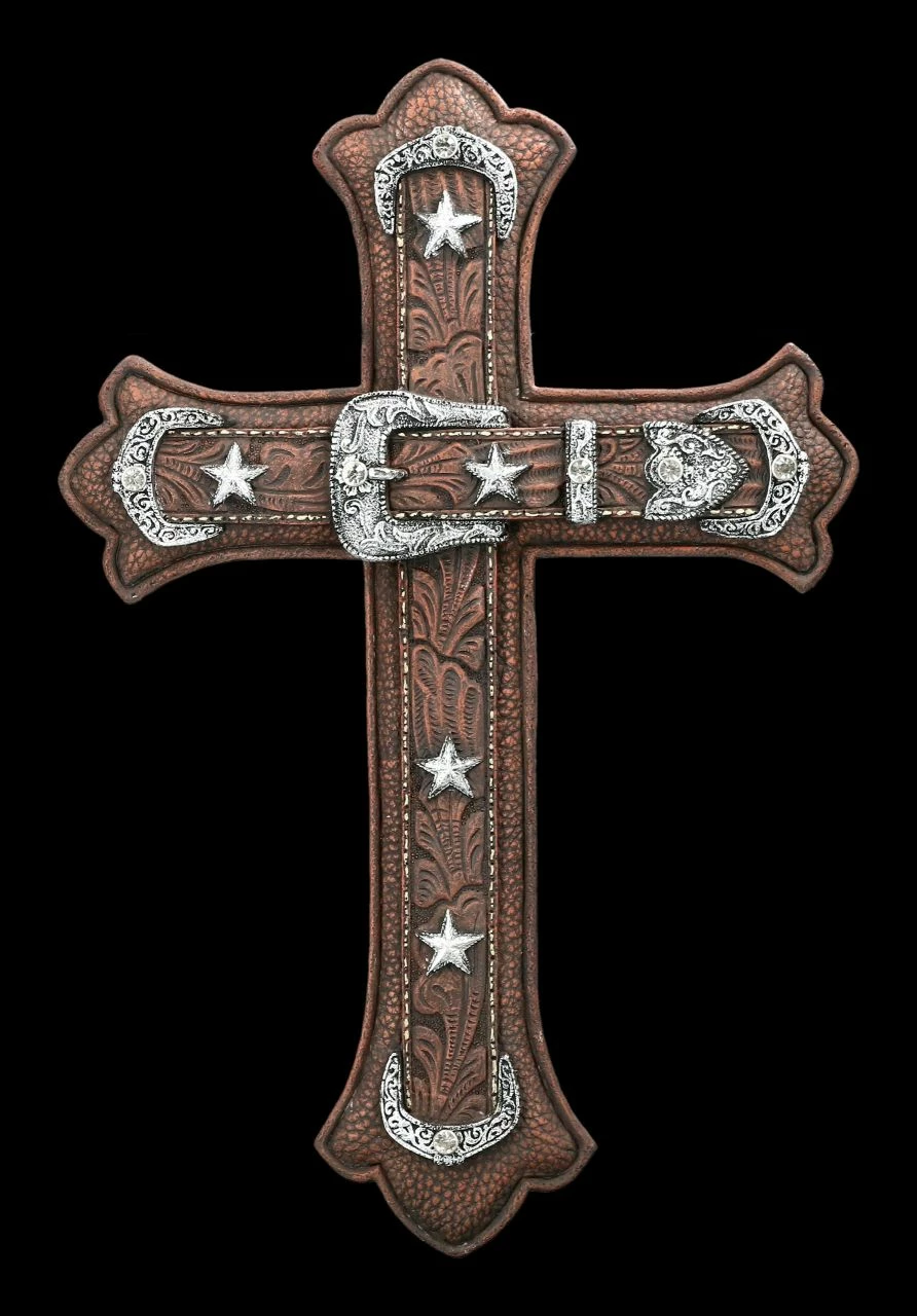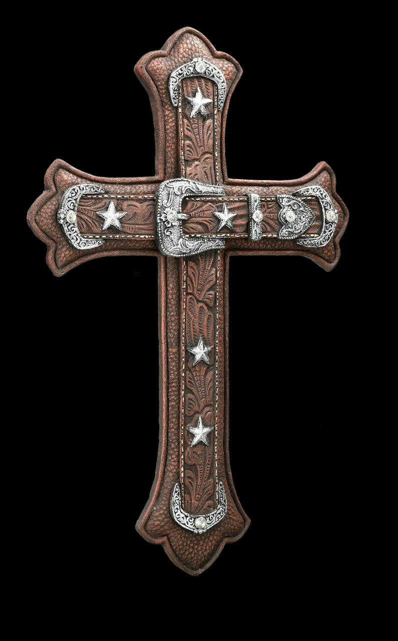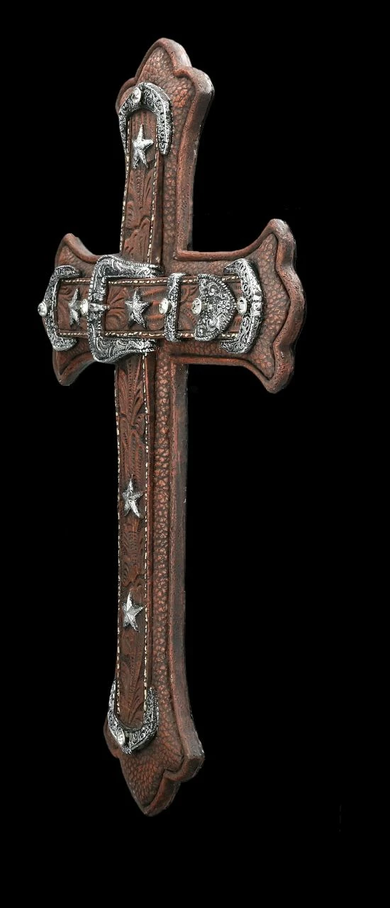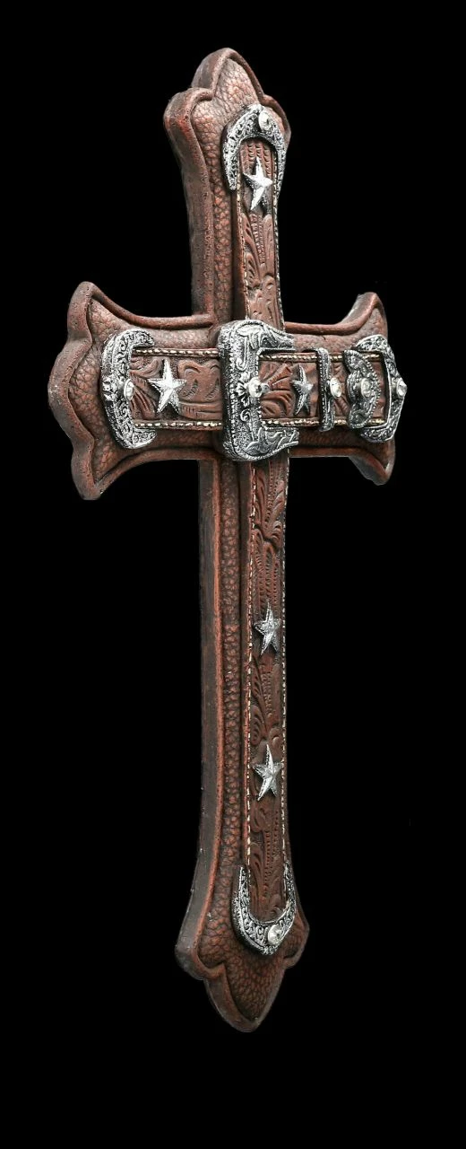 Der silberbeschlagene Gürtel war das Kennzeichen des großen Ranchers und sein ganzer Stolz. Also hat ihn seine Witwe nach seinem überraschenden Dahinscheiden als Erinnerung am Kreuz befestigen lassen. Das faszinierende Kreuz mit dem Gürtel sieht aus, als wäre es ein Fundstück aus dem Wilden Westen, so perfekt wurde es aus detailreich handbemaltem Kunststein (Polyresin) gefertigt und mit Schmucksteinen verziert. Mit der Höhe von 44 cm, der Breite von 29 cm und der Tiefe von 3,5 cm wird es an jeder Wand zum sofortigen Blickfang. Es ist aber auch das perfekte Geschenk für jemanden, der die alten Geschichten vom Wilden Westen liebt.