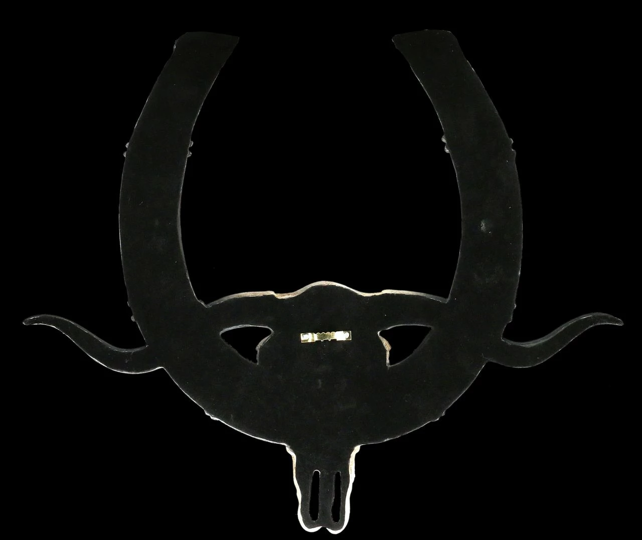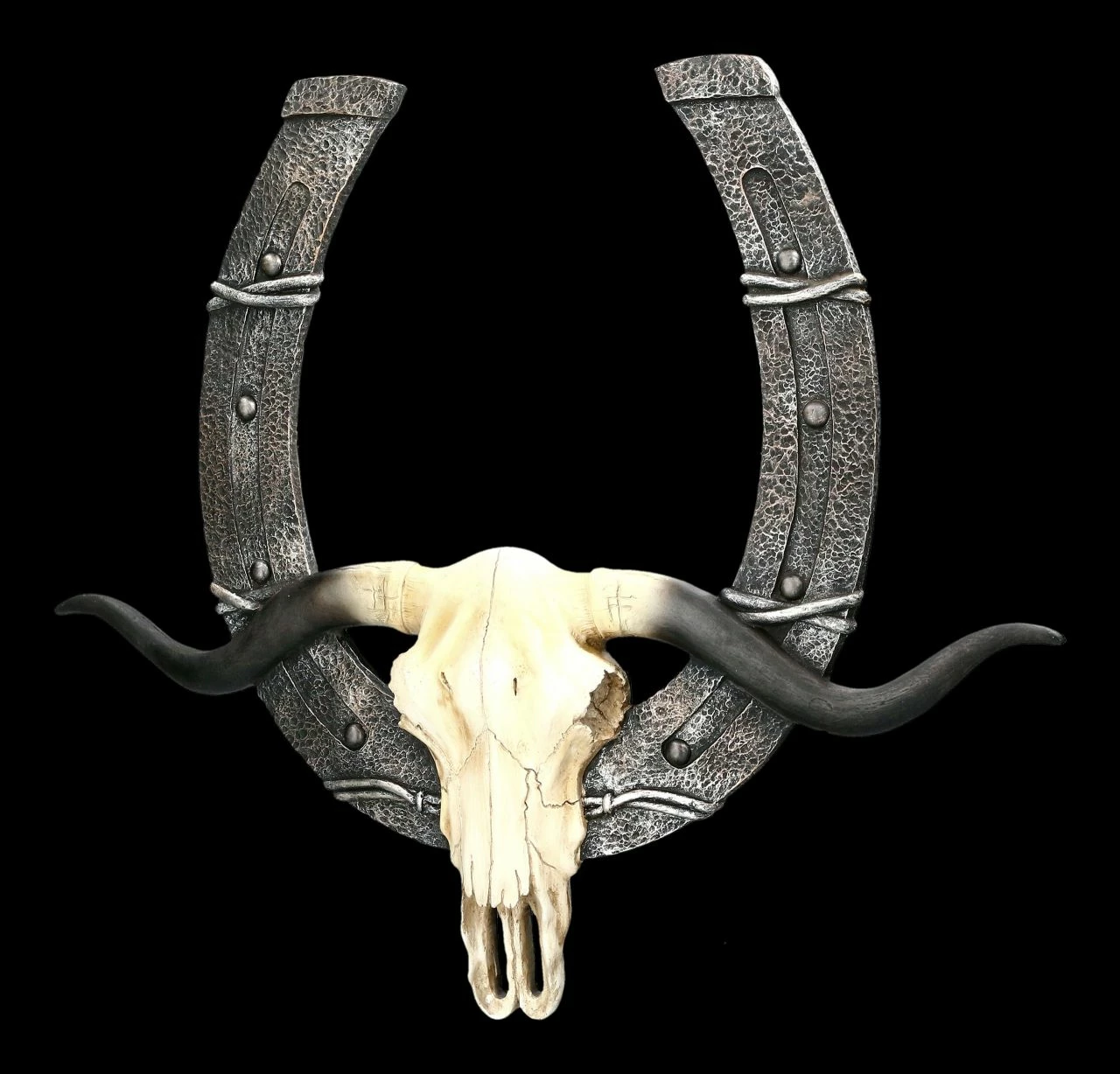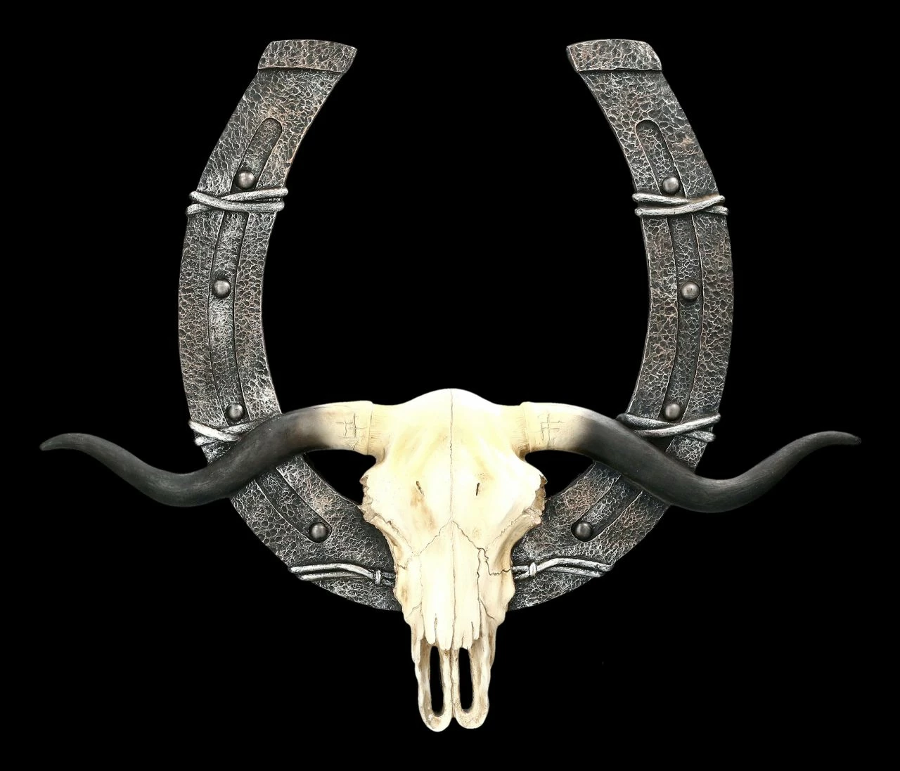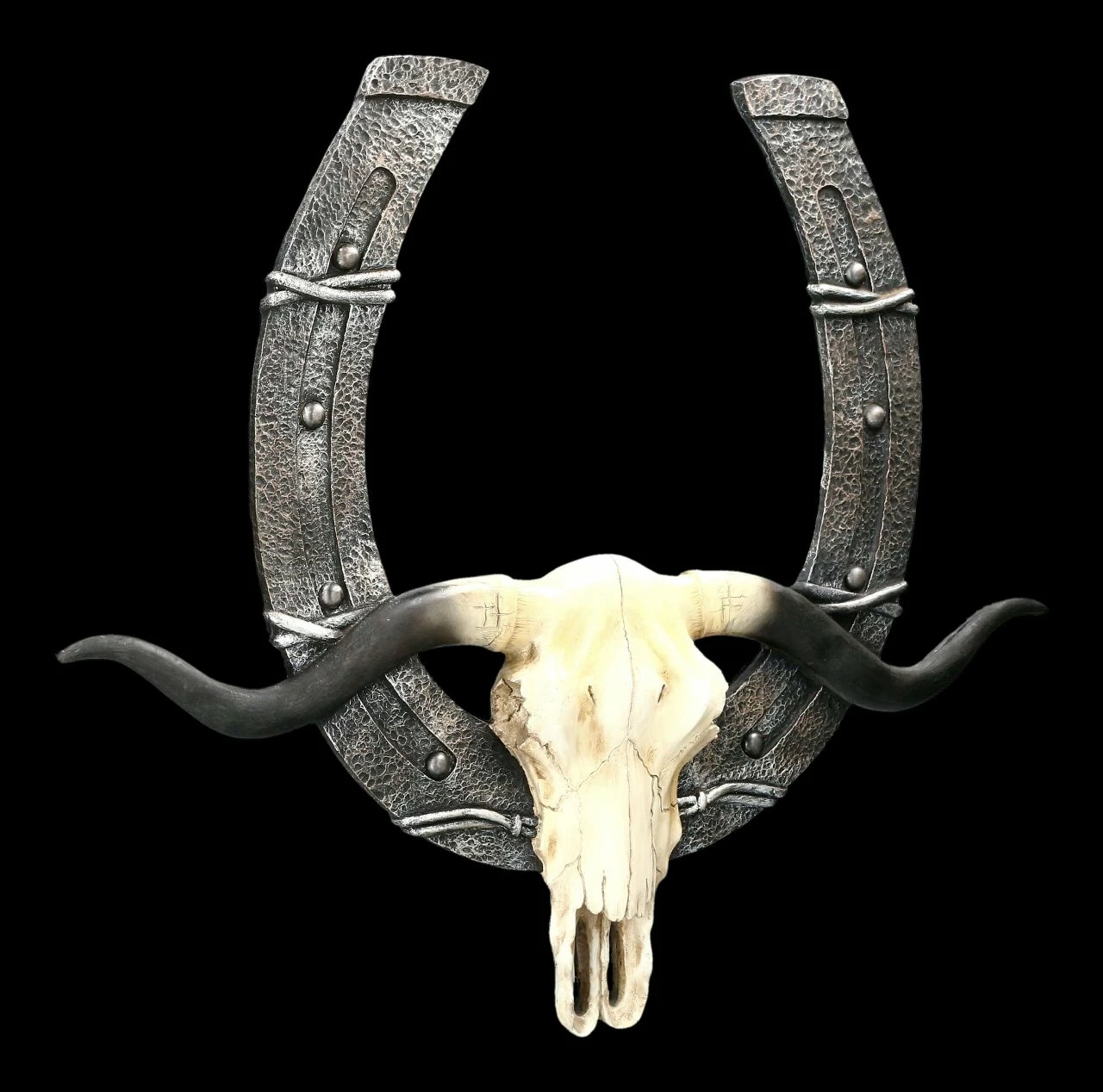 Das Hufeisen mit dem Bullenschädel sieht aus, als hätte man es einst als Kennzeichen am Hoftor zu einer Ranch mitten in der Prärie angebracht. Doch nun ist die Ranch verlassen und das Hoftor zusammengebrochen. Das Hufeisen mit dem Bullenschädel wurde unter den Trümmern gefunden und ziert nun Ihre Wand. Mit der Höhe von 44,5 cm, der Breite von 53 cm und der Tiefe von 4 cm ist die unglaublich detailreiche Wanddeko sorgsam aus handbemaltem Kunststein (Polyresin) gefertigt. Das Wandrelief ist zum Hängen und ein wunderbares Geschenk für jeden, der die Geschichten vom Wilden Westen liebt.