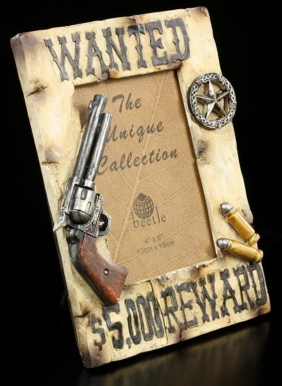 Dieser Bilderrahmen bringt den Wilden West in Ihr Zuhause. Der Bilderrahmen mit dem Bild wirkt dabei wie ein richtiger Steckbrief eines Gesuchten – natürlich mit passendem Kopfgeld. Ein Muss für jeden Wilden Westen Fan.