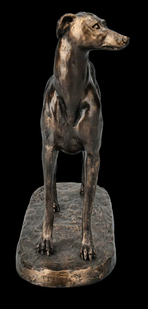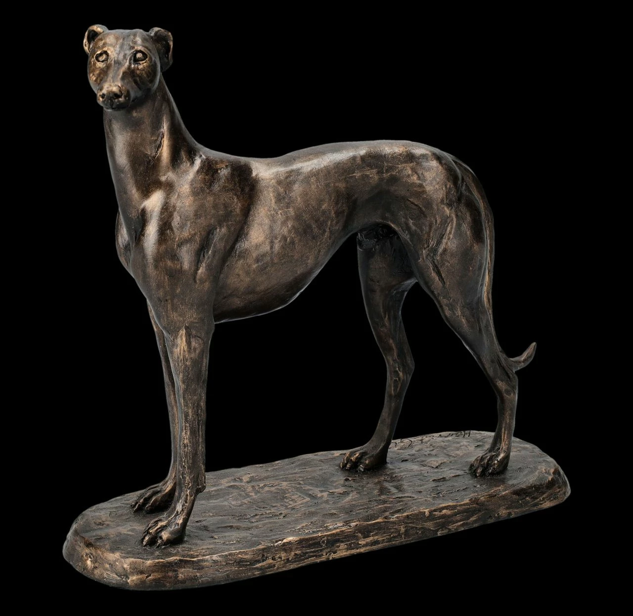 Windhund-Fans und Windhund-Züchter werden von dieser edel bronzierten Windhund-Figur aus hochwertigem Kunststein (Polyresin) als Geschenk begeistert sein. Die Künstlerin Harriet Glen fängt mit ihrer feinen Modellierung das Wesen der von ihr entworfenen Tierfiguren perfekt ein. Ob Haustiere oder die von ihr gelibeten Pferde – oder wie hier bei dem Windhund Gus – ihre gut beobachteten Darstellungen der Tiere sind bei Sammlern hoch begehrt. Die wunderbare Windhund-Figur von Gus the Greyhound ist 20 cm hoch, 20,5 cm breit und 9 cm tief und eine edle Deko für das Sideboard oder auch auf dem Schreibtisch.